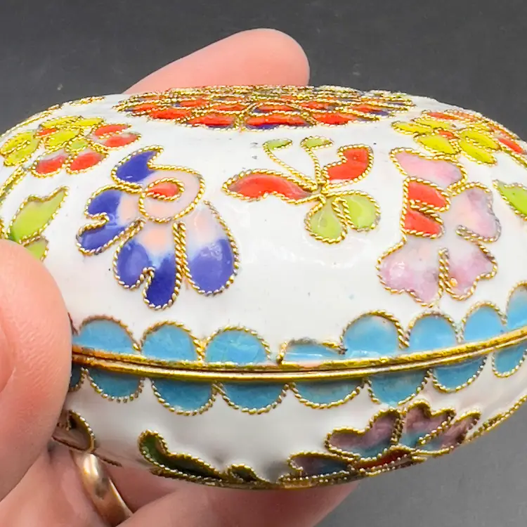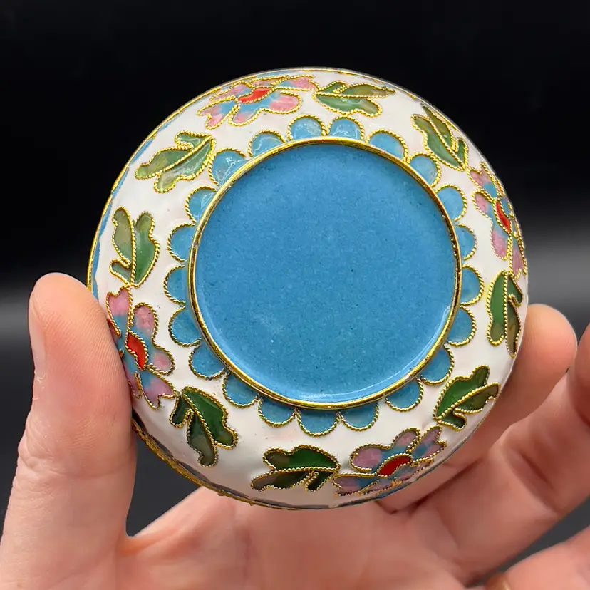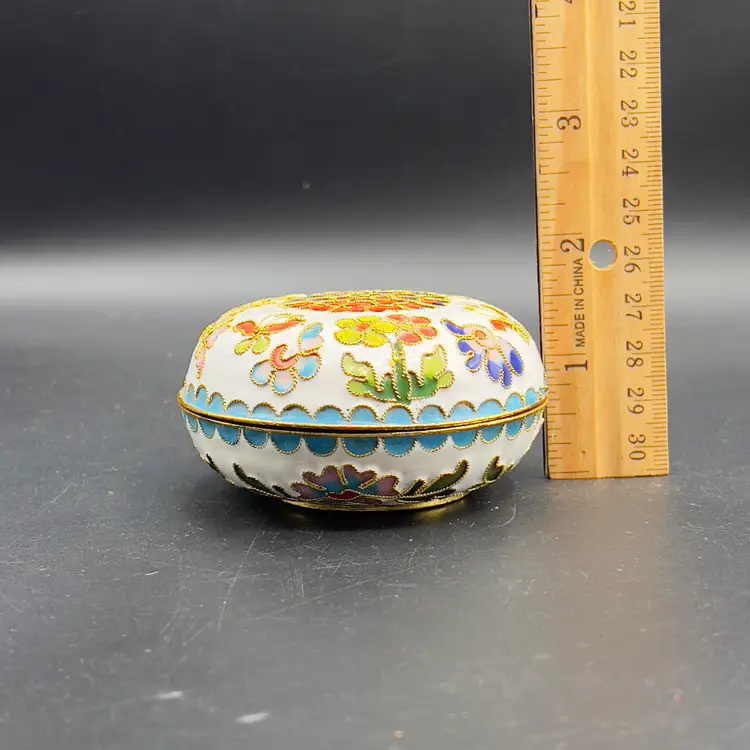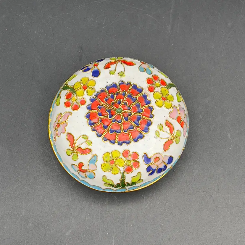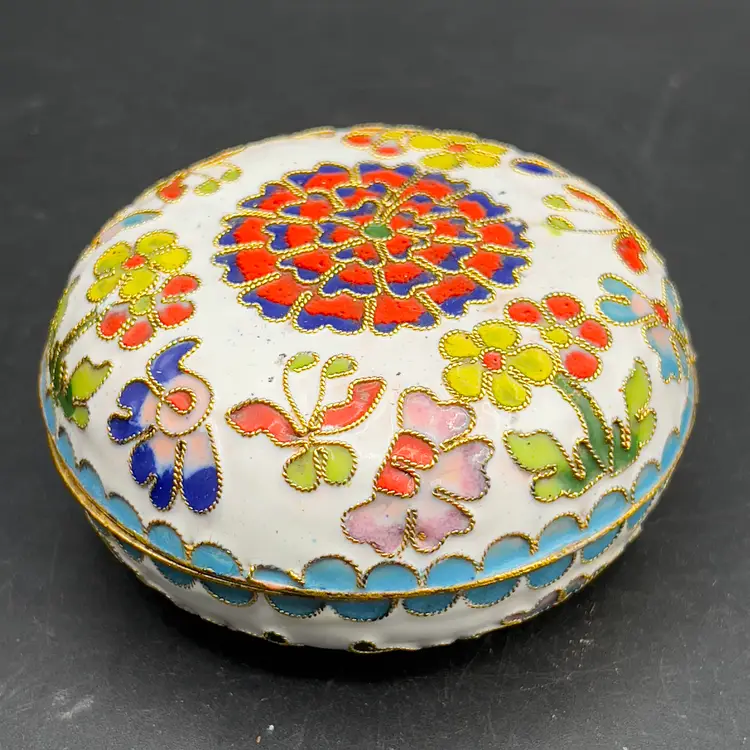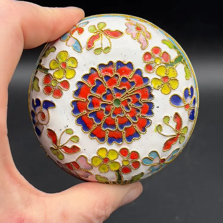 VTG Cloisonne Enamel Trinket Dish with Lid Raised Flowers Round 3“ White Condition: Preowned, but in TERRIFIC condition. Item sold AS IS with no returns, so please let me know if you would like more pictures.