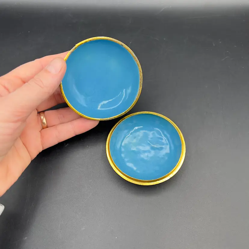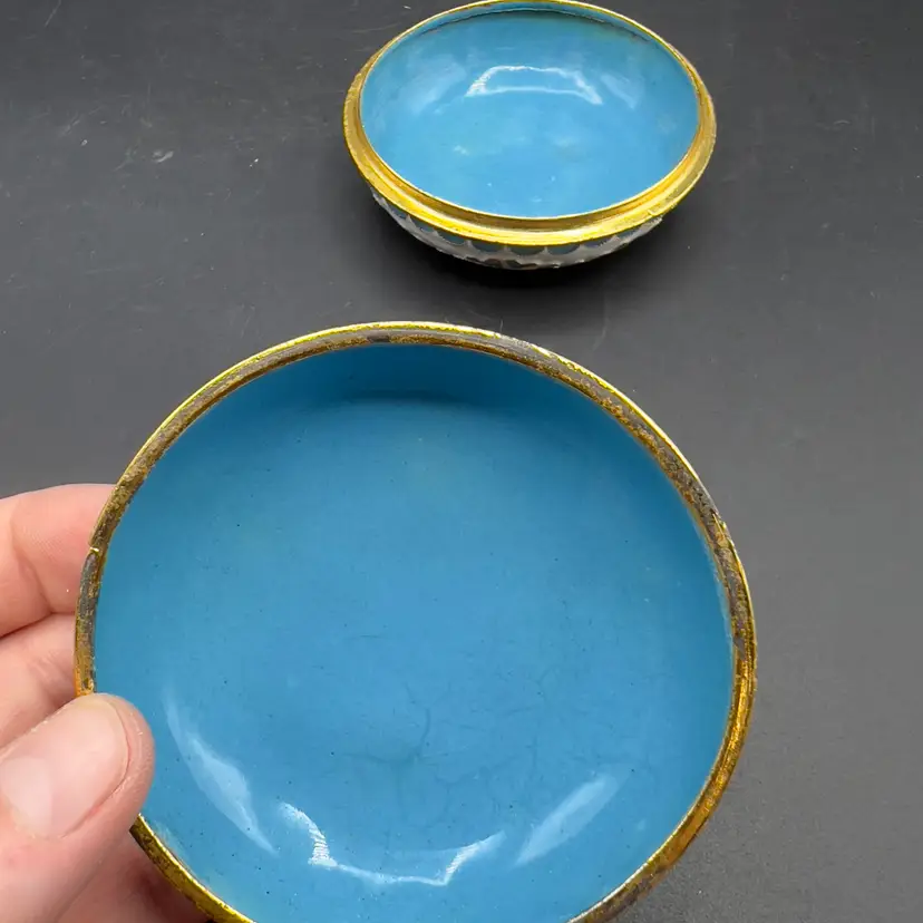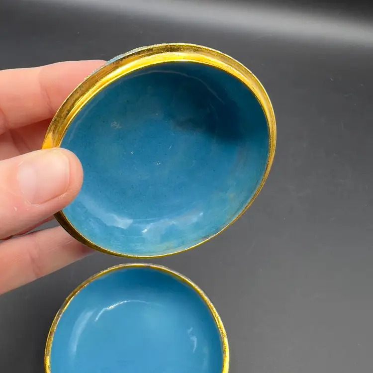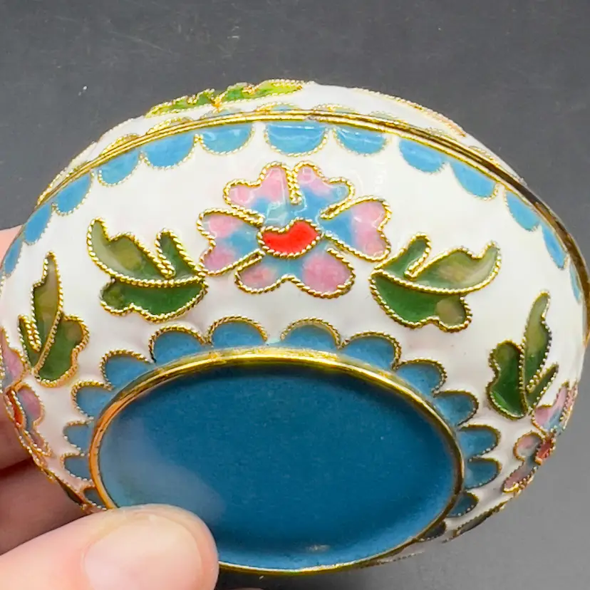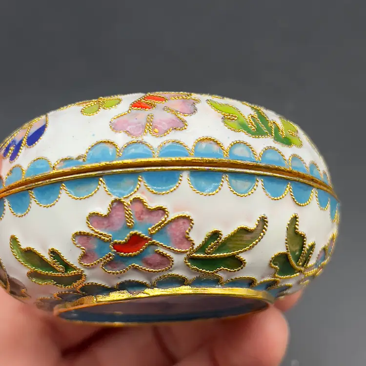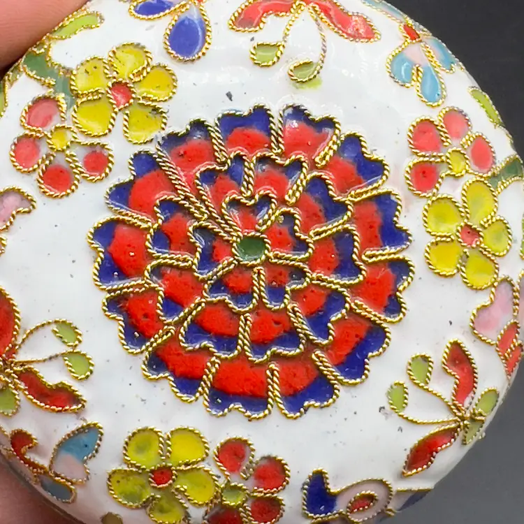 VTG Cloisonne Enamel Trinket Dish with Lid Raised Flowers Round 3“ White Condition: Preowned, but in TERRIFIC condition. Item sold AS IS with no returns, so please let me know if you would like more pictures.