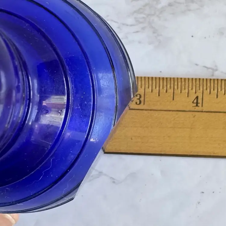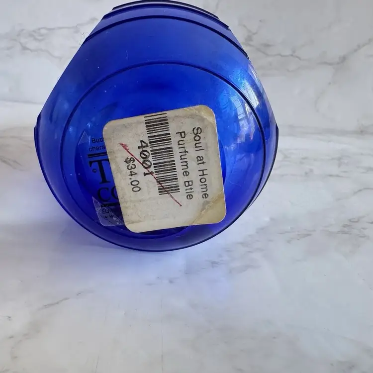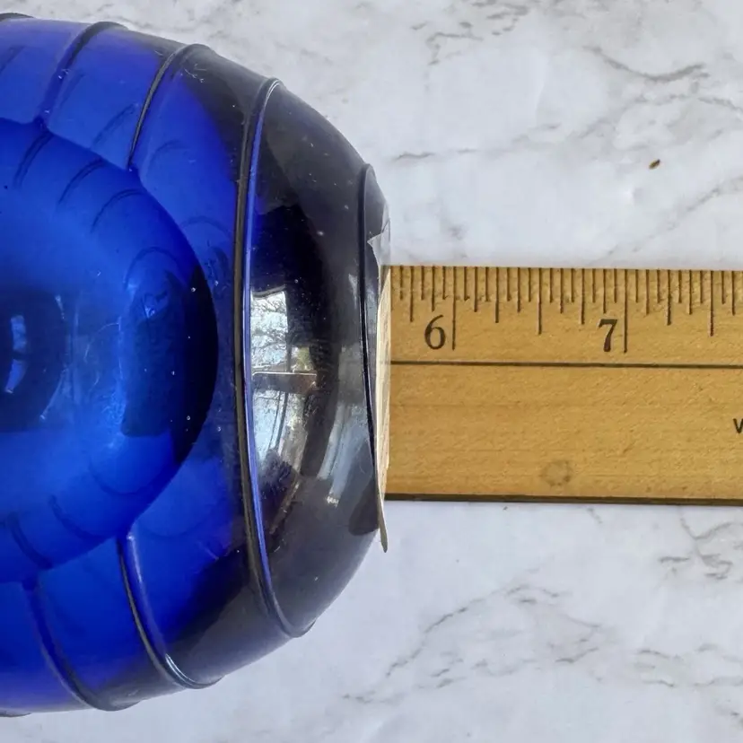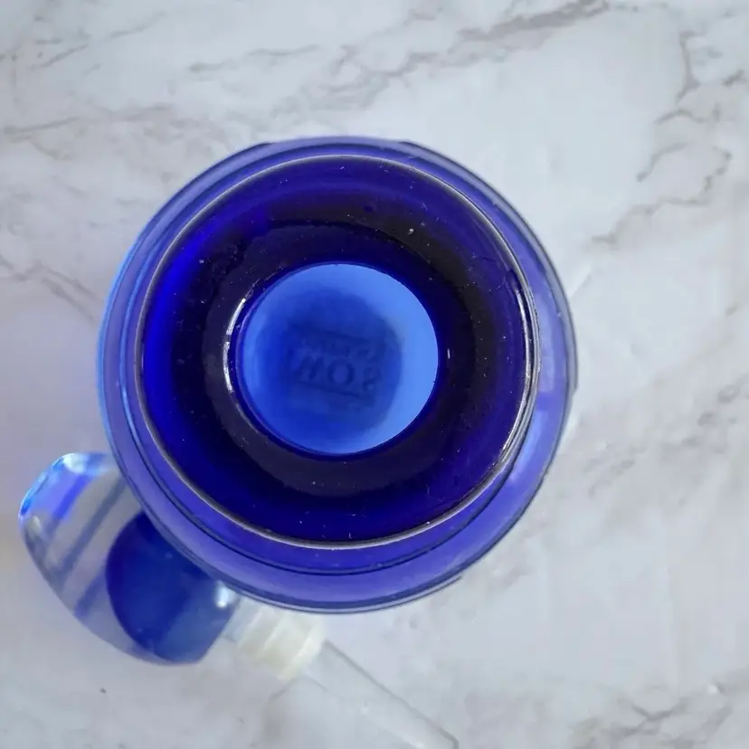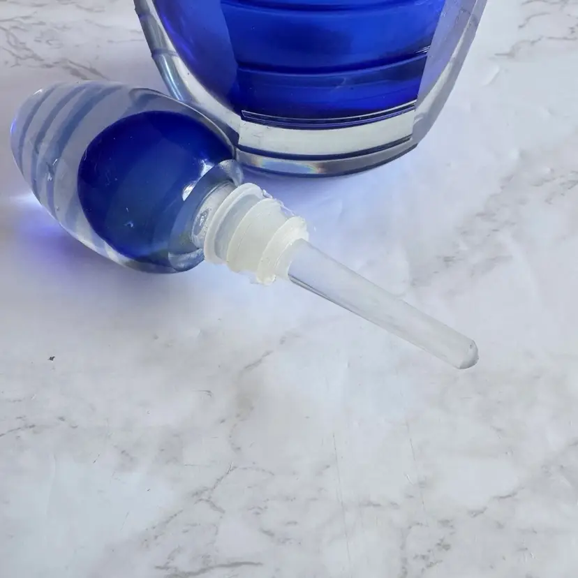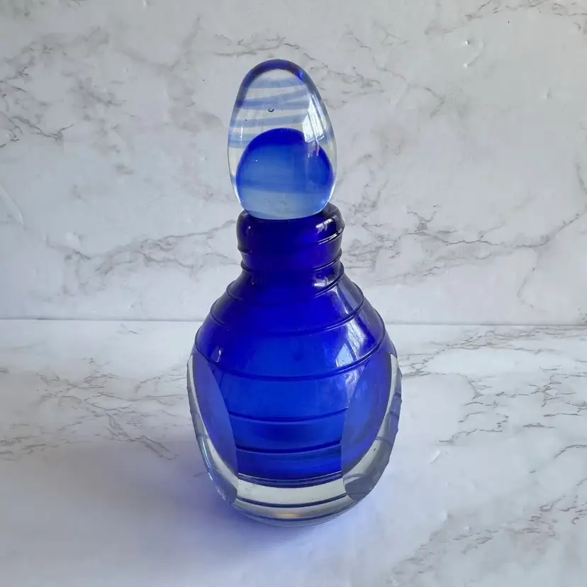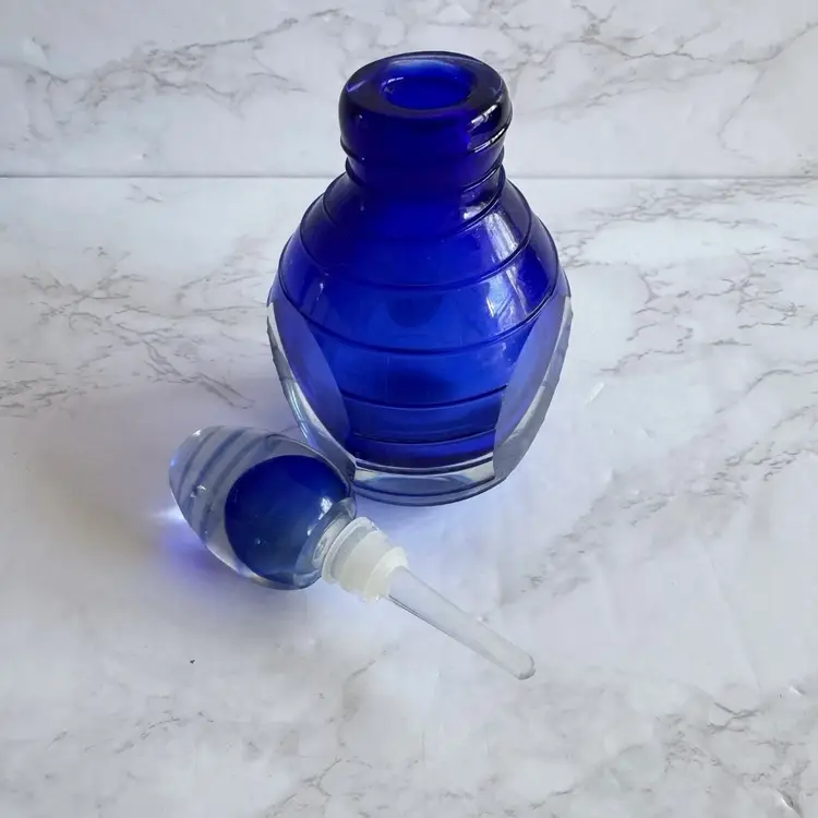 This vintage glass perfume bottle from Two's Company is a beautiful addition to any collection. The cobalt blue color and hand-blown design make it a unique piece that is sure to catch the eye. The bottle comes with a lid and dipper, making it perfect for storing and applying perfume.