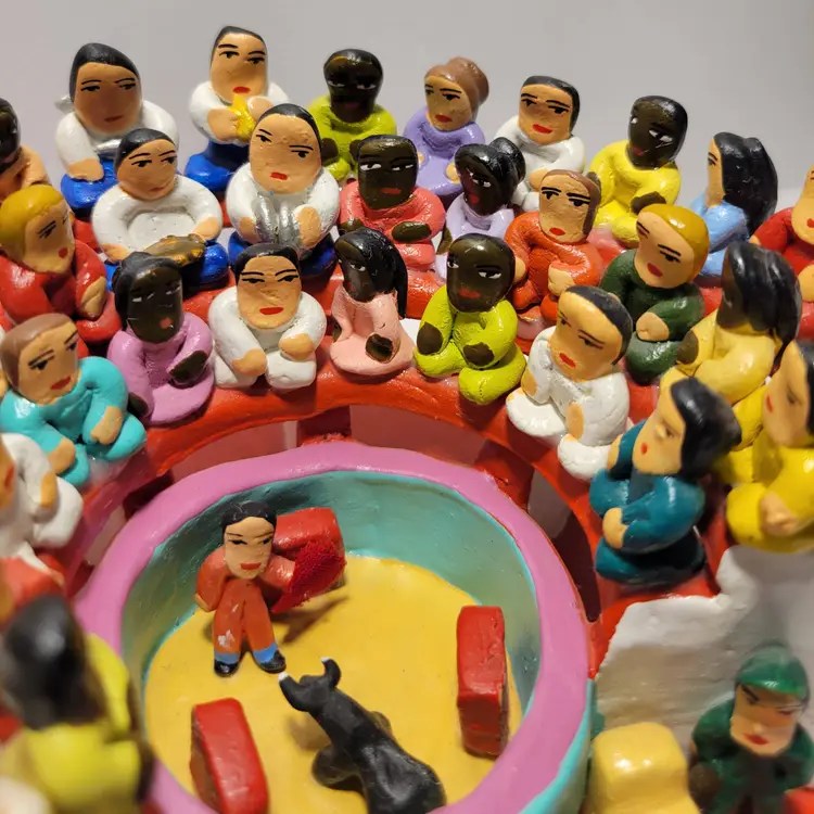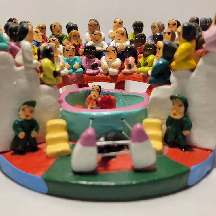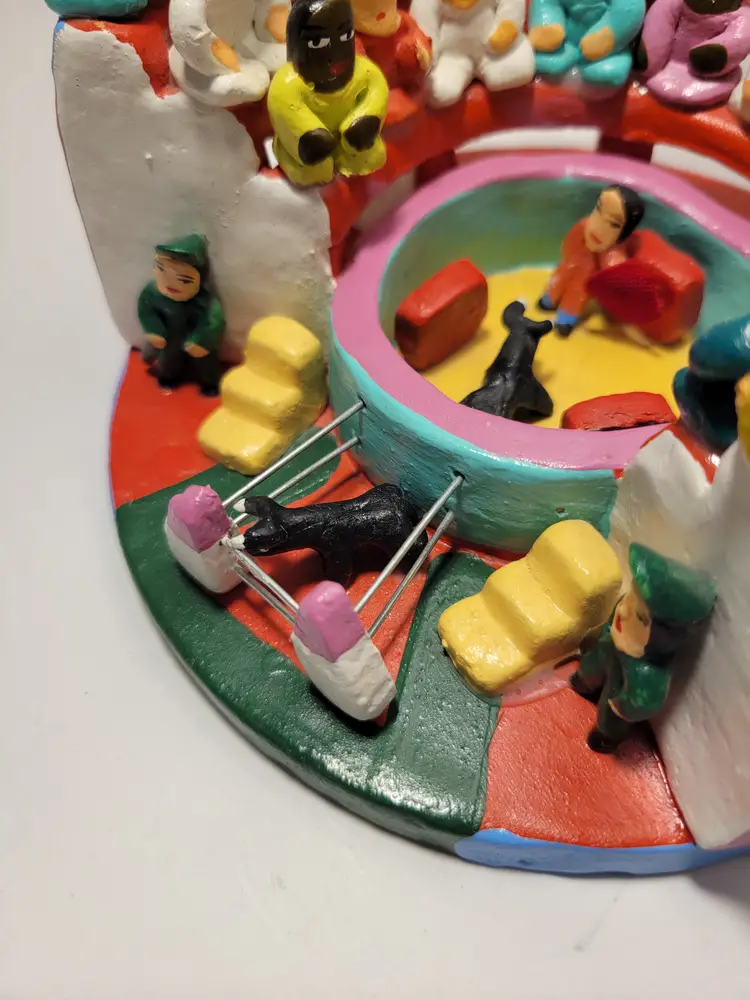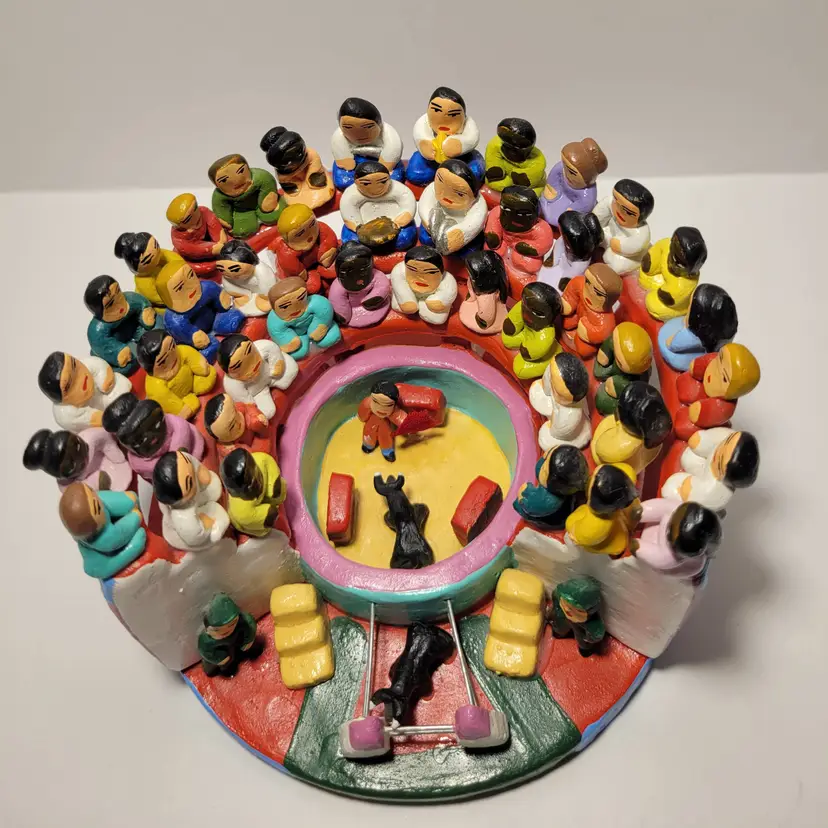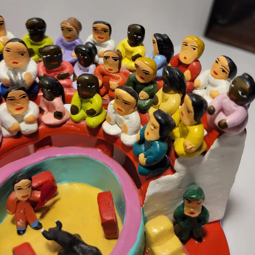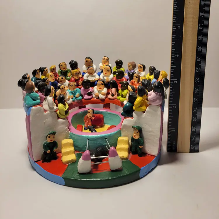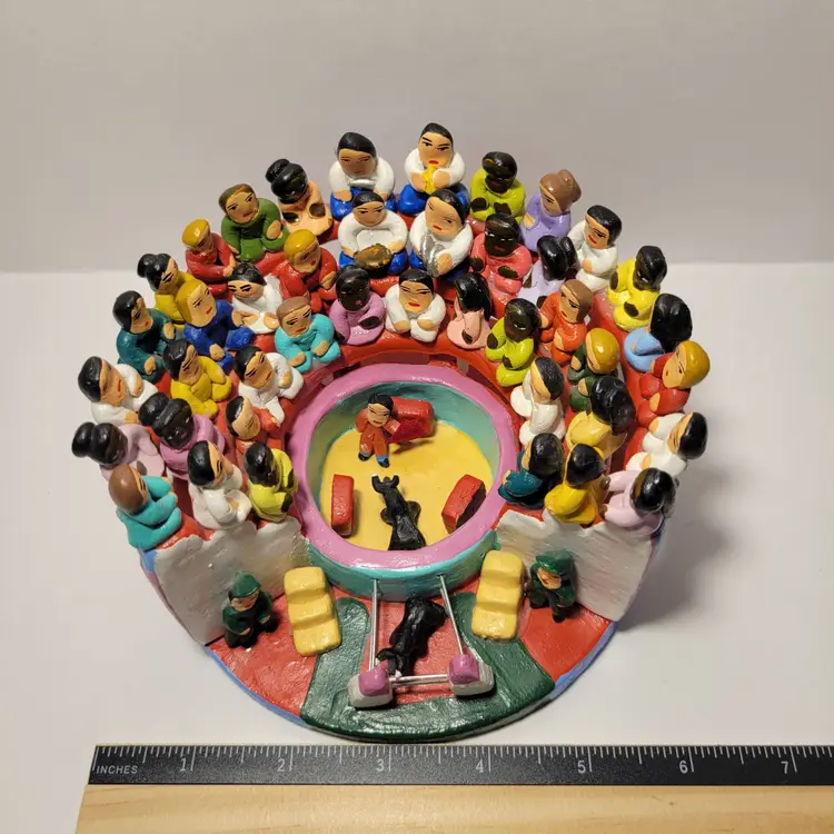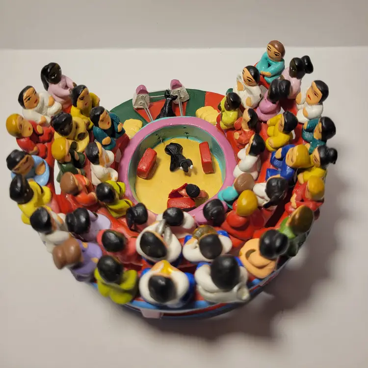Vintage Rare Ecuadorian Latin American Folk Art Clay Pottery piece depicting a traditional bull fight scene in an arena surrounded by spectators. Measures 5.75"W x 3.25"H. Handmade and painted from Ecuador. Condition is very good with only a small amount of paint loss on very bottom from use. See photos for details and condition. Thanks for looking!