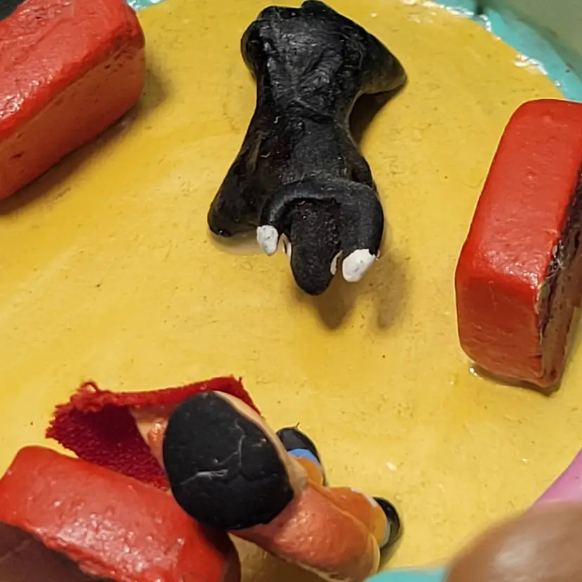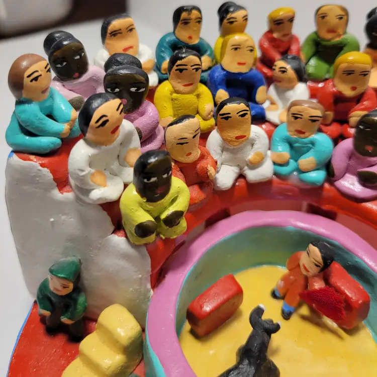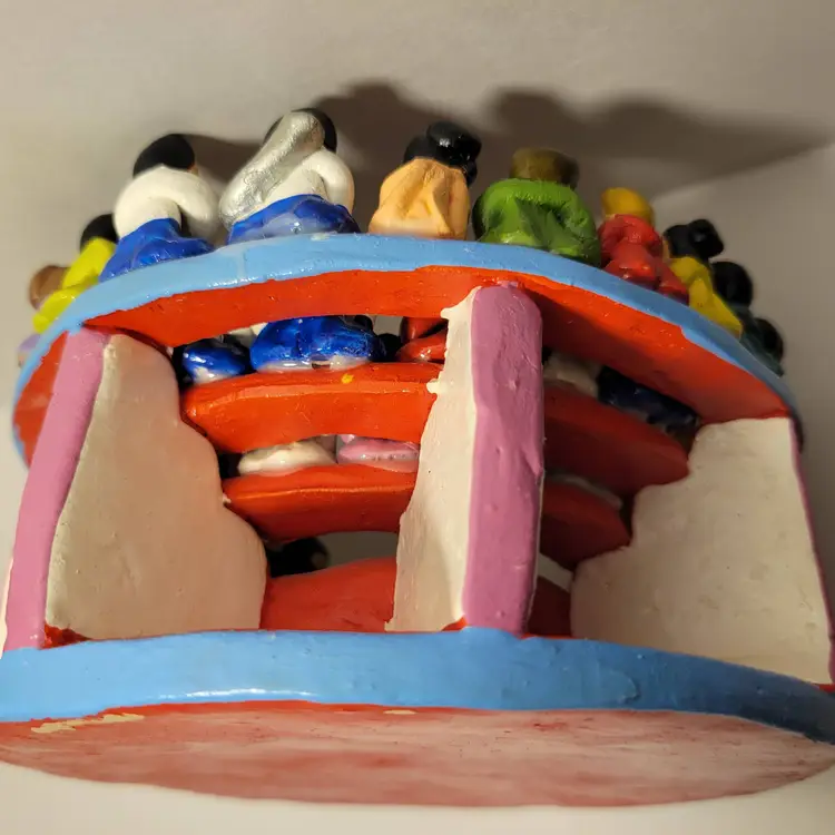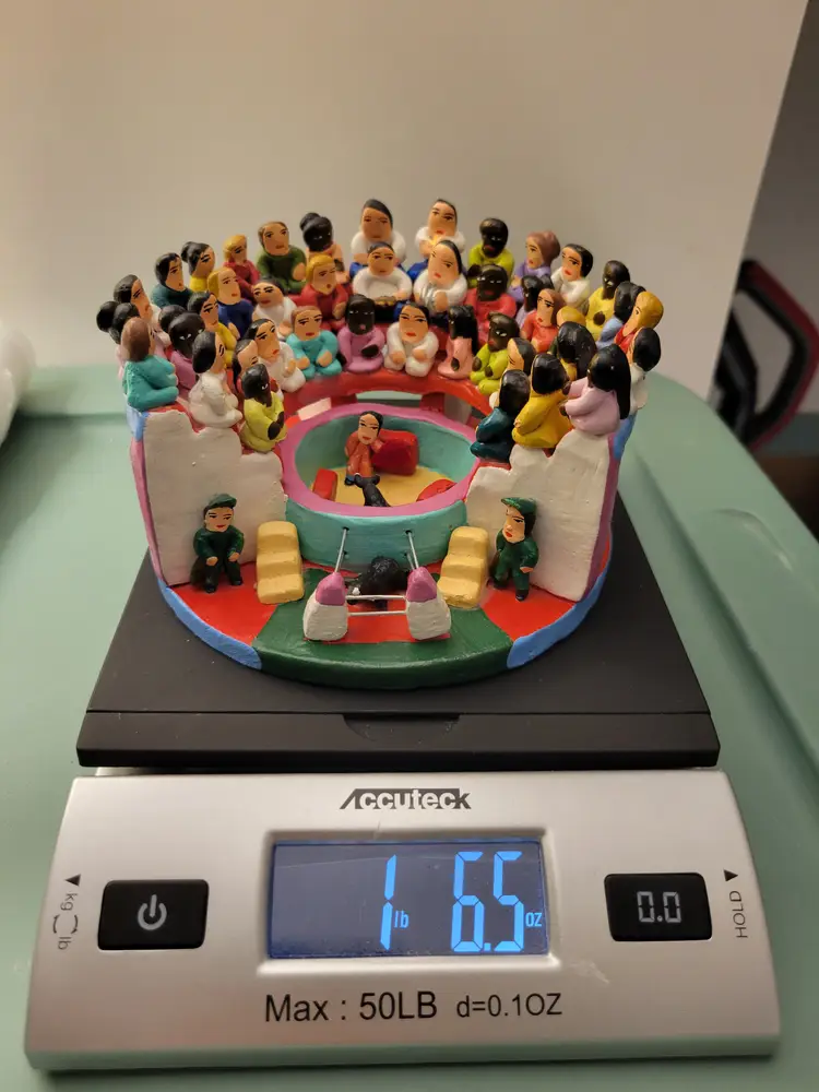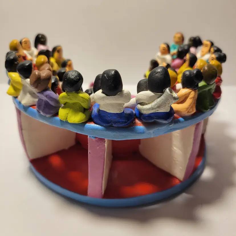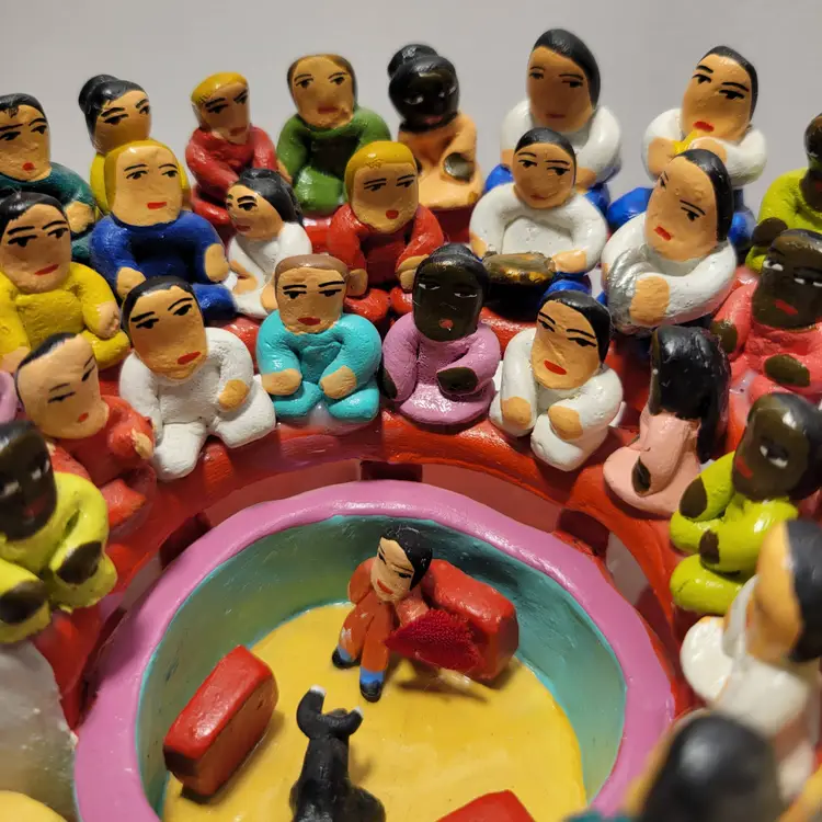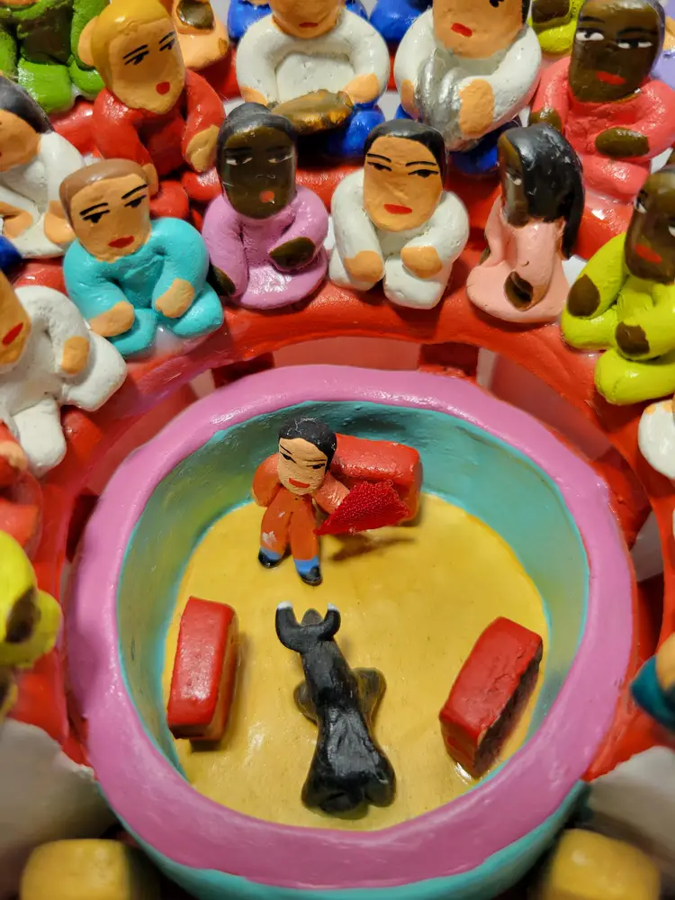 Vintage Rare Ecuadorian Latin American Folk Art Clay Pottery piece depicting a traditional bull fight scene in an arena surrounded by spectators. Measures 5.75"W x 3.25"H. Handmade and painted from Ecuador. Condition is very good with only a small amount of paint loss on very bottom from use. See photos for details and condition. Thanks for looking!