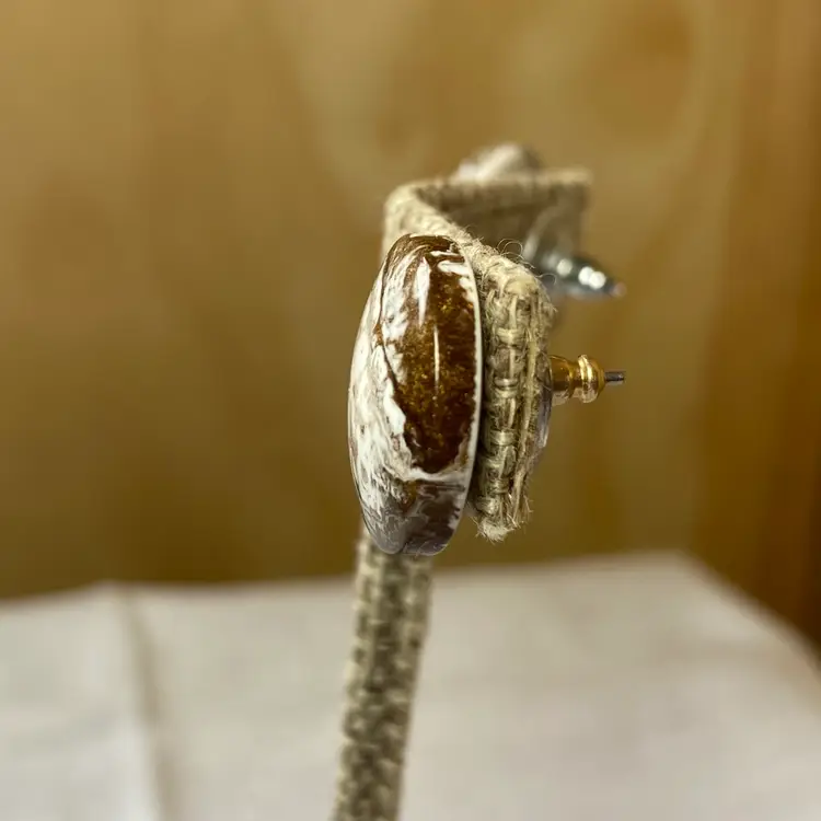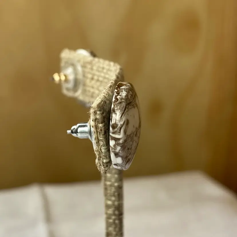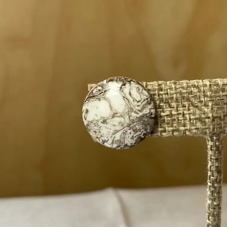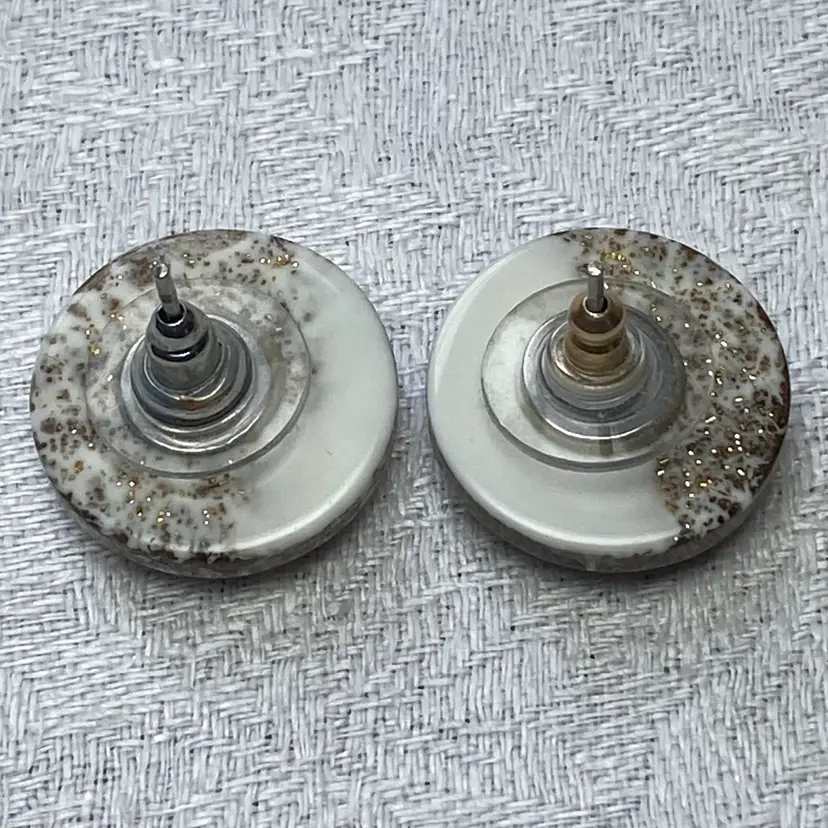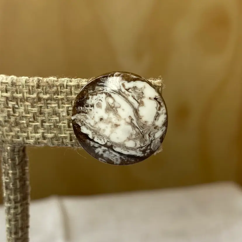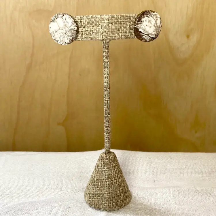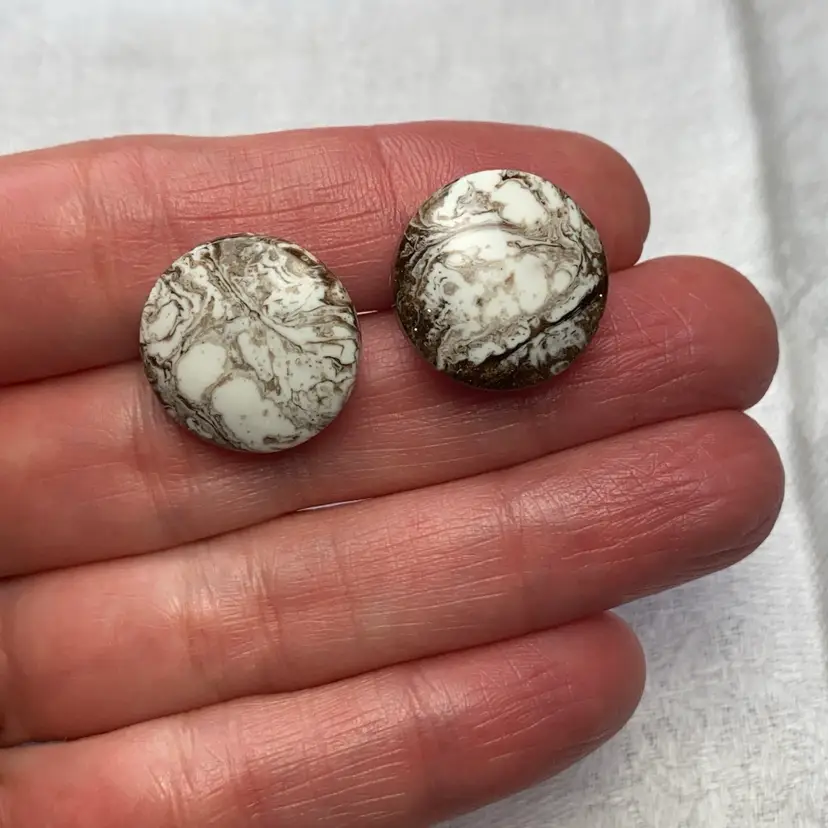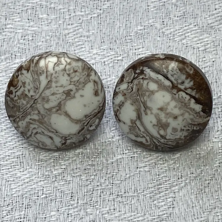 Add a touch of retro style to your fashion jewelry collection with these unique earrings. The round acrylic cabochons are variegated brown and white colors which make them look like marble or stone. The earrings are pierced. These neutral colored earrings are a great addition to any jewelry collection and will complement any outfit. The unique style and colors make them a perfect statement piece for any occasion.