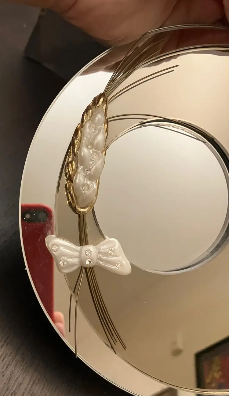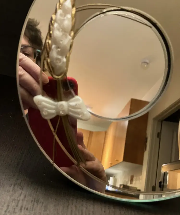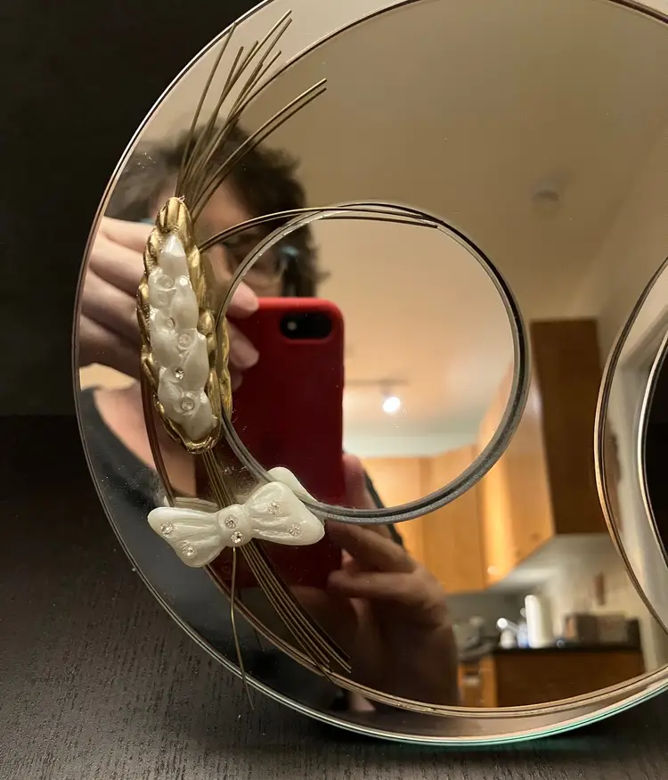 Condition issues: small chips right above the bow and one of the metal wires is bent under the bow. This is a tabletop mirror. Measures 7 1/4" tall and about 5 1/2" wide and 1 3/4" deep.