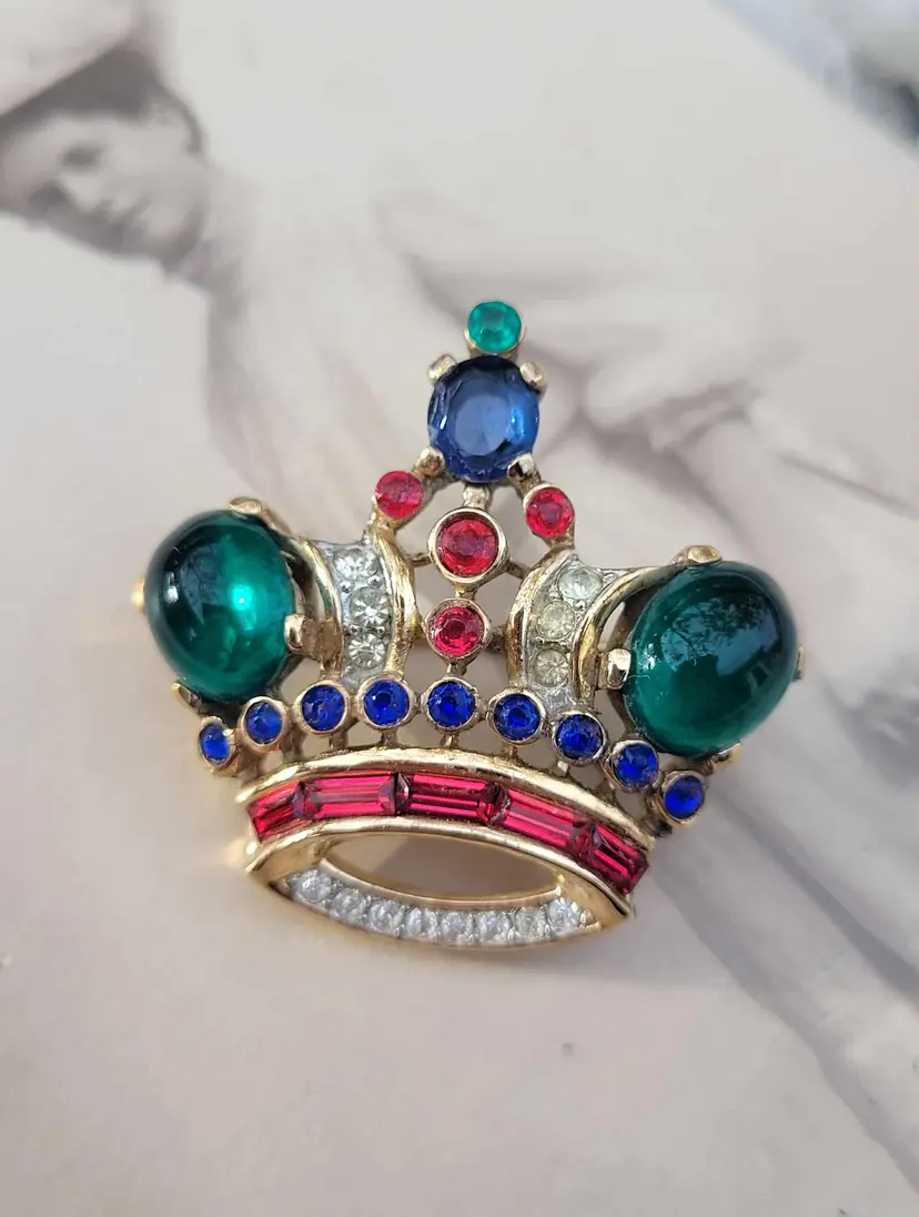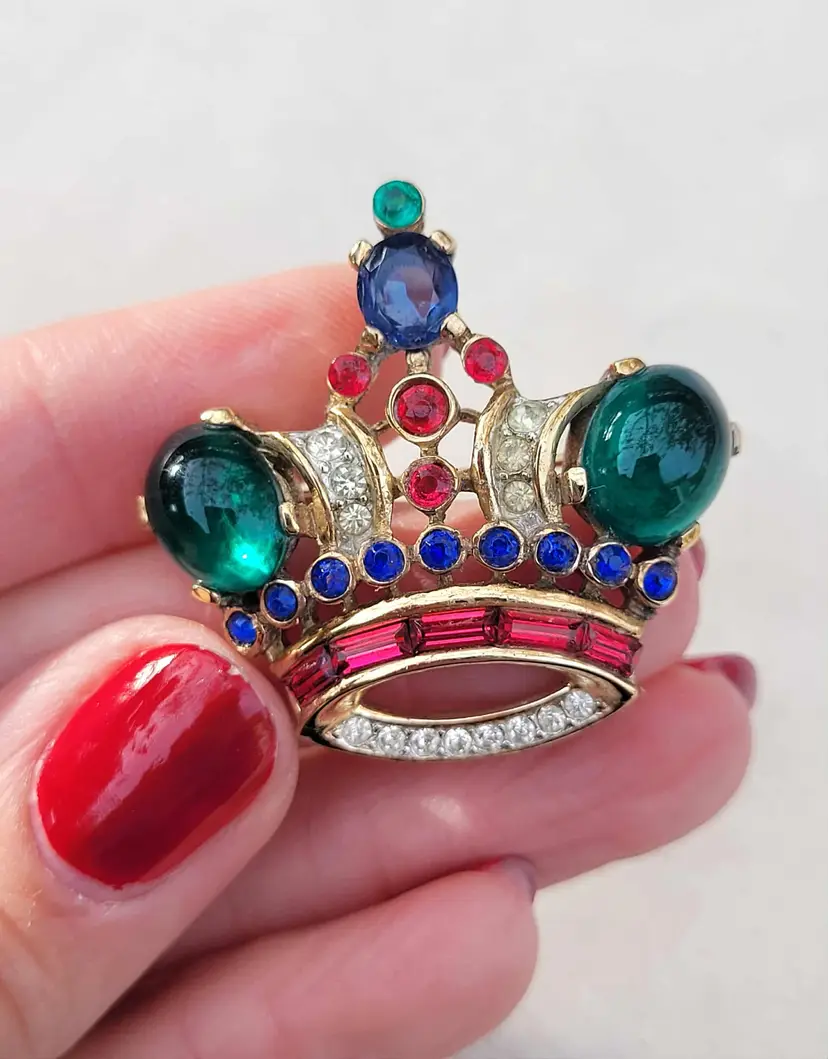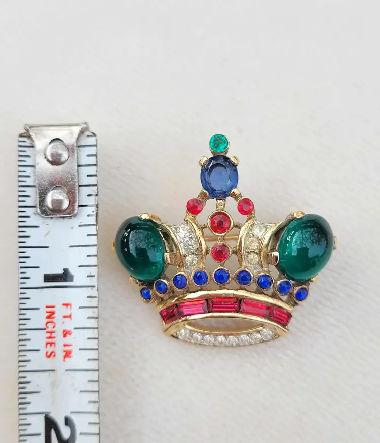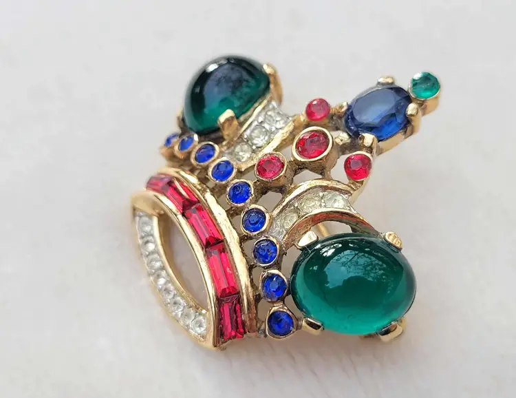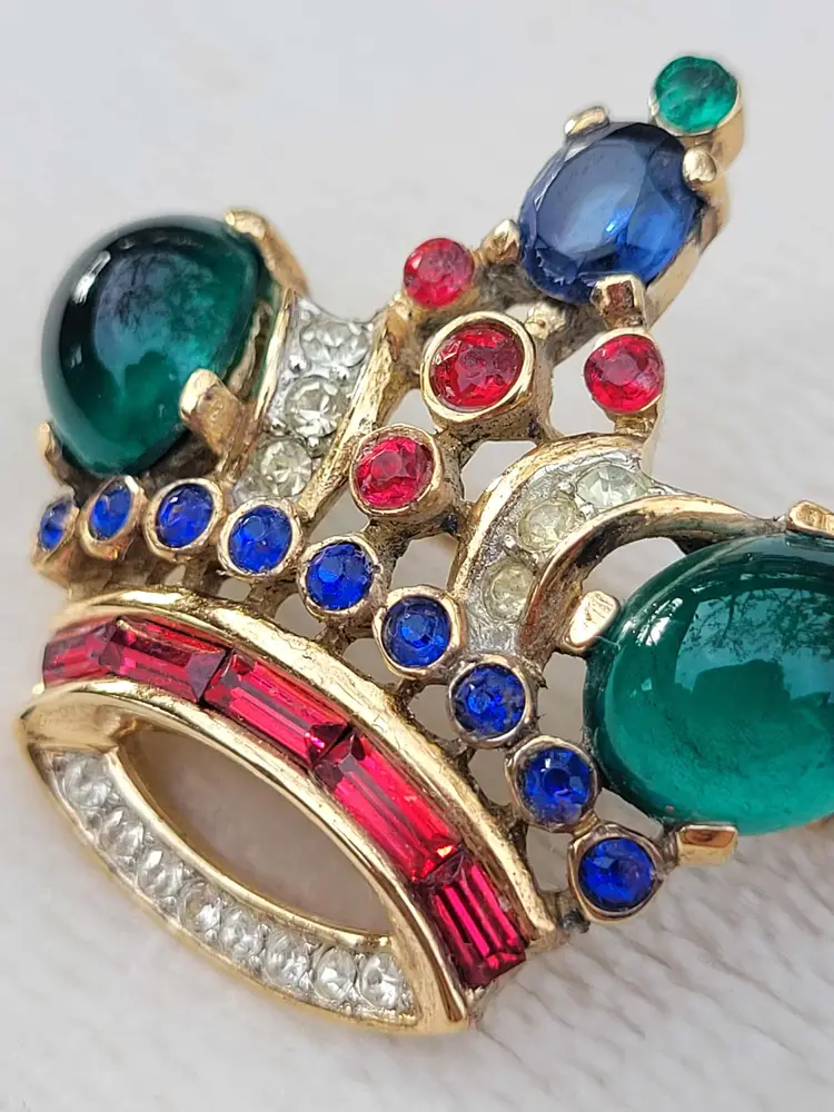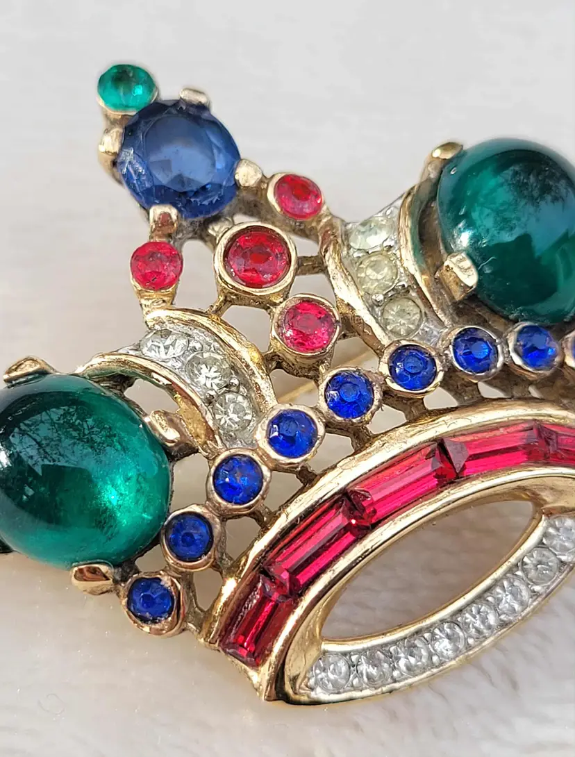 Simply stunning 1940s sterling silver vermeil Crown Trifari brooch with a variety of jewel-tone glass stones. This is from an estate and in good condition with some wear to the gold vermeil on the back. Please see pictures for details and measurements.
