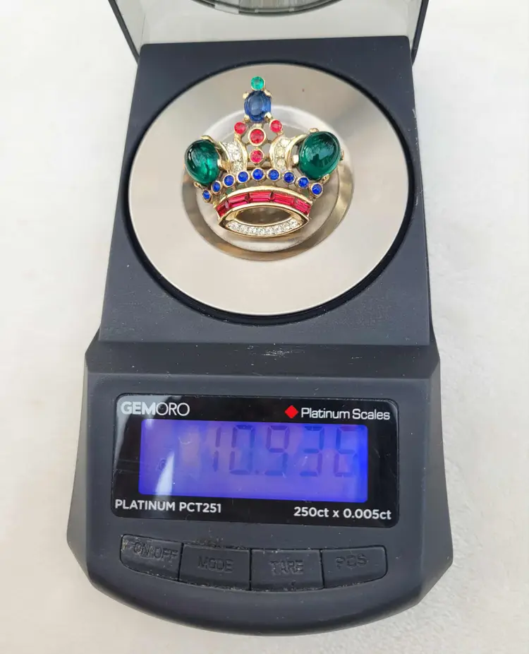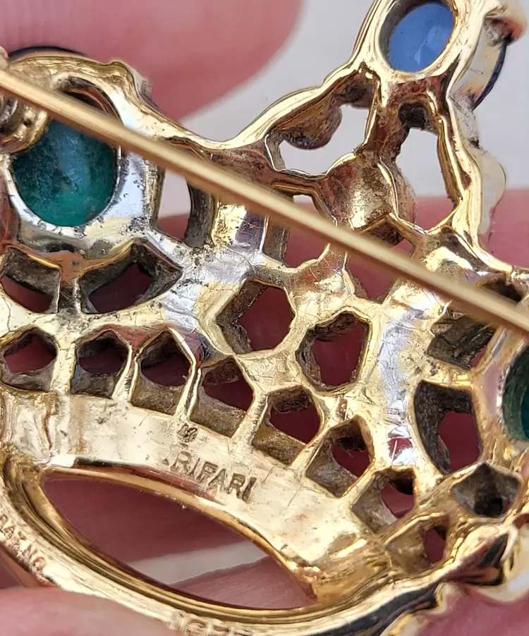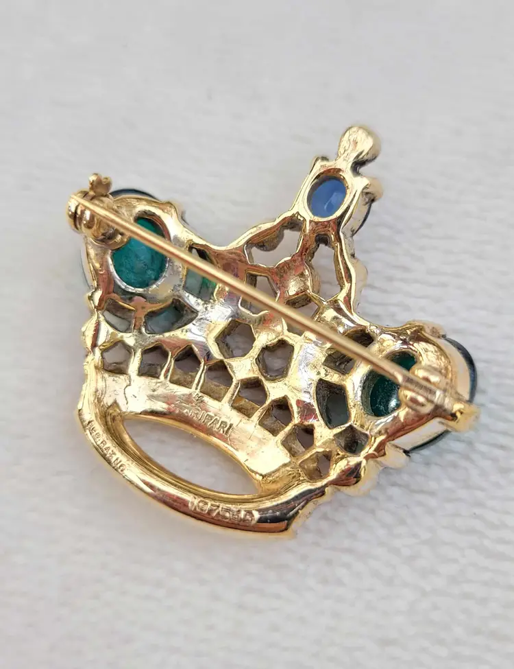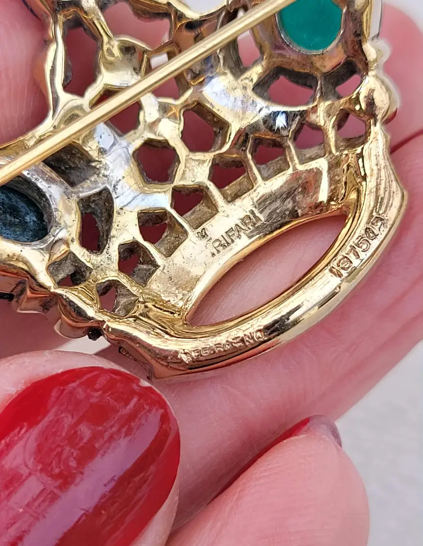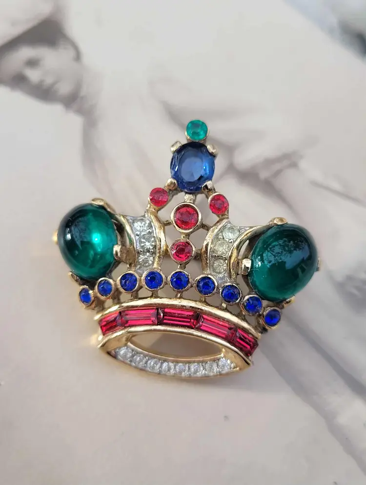 Simply stunning 1940s sterling silver vermeil Crown Trifari brooch with a variety of jewel-tone glass stones. This is from an estate and in good condition with some wear to the gold vermeil on the back. Please see pictures for details and measurements.