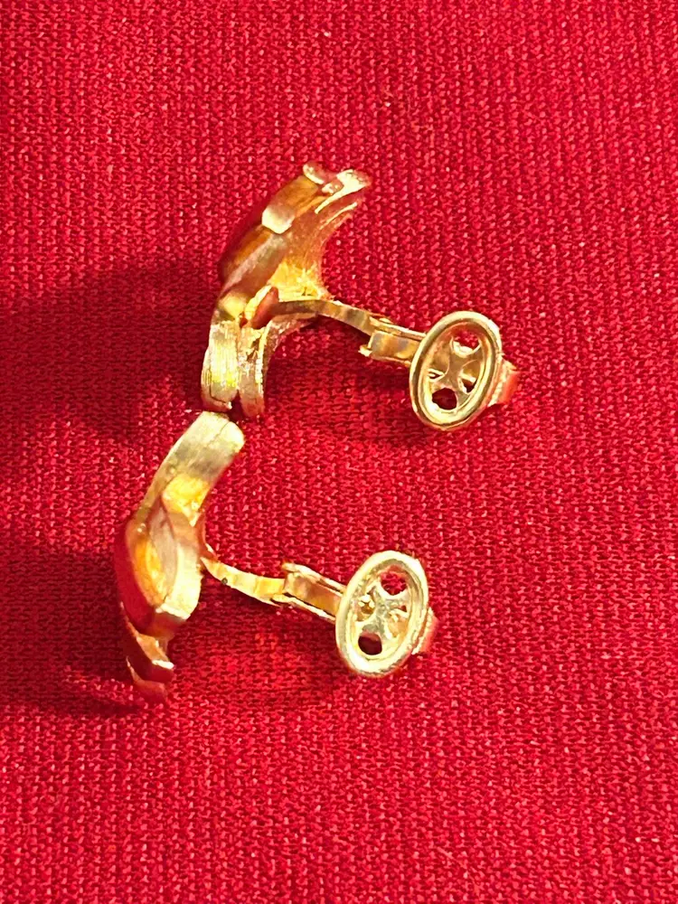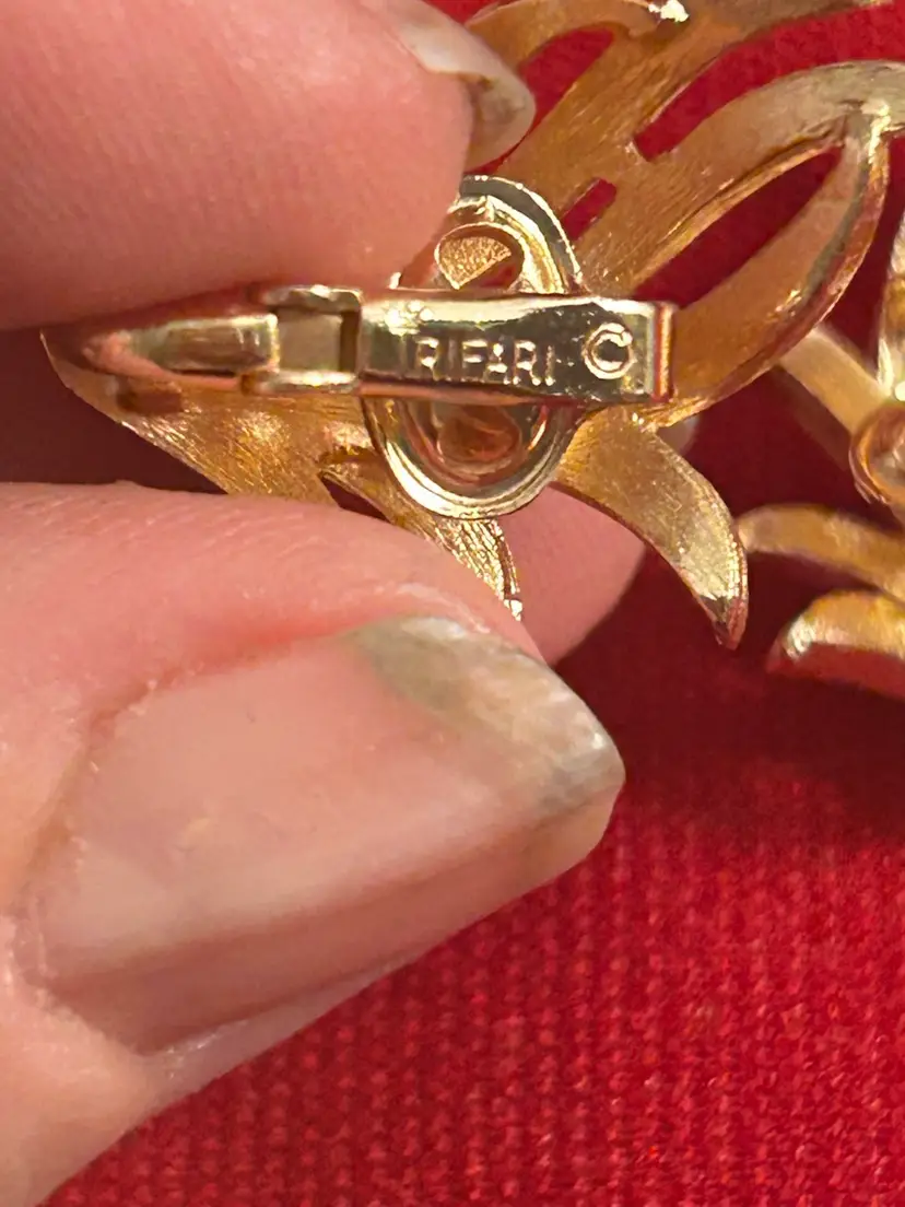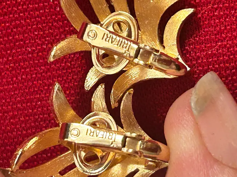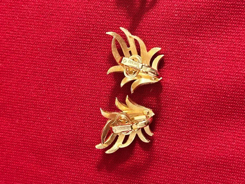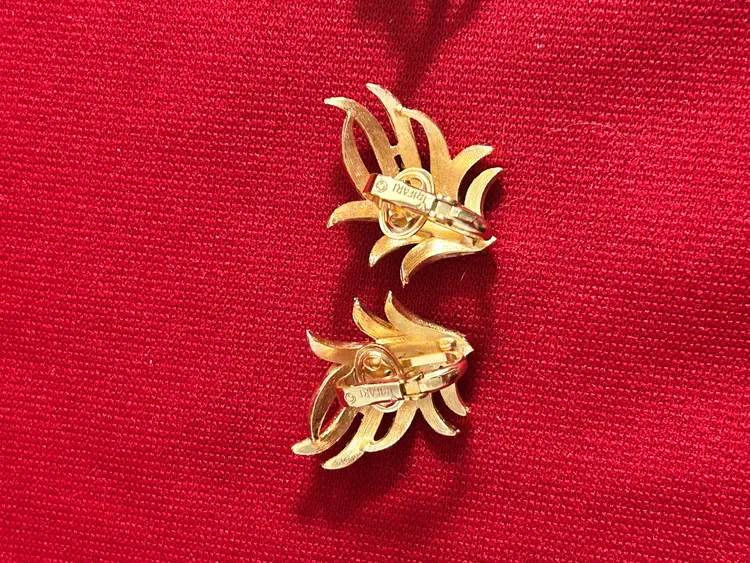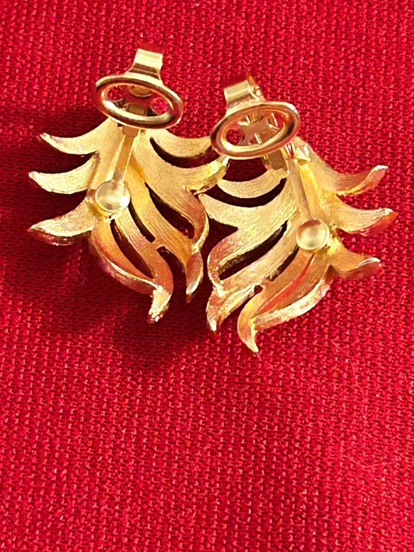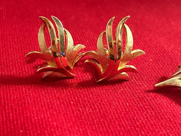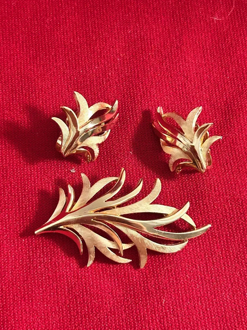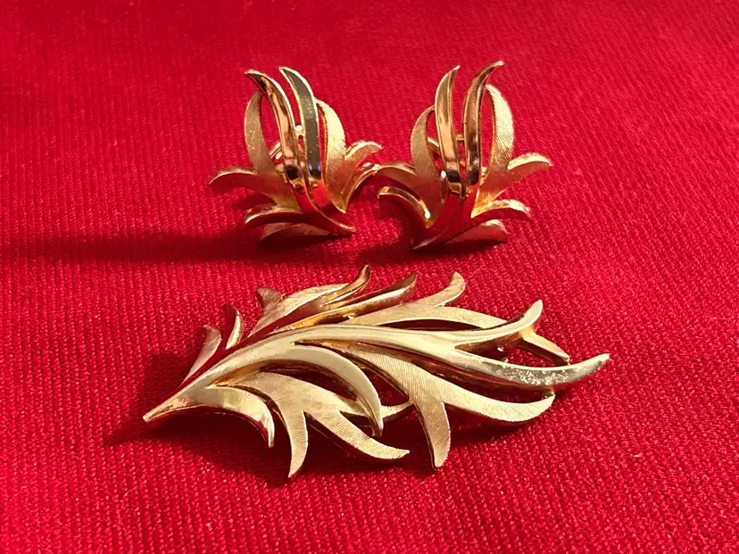 Vintage Crown Trifari Gold Tone earring and brooch set. Excellent condition. Please see photos. Let me know if you have any questions. Single item offers and bundle item offer seriously considered. Thank you for stopping by.