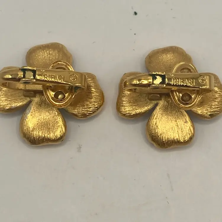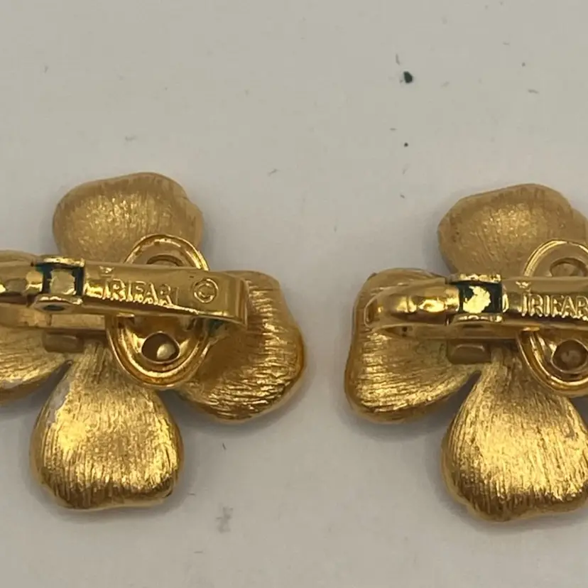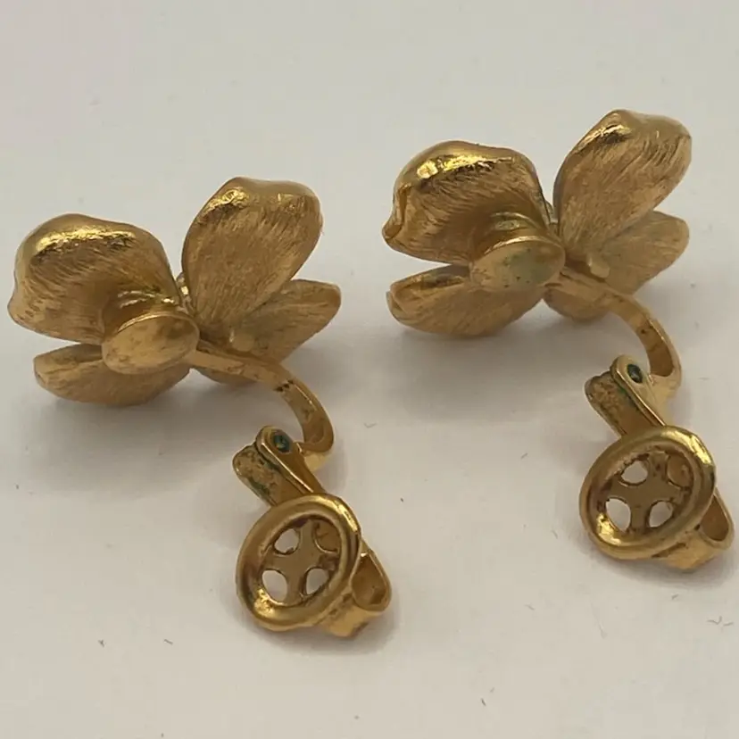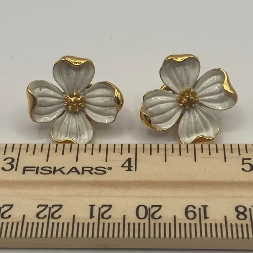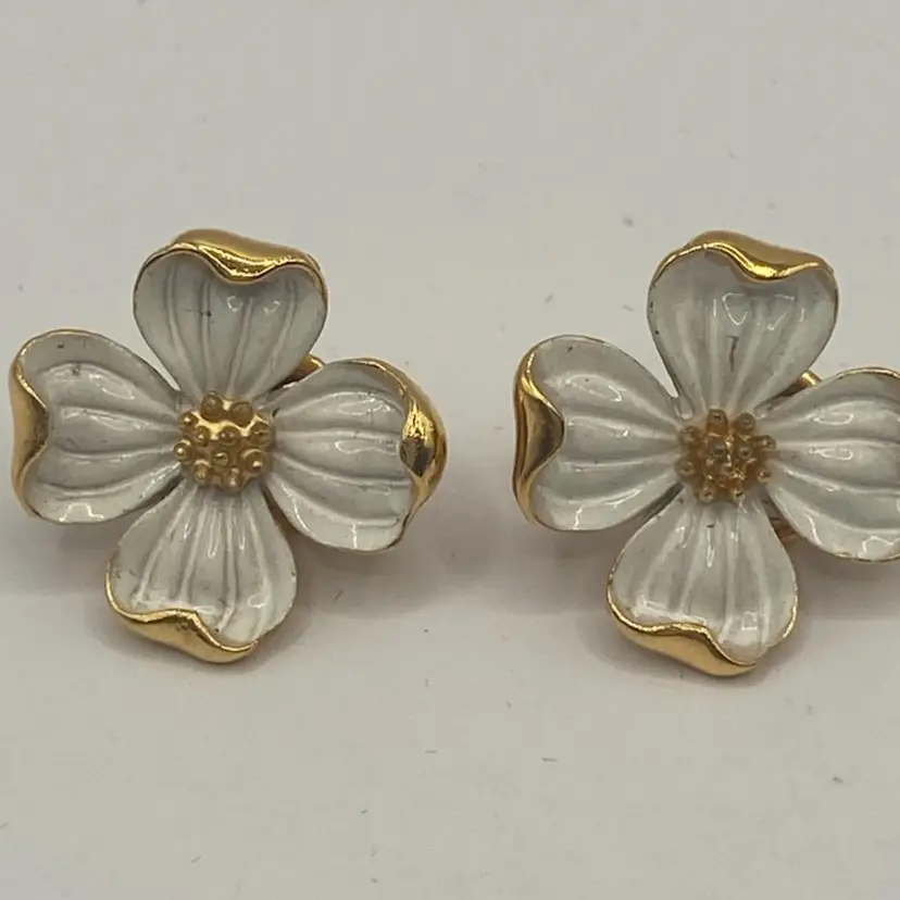 These pretty earrings are just the right touch for a spring or summer dress. There is slight wear on enamel, and on back side a small area of gold loss. They are still a very nice addition to your vintage collection.