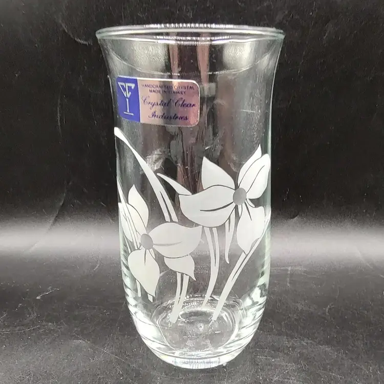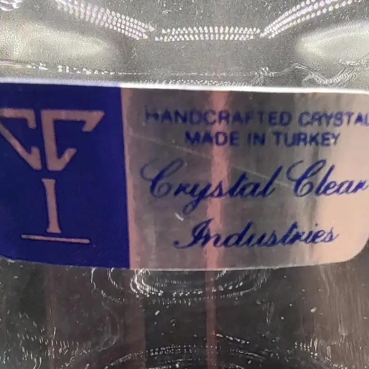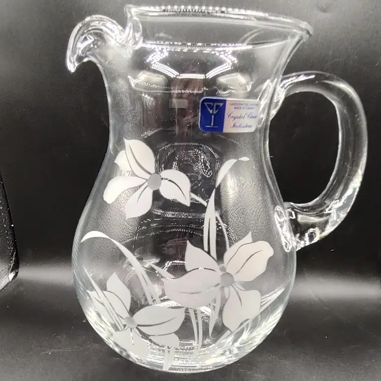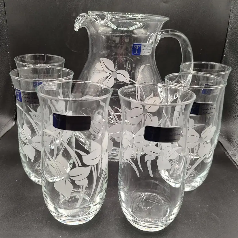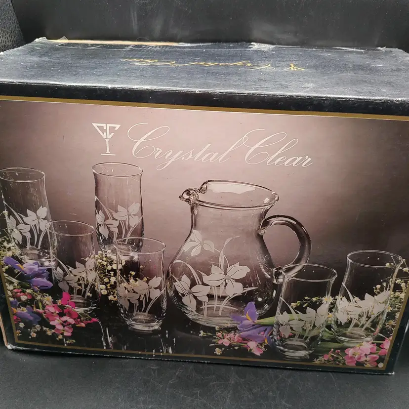 Vintage Crystal Clear Industries "Iris Frost"Hand Cut Crystal Seven piece pitcher set in original box looks to be unused. In good condition with no chips or cracks. Pitcher height 8.5" x diameter 6.5"/ Glasses height 8" x diameter 3". Made in Turkyie