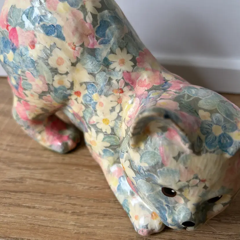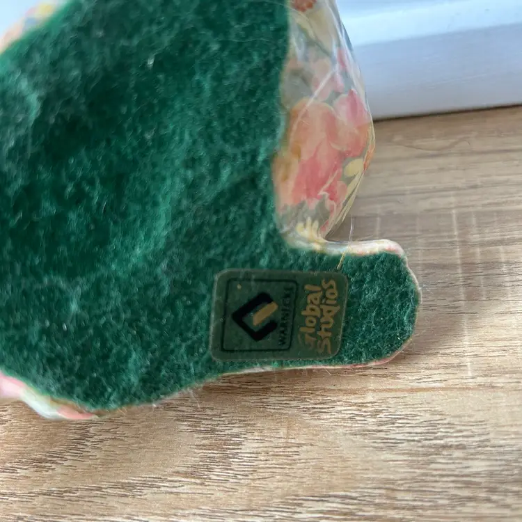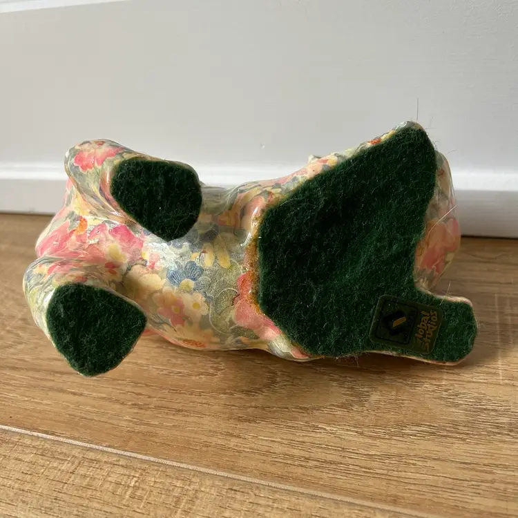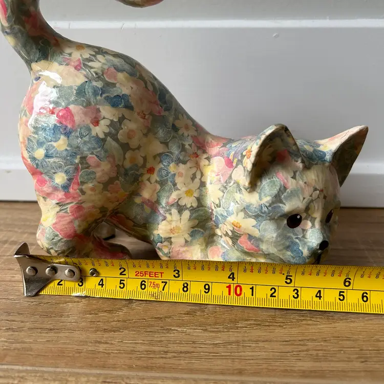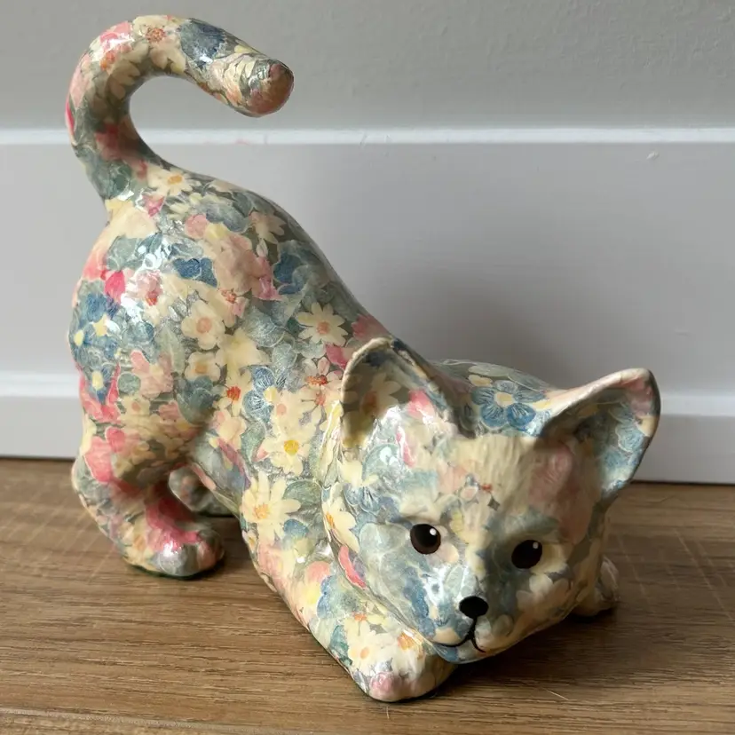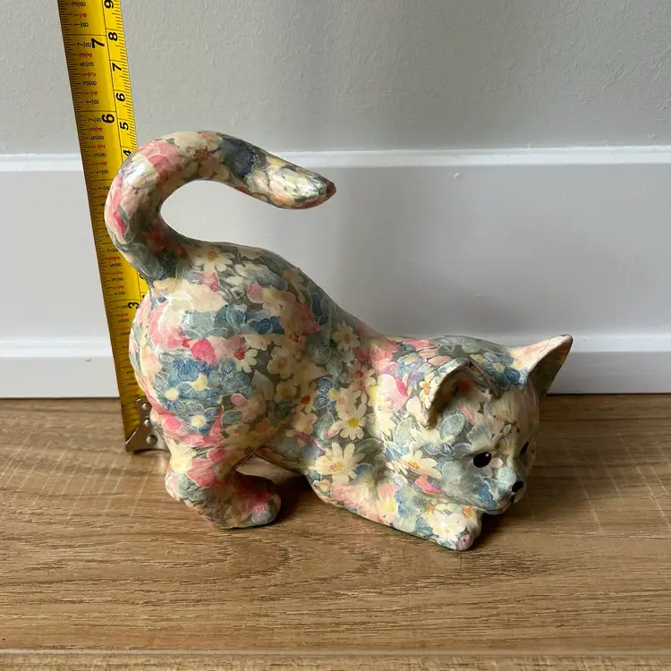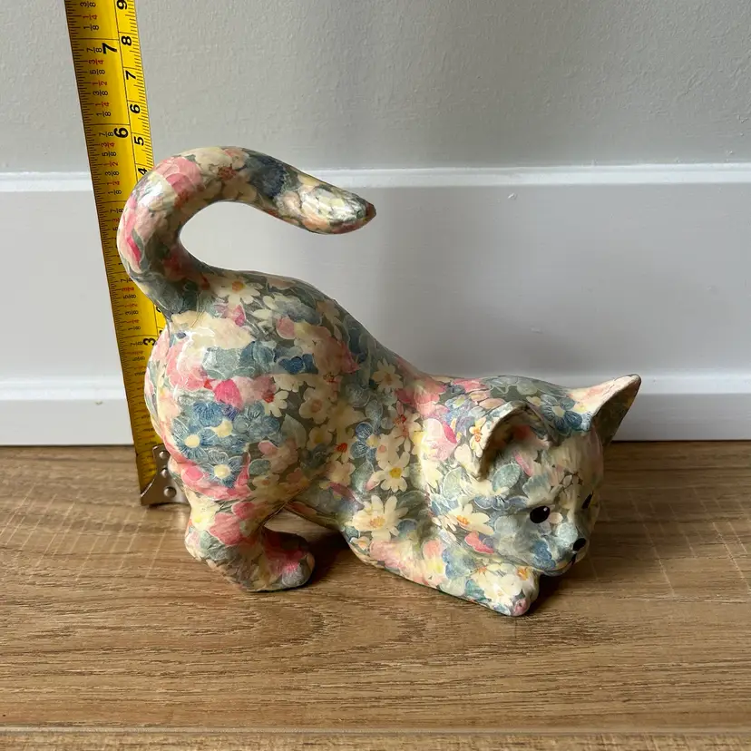 VTG Decoupage Fabric Glazed Kitty Cat Figurine Floral Flowers Felt Bottom 6"X6"