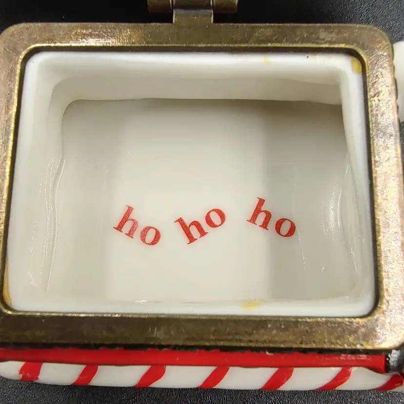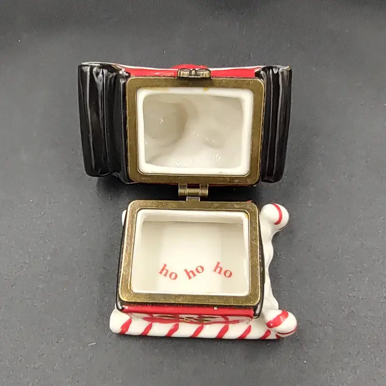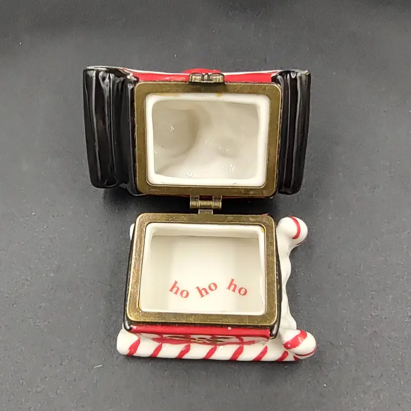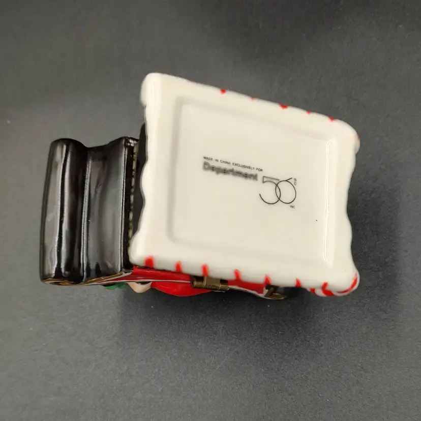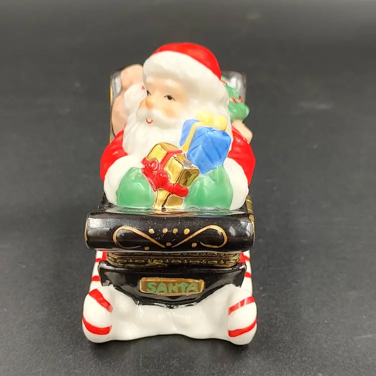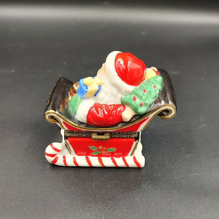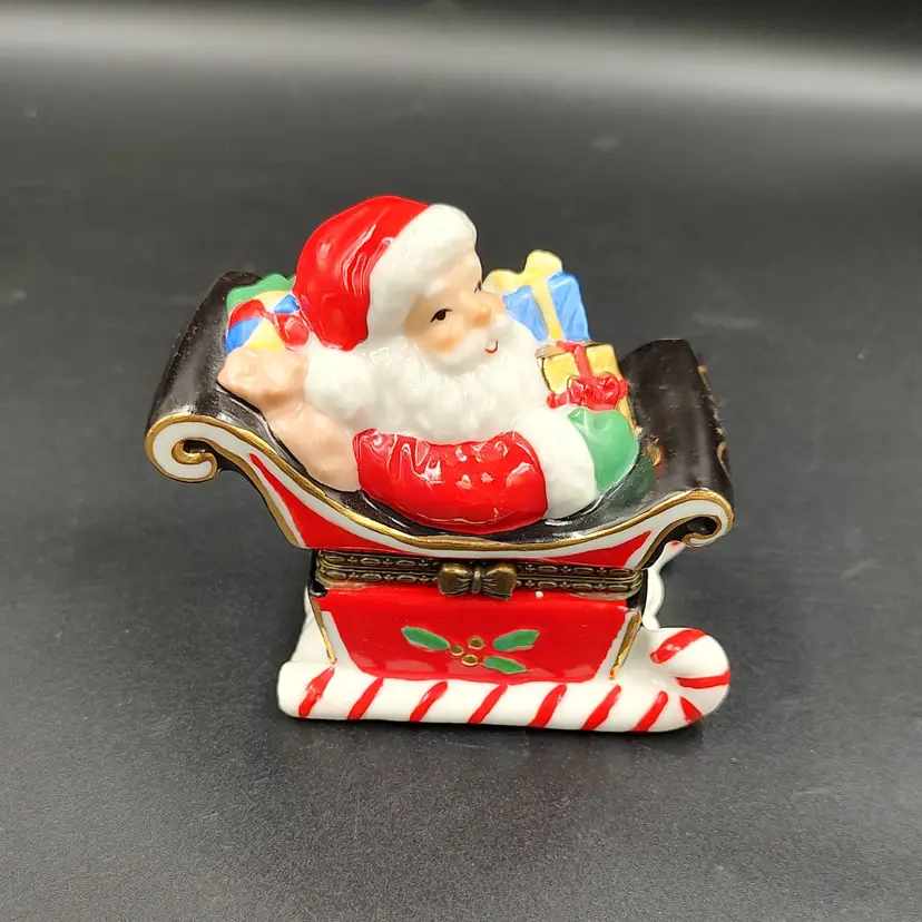 Vintage 1989 Department 56 Santa In Sleigh Ceramic Trinket Box/Pill Box. Has a flea chip. Height 3" x width 2" x length 3". Made in China