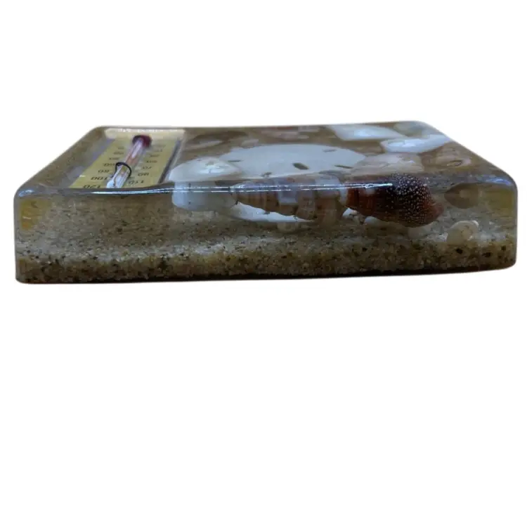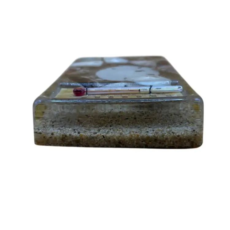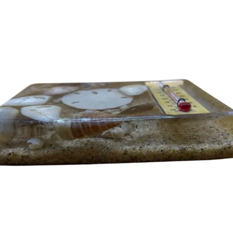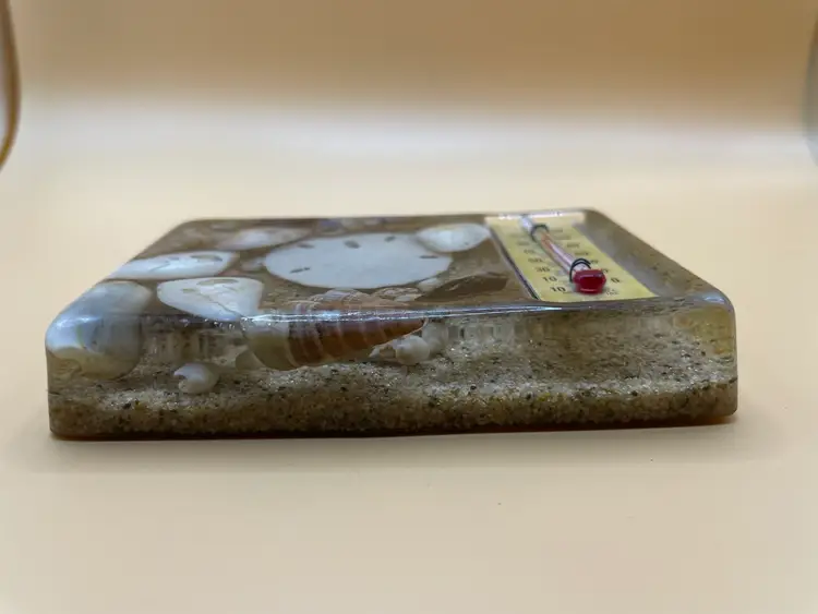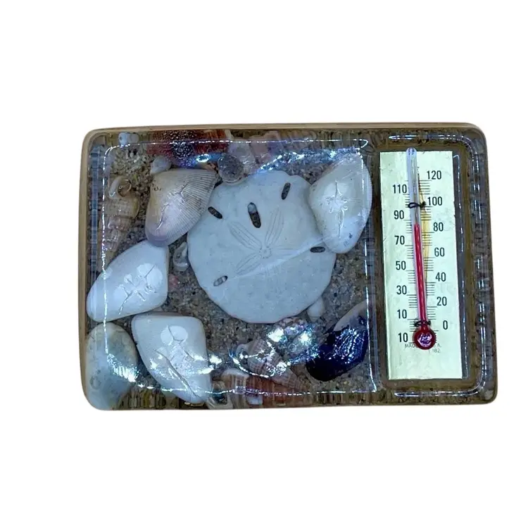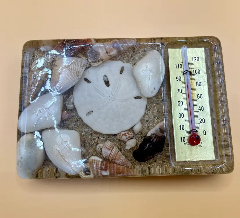 The VTG Design Gifts Intl Lucite Seashells Thermometer Paperweight is a unique and decorative collectible piece that features a beige color and is made of Lucite material. Measuring 4” x 2.75” x .75”, this paperweight is perfect for coastal enthusiasts and grandmas alike. With its nautical design and thermometer shape, it adds a touch of charm and nostalgia to any decor. Made in the United States by Design Gifts International, this paperweight is a lovely addition to any collection.