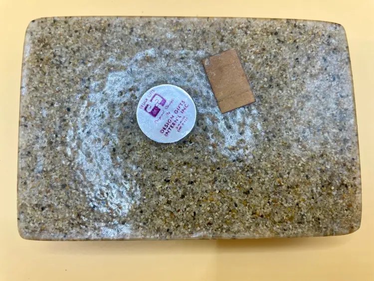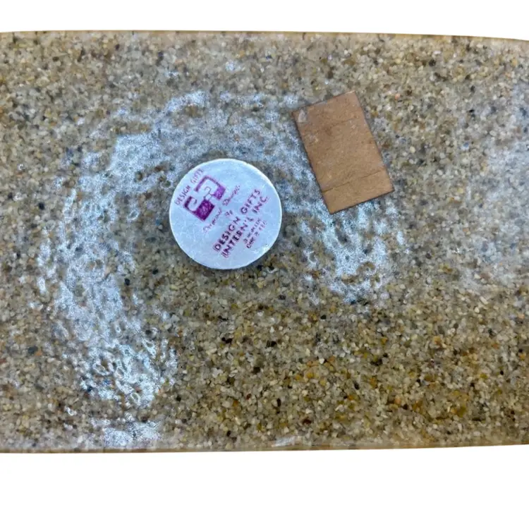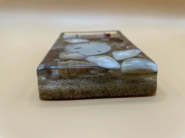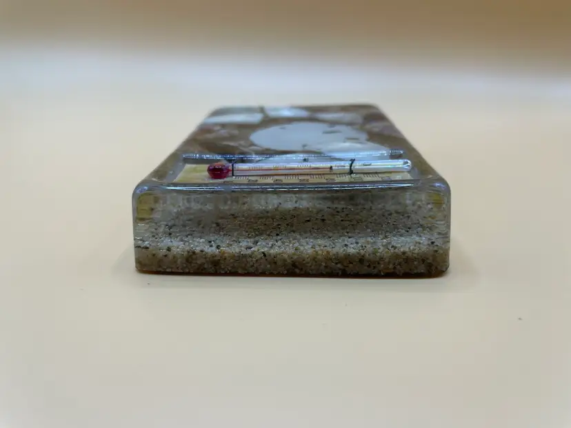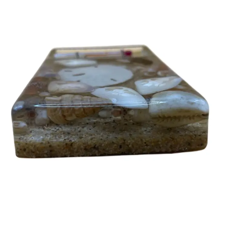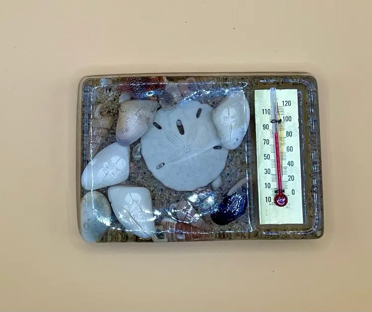 The VTG Design Gifts Intl Lucite Seashells Thermometer Paperweight is a unique and decorative collectible piece that features a beige color and is made of Lucite material. Measuring 4” x 2.75” x .75”, this paperweight is perfect for coastal enthusiasts and grandmas alike. With its nautical design and thermometer shape, it adds a touch of charm and nostalgia to any decor. Made in the United States by Design Gifts International, this paperweight is a lovely addition to any collection.