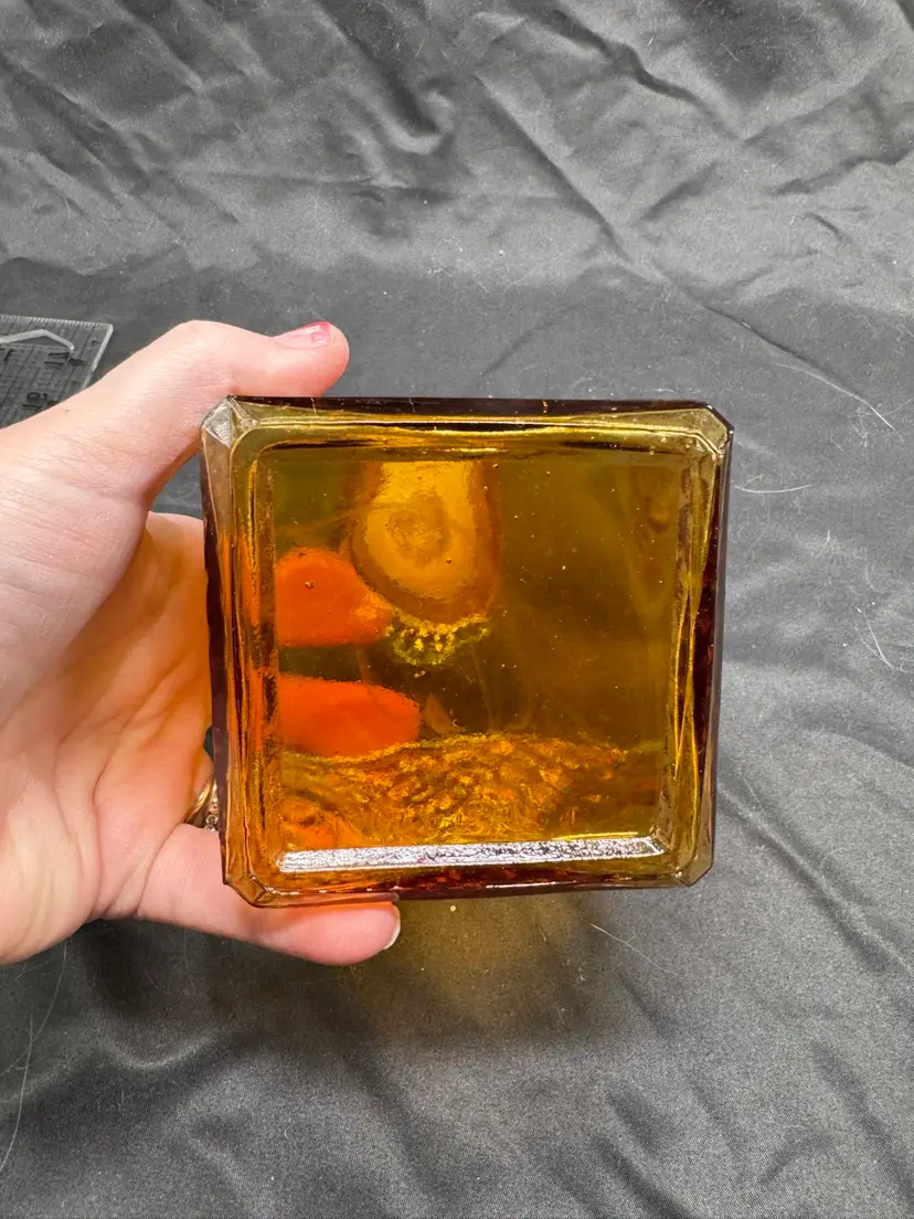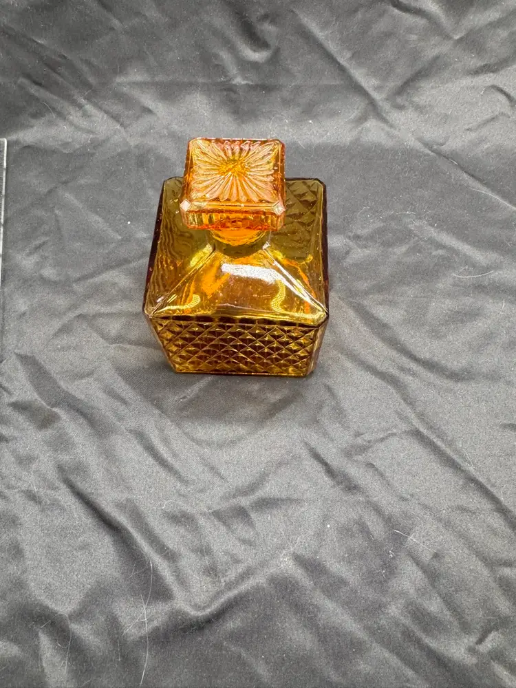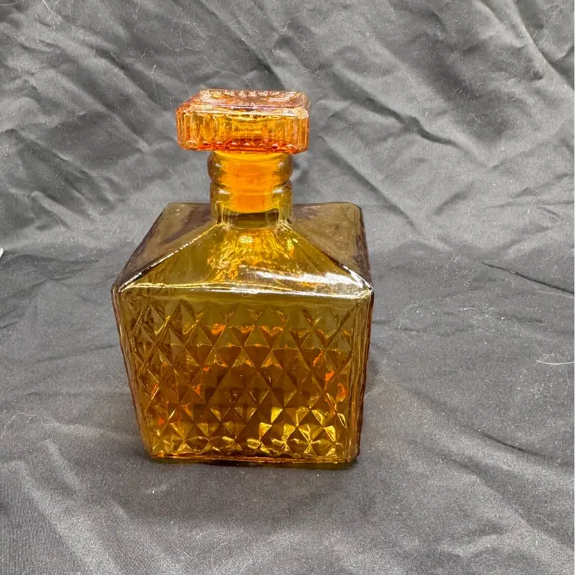 Vintage diamond patterned amber glass small, stout decanter. Excellent condition. No chips, no cracks. See pictures for measurements.