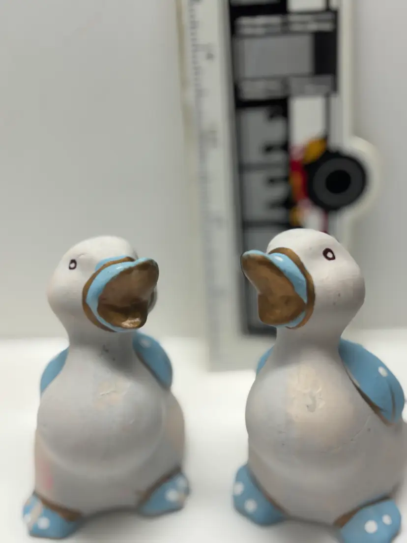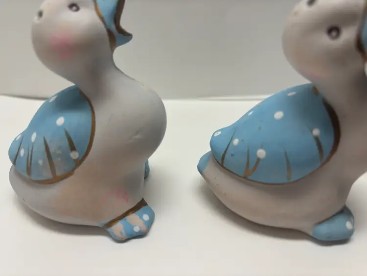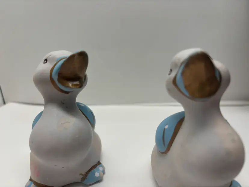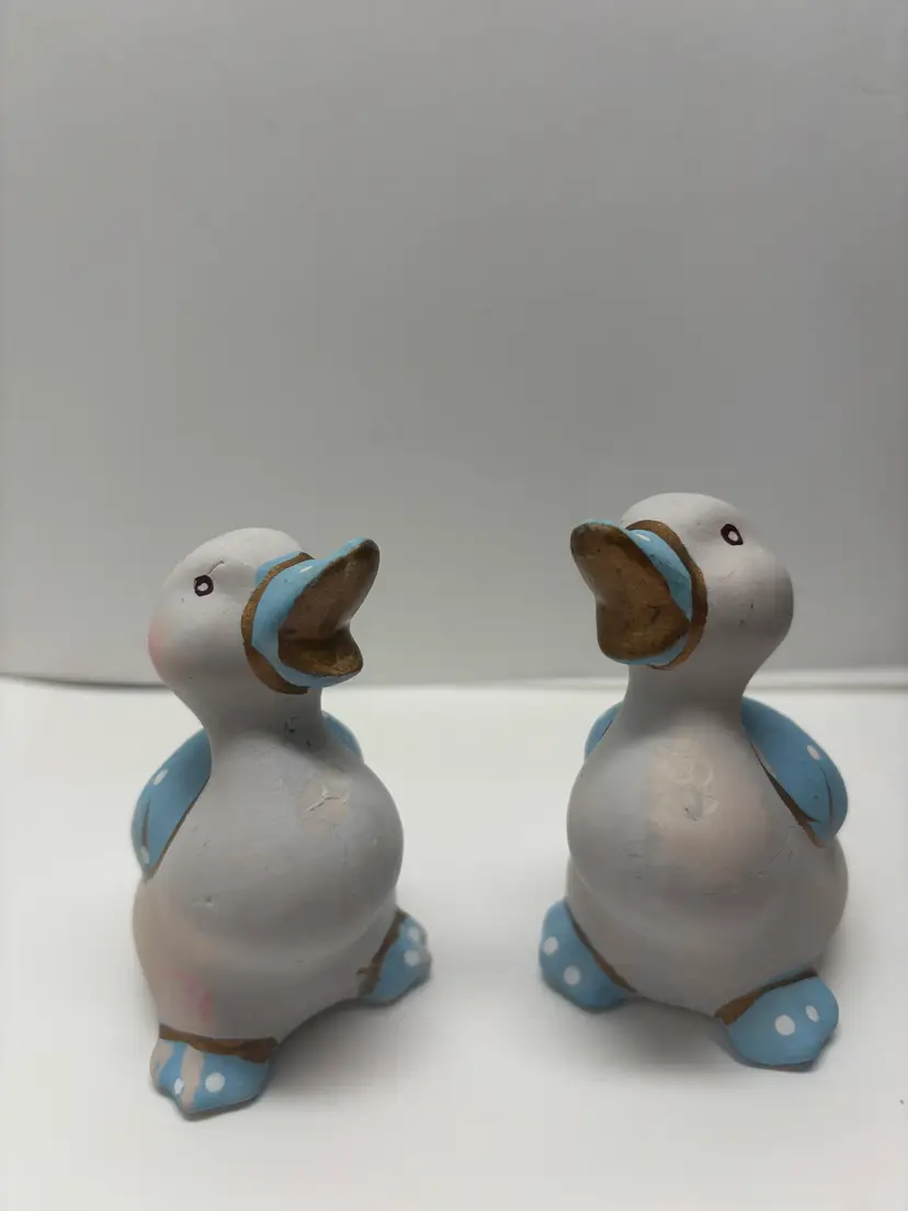 Pair of Blue Duck Shakers VTG probably from 1980's. Well loved Noted what may be a hairline fracture, no liquids escaped when tested. Adorable for Easter display, country kitchen display or craft project. Would look adorable painted a fun Spring Color Original plastic rubber stoppers! Stand approximately 3" in height No markings or labels