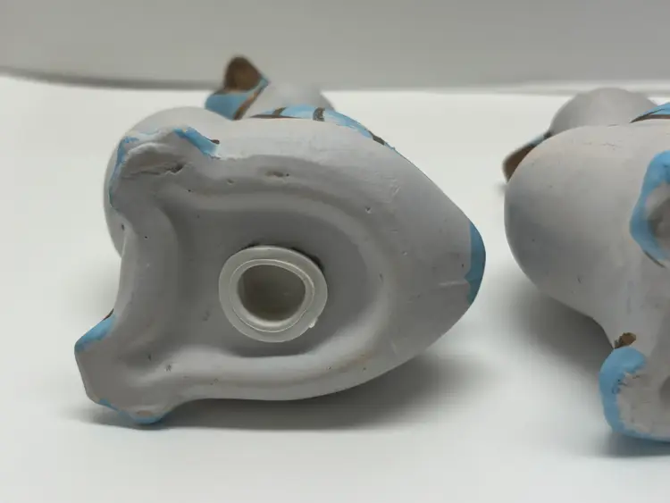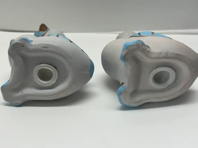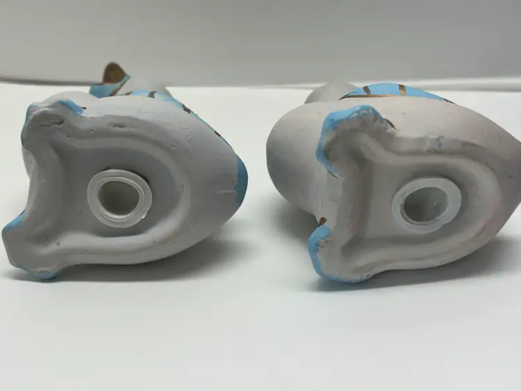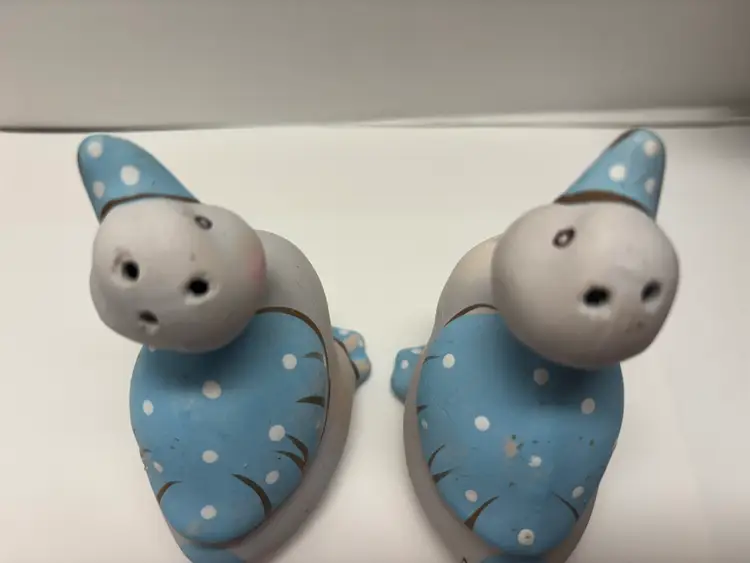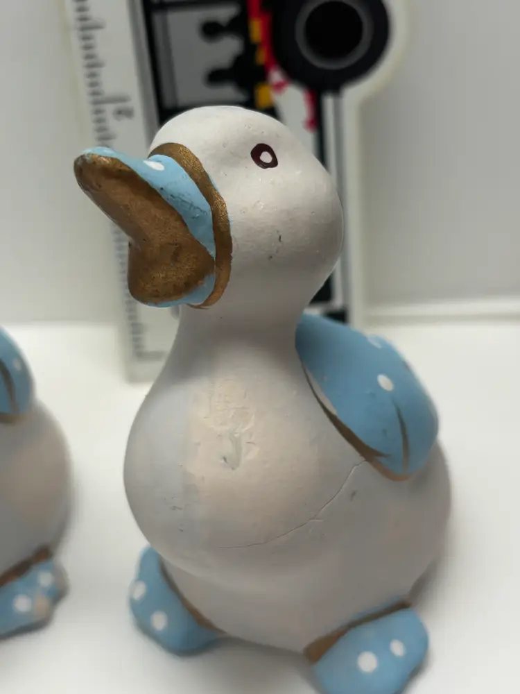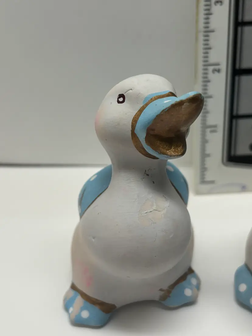 Pair of Blue Duck Shakers VTG probably from 1980's. Well loved Noted what may be a hairline fracture, no liquids escaped when tested. Adorable for Easter display, country kitchen display or craft project. Would look adorable painted a fun Spring Color Original plastic rubber stoppers! Stand approximately 3" in height No markings or labels