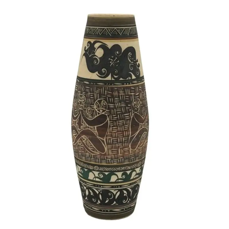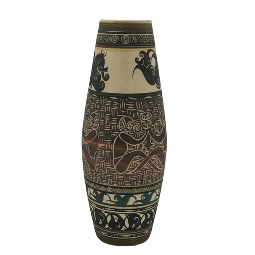 Vtg Earthenware Pottery Tribal Vase Handmade Painted Etched Brown Malaysia 15.5"
