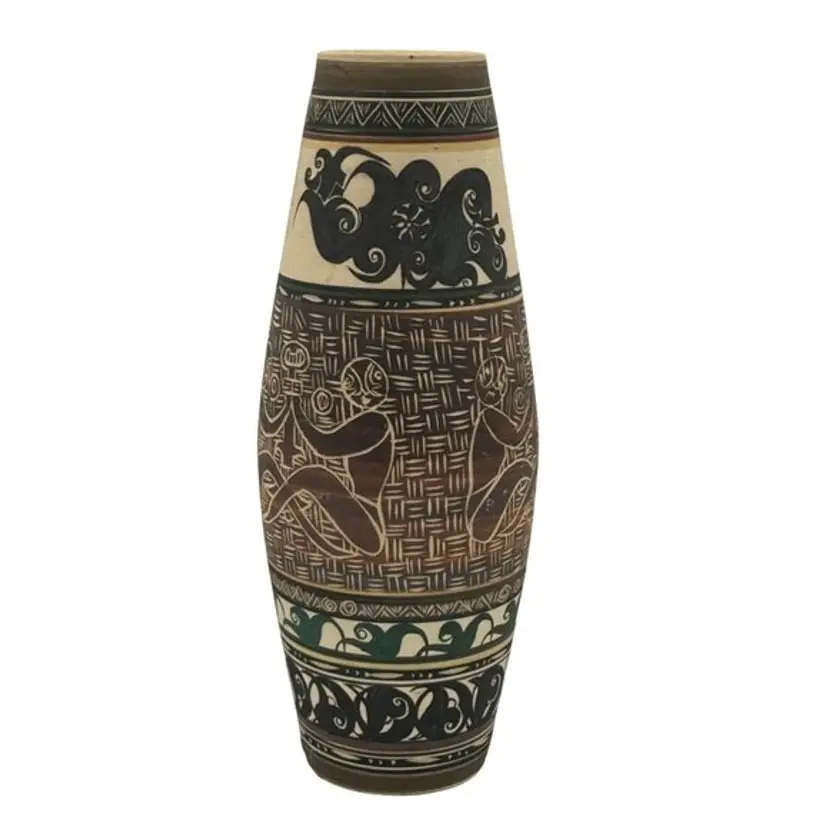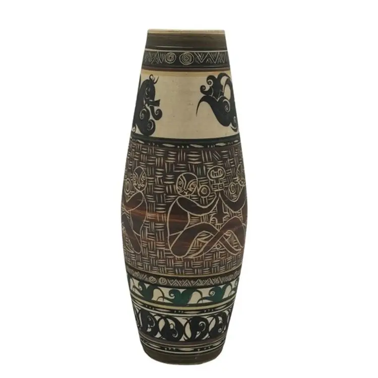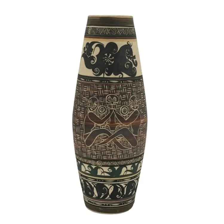 This is an Earthenware Pottery Vase Very Tall Handmade Painted and Etched with a Tribal Motif, in Browns, Tans and Black Made in the Young Huat Heng Studio in Malaysia by Crafted Artists