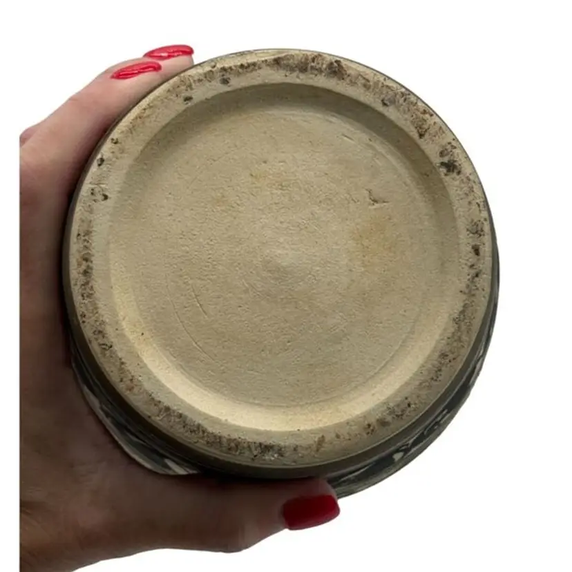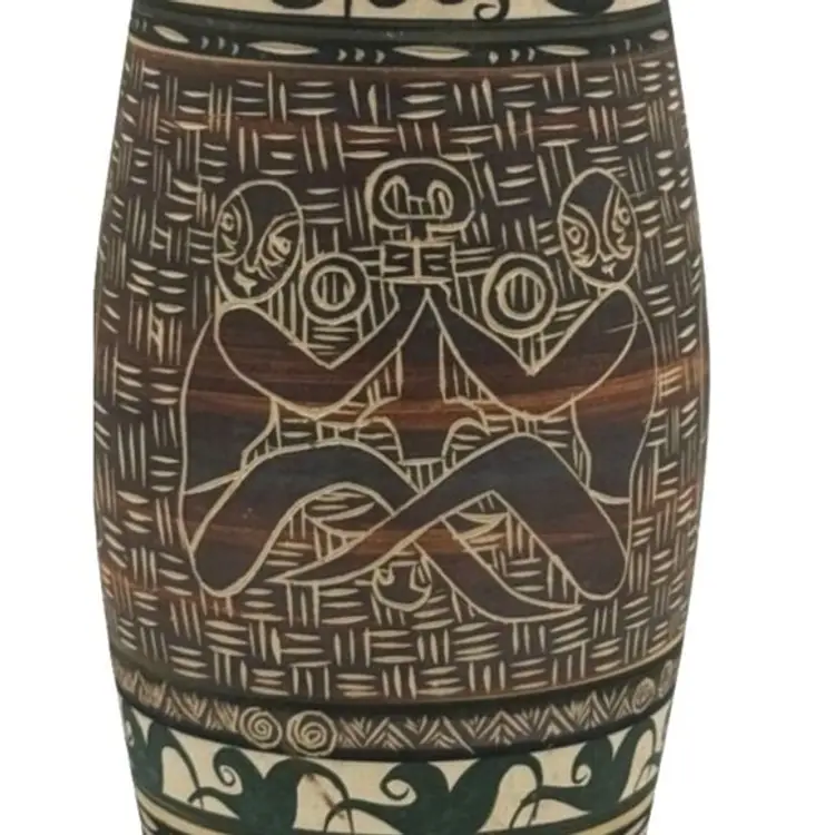 • Handmade and unique • Painted and etched tribal design • Vintage Malaysian piece • Durable earthenware pottery • Elegant brown and black hues • Ideal for home decor • Perfect for collectors