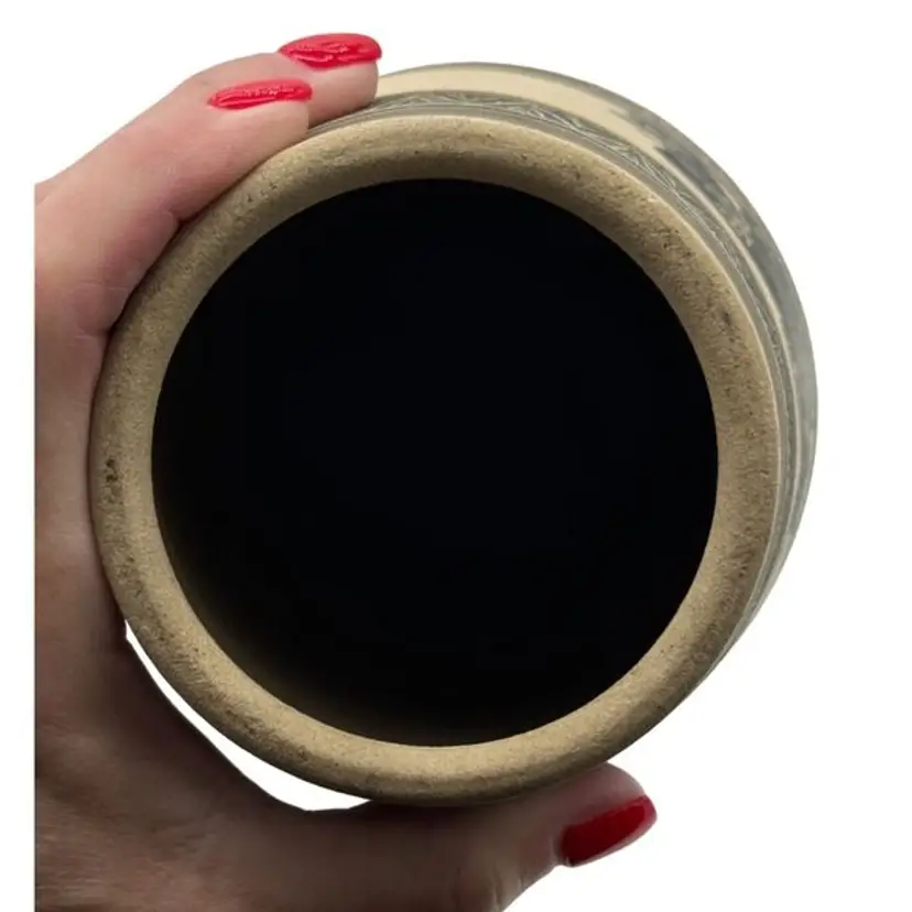 Style: Tribal Vase / ETCHED / HAND PAINTED / VINTAGE / Handmade. Material: EARTHENWARE POTTERY. Color: Browns, Tans and Blacks