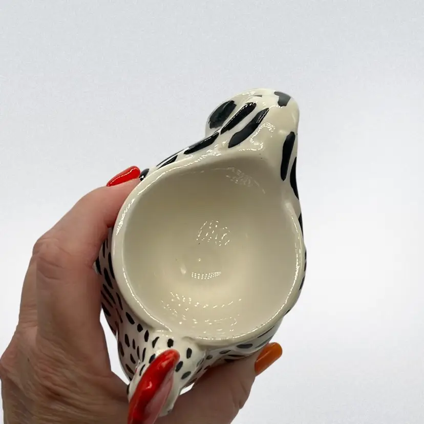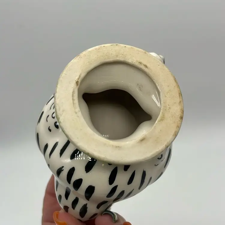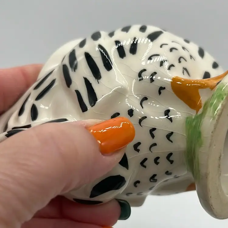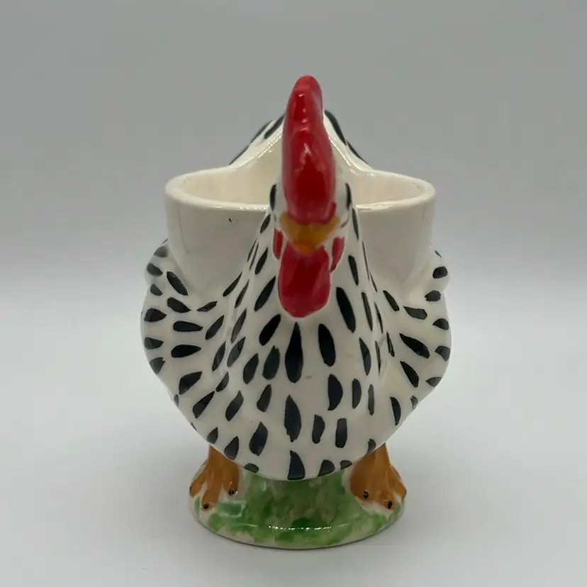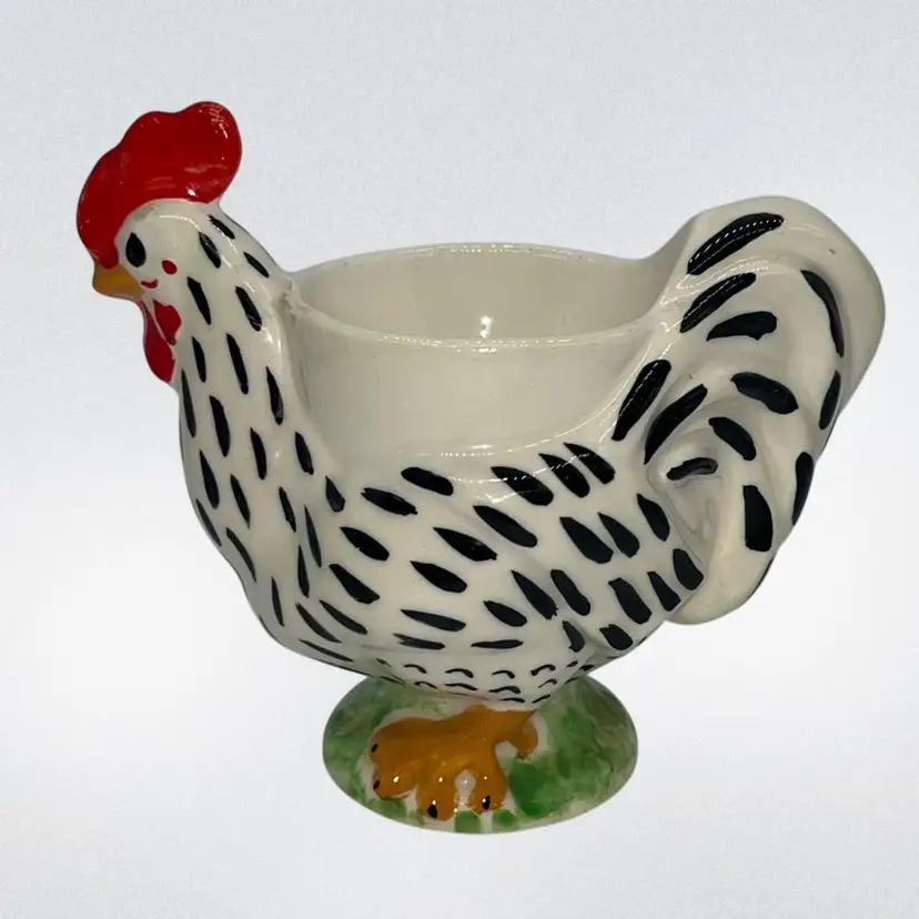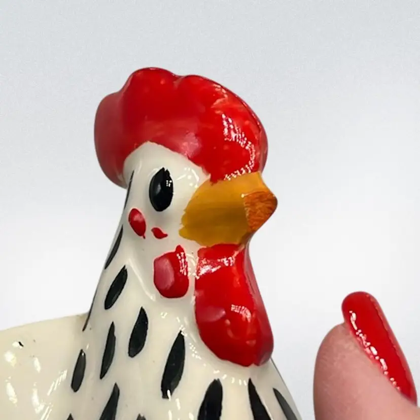 Shows a little crazing on the outside. Black and white. Small chip on beak (attempted repair with colored sharpie) otherwise in great vintage condition! This rooster is at least 35-40 years old maybe more! Approx: 4.75” w x 4.25” h x 3”d
