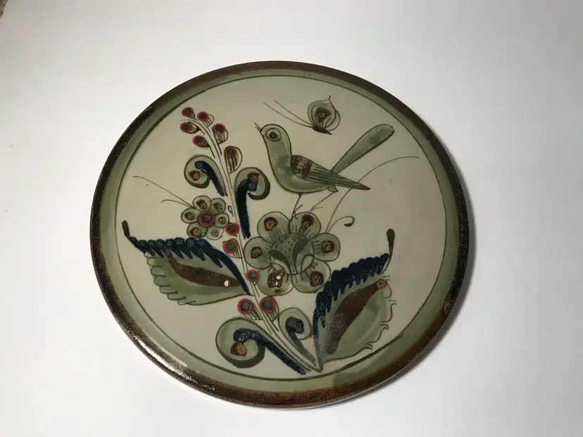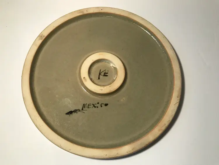 No chips or cracks great condition Signed "KE Mexico w/ a Bug" Features a bird sitting on a flowered plant