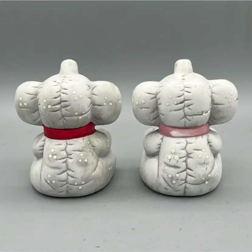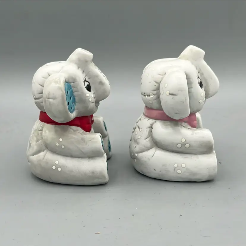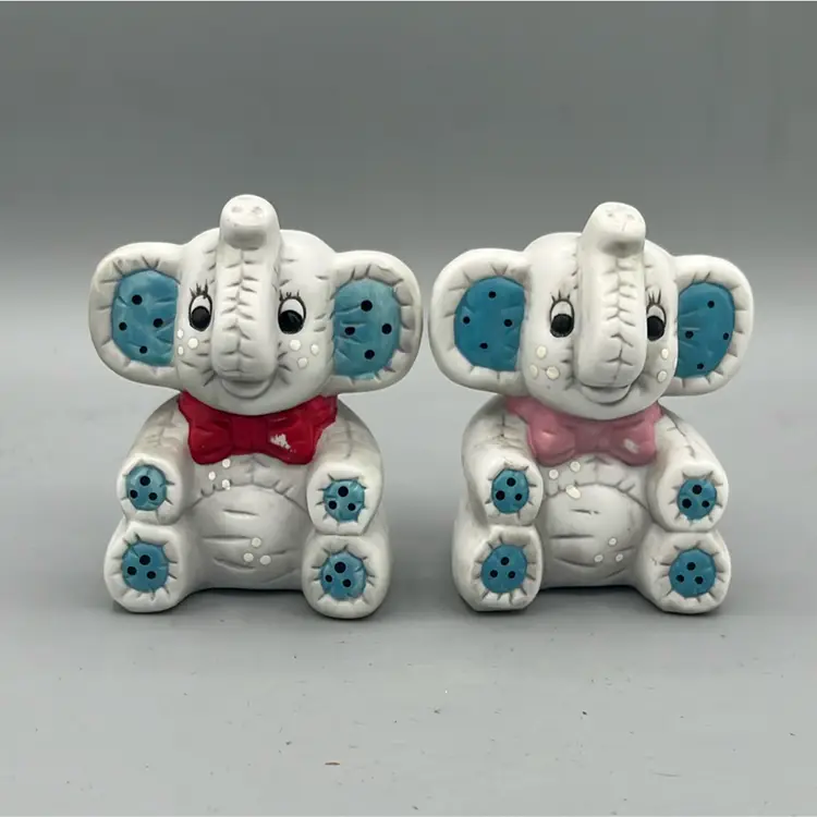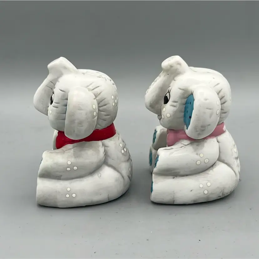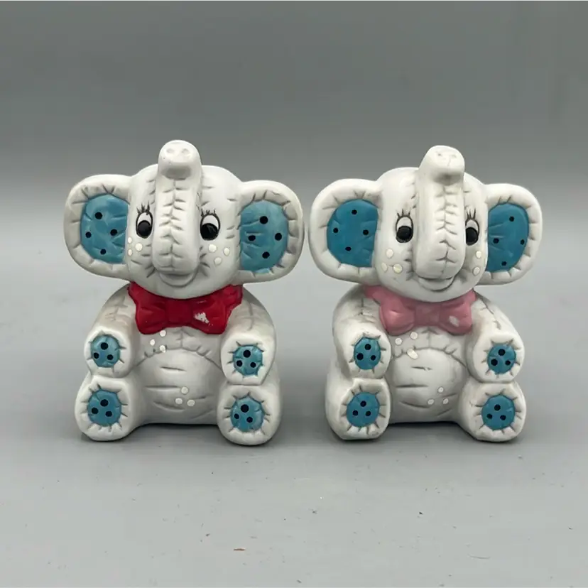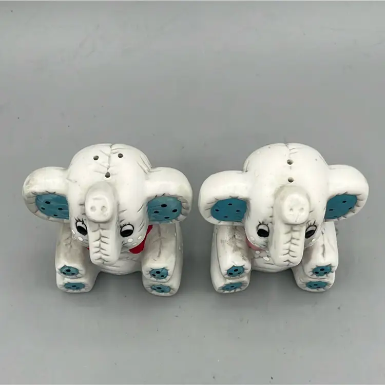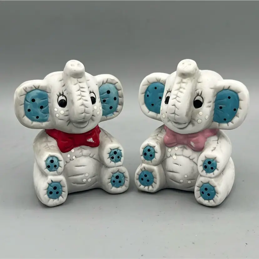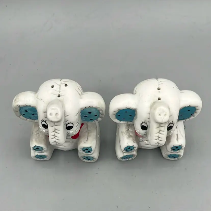 Sweet ceramic elephant salt and pepper shakers! Trunks are up for good luck! Both have original stoppers, though they are yellowed.