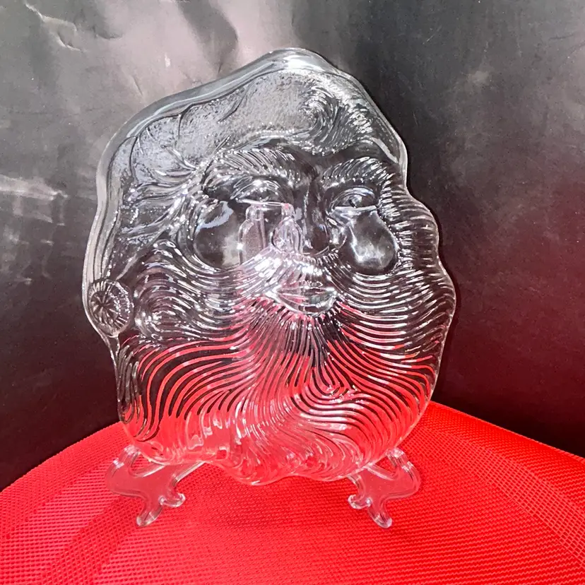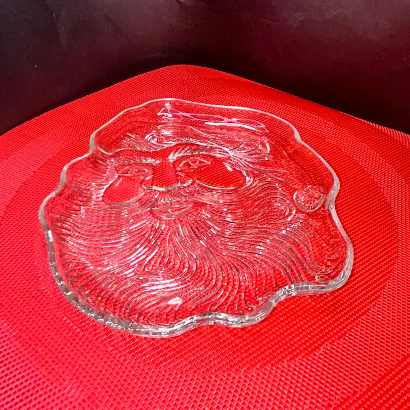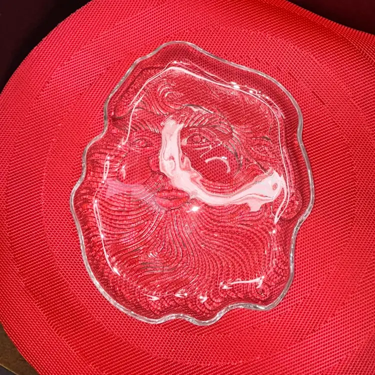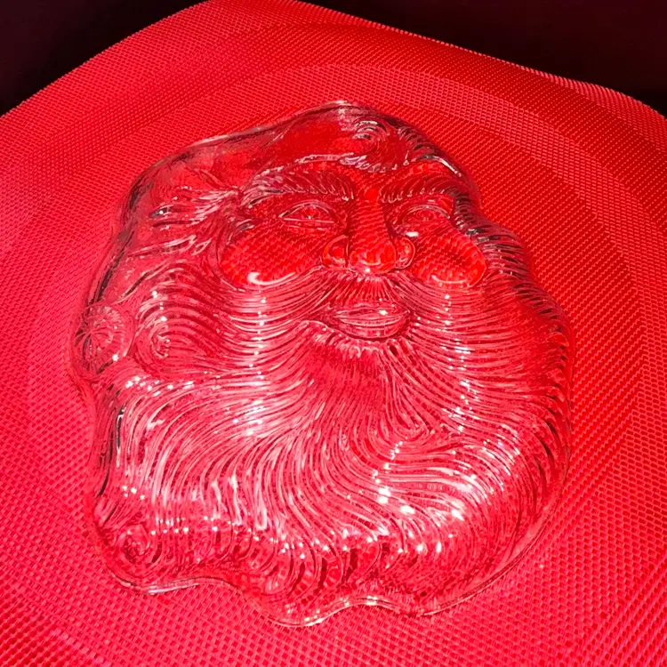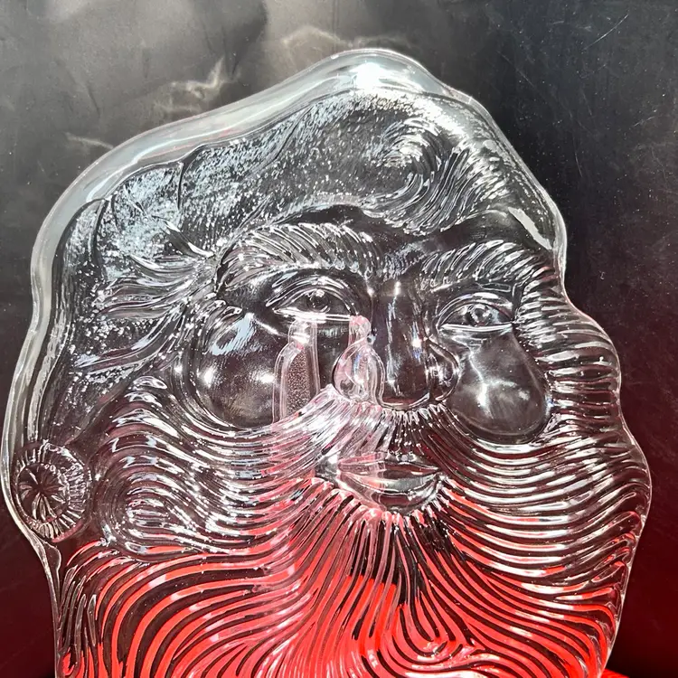 7” x 8”. Smiling clear glass, Santa plate. Excellent condition. No chips or cracks.