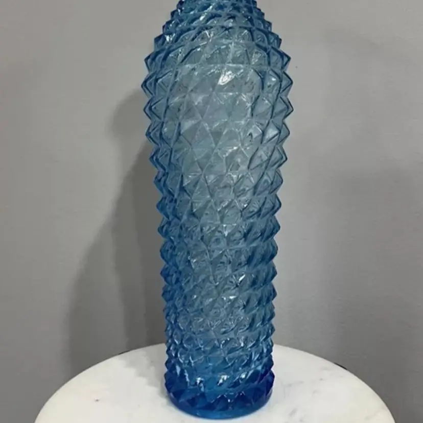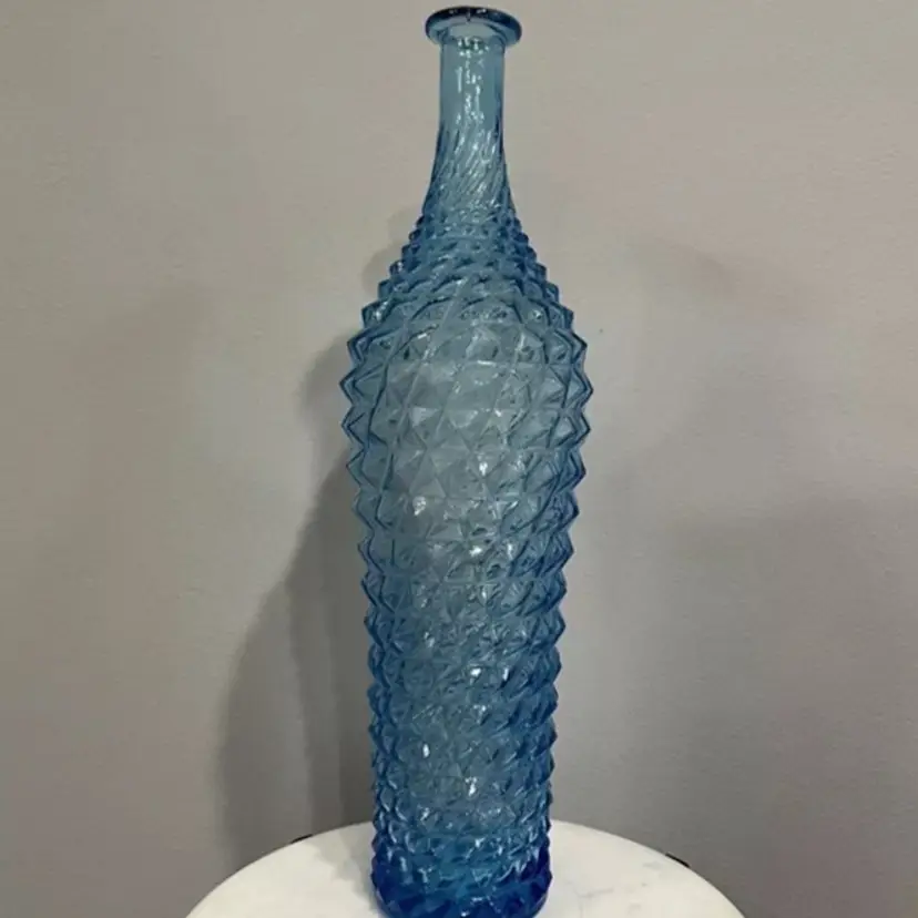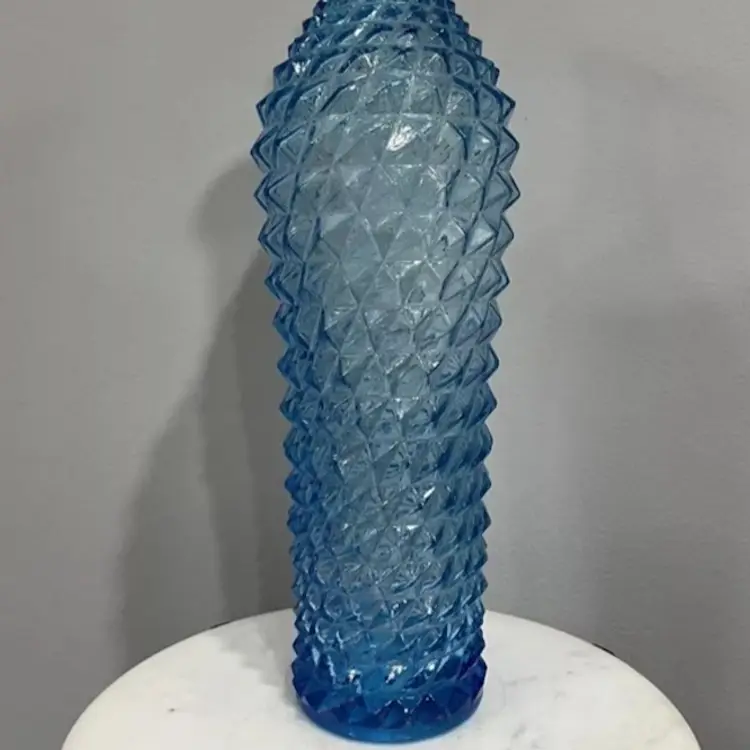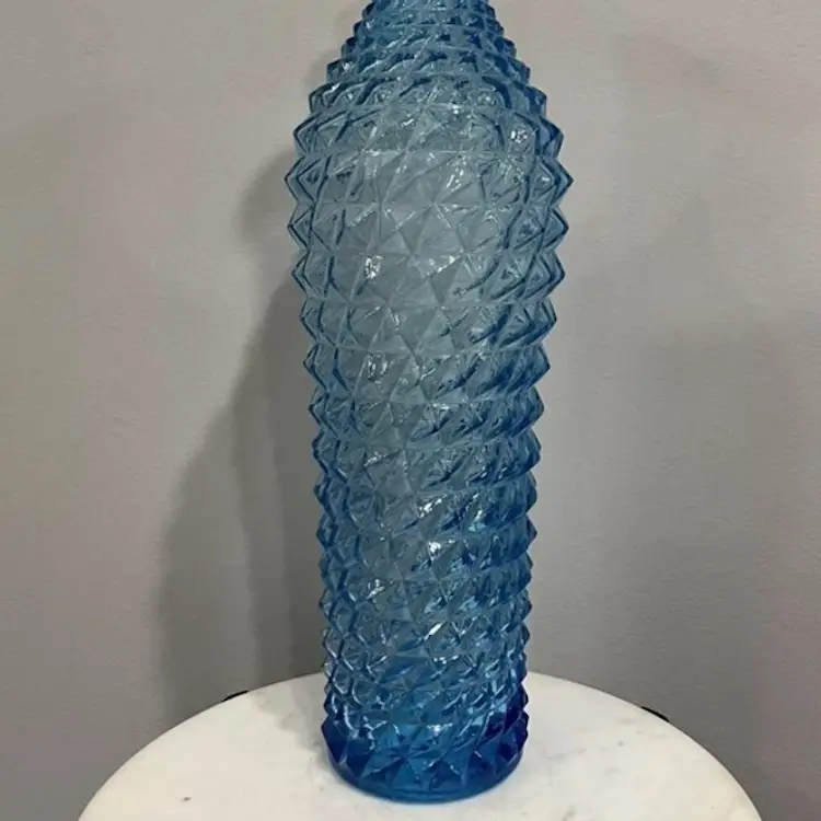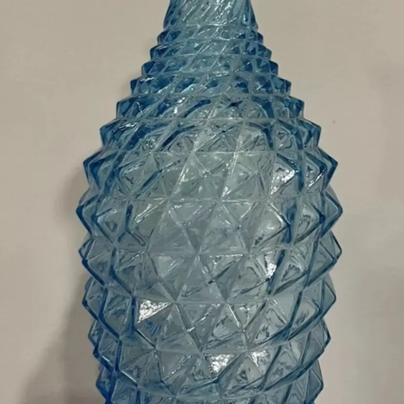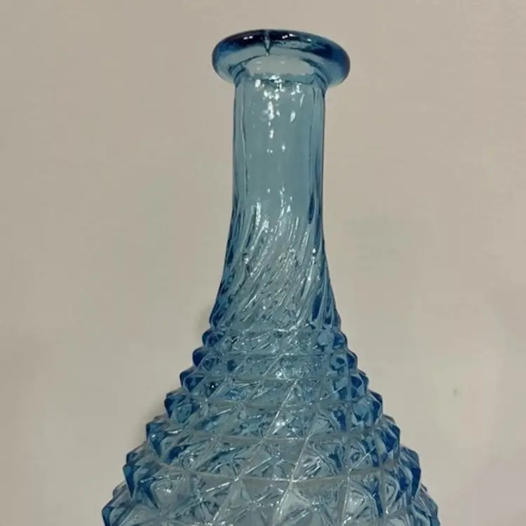 In decent condition for its age. There is one small flea bite found on one of the points as shown. Bottle has been cleaned, but there is one dark area that we’re unable to clean that’s on the inside of the bottle (see photos). Some bubbles within the glass from production. Measures approximately 16” tall and 4.5” wide. Message me with any questions.