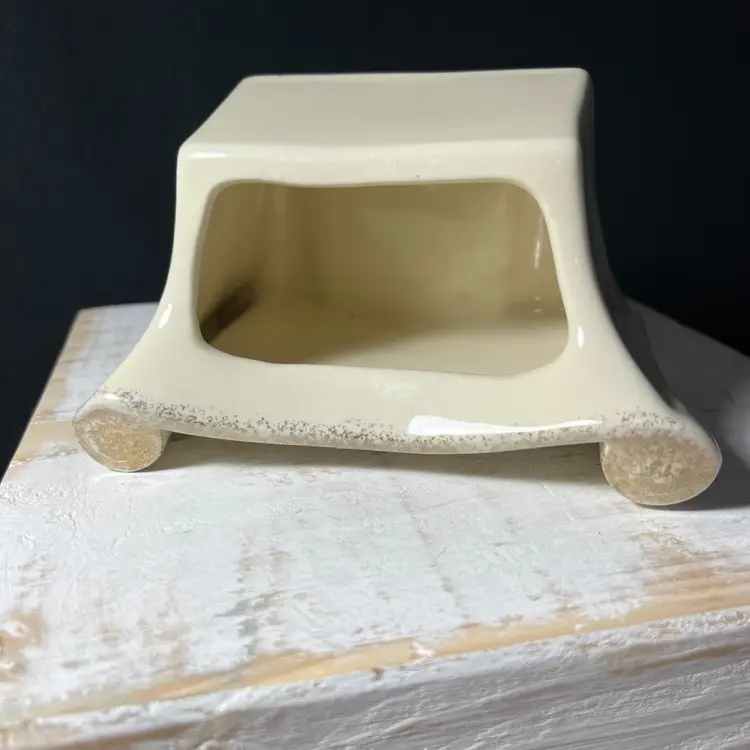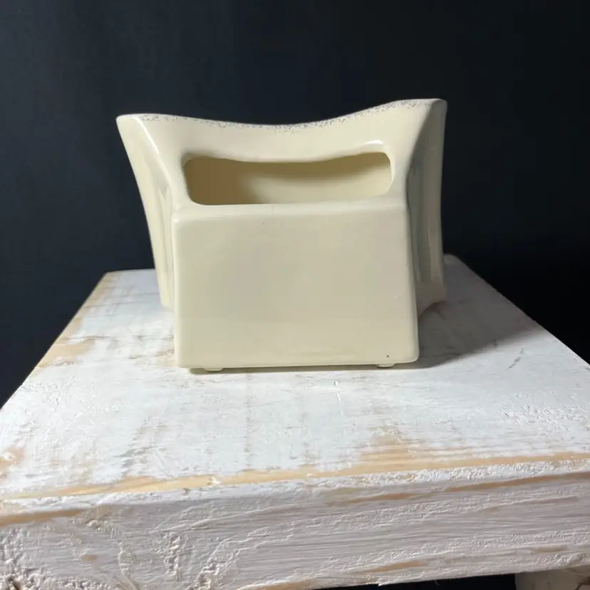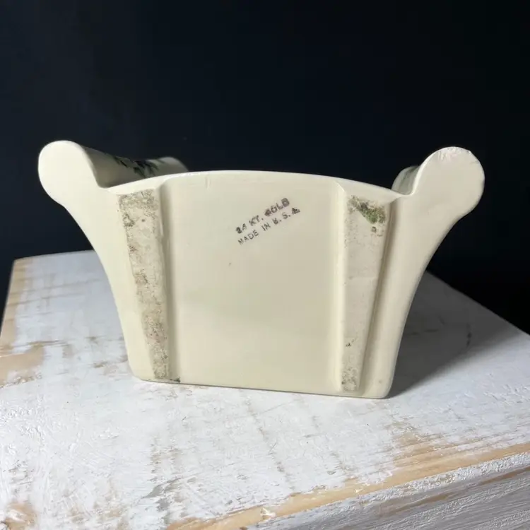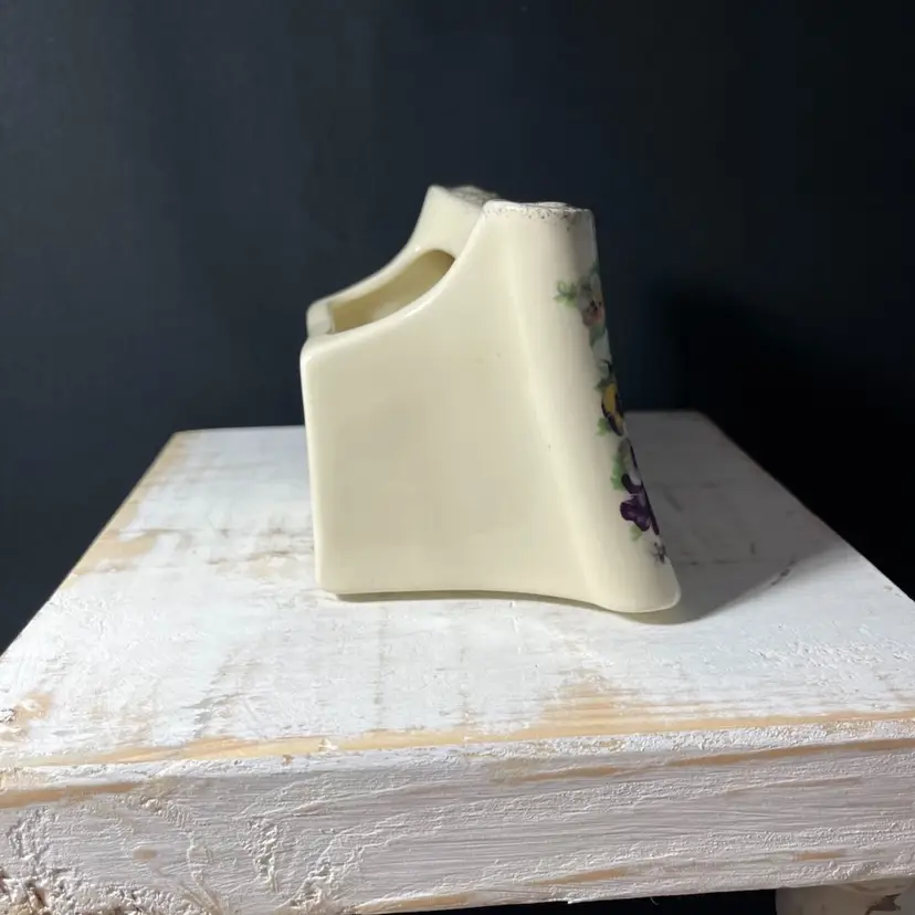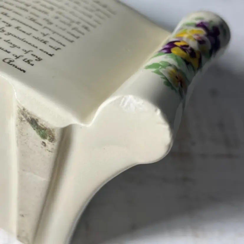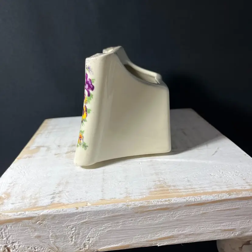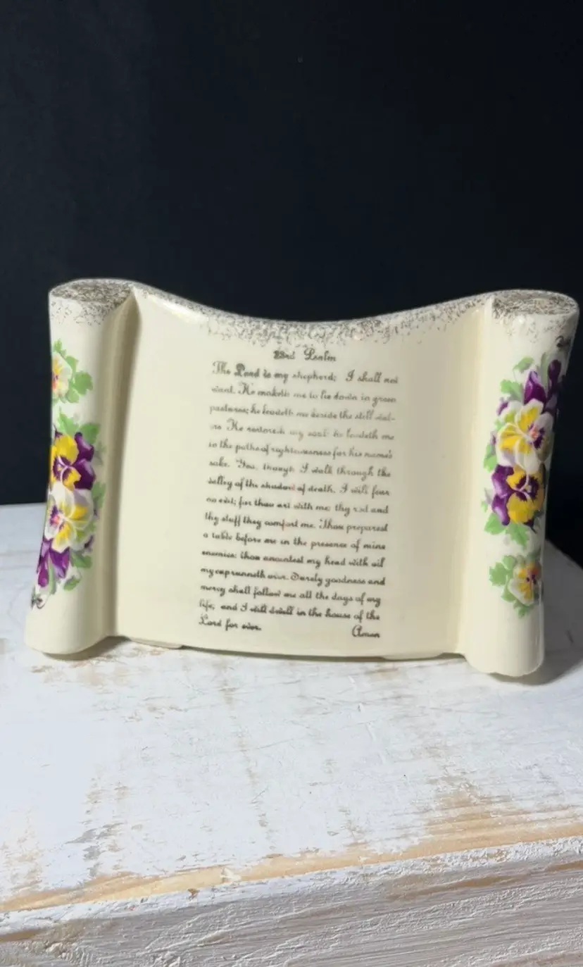 #967 VTG Enesco Porcelain Scroll Shaped Planter With Pansies and 23rd Psalm in 24kt Gold made in USA. Measures 5.25” x 3.75”. One chip on the front right bottom(SEE LAST PHOTO).