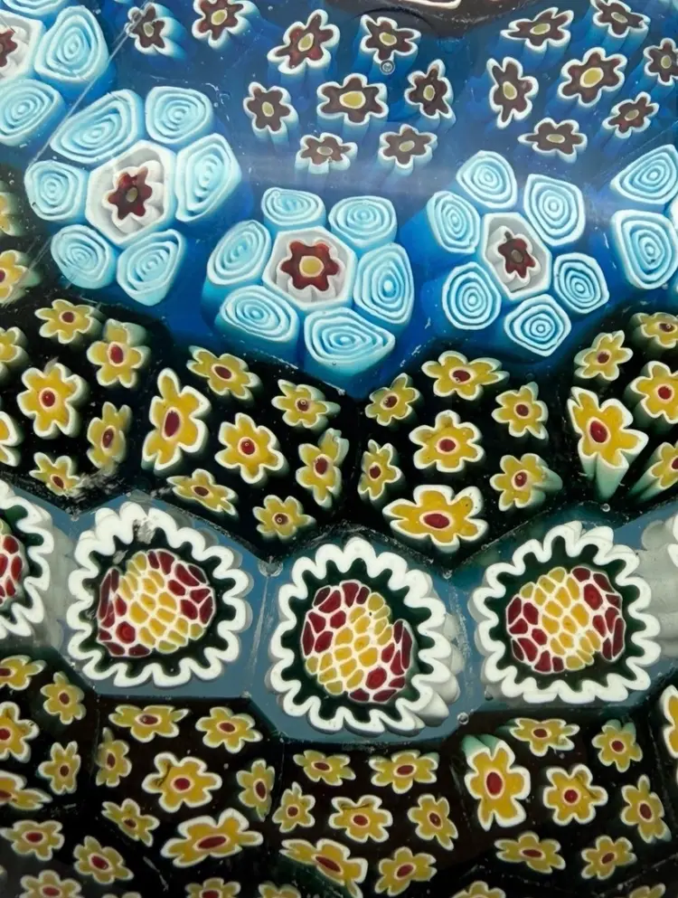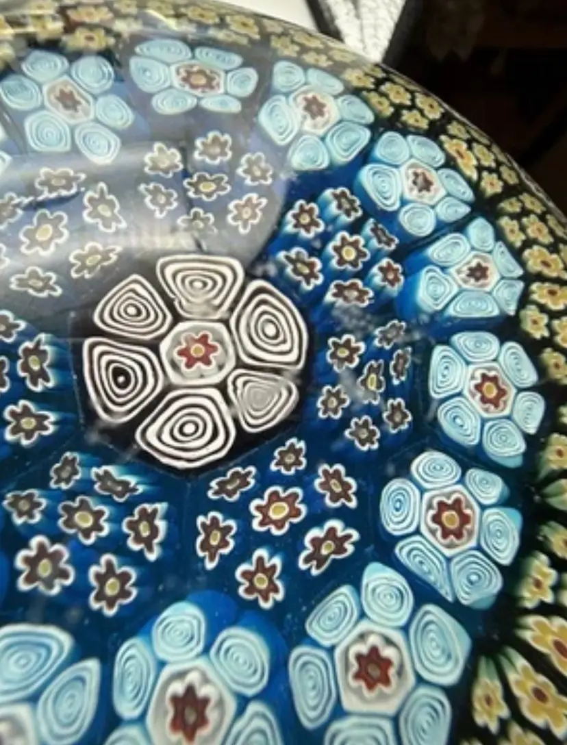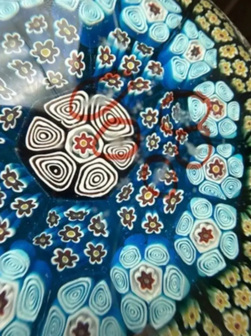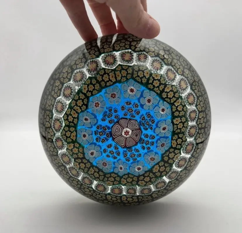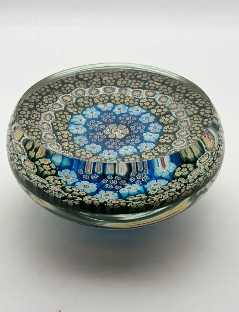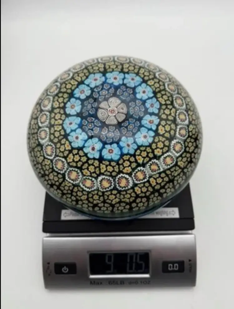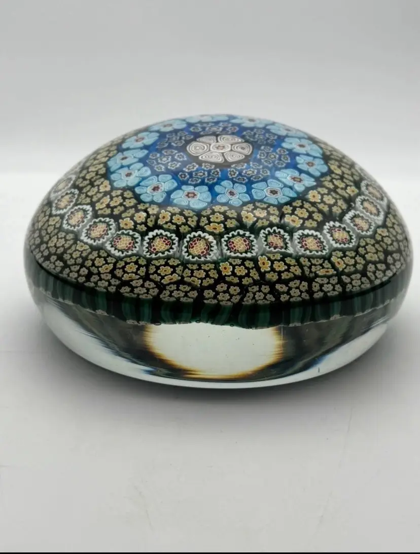 9” diameter, 4” tall, 6” diameter on flat portion of base Has surface wear on bottom and scratches on top of dome (see photos) Paperweight Heaven Facebook group stated it is Albertini, Lunetta and Todesco Murano Furnace Unsigned