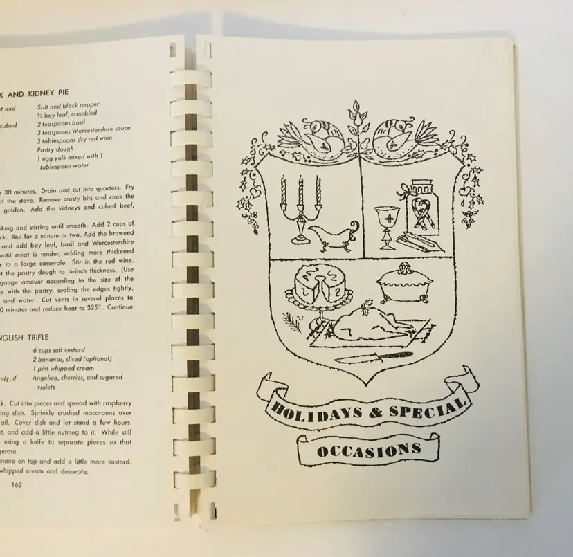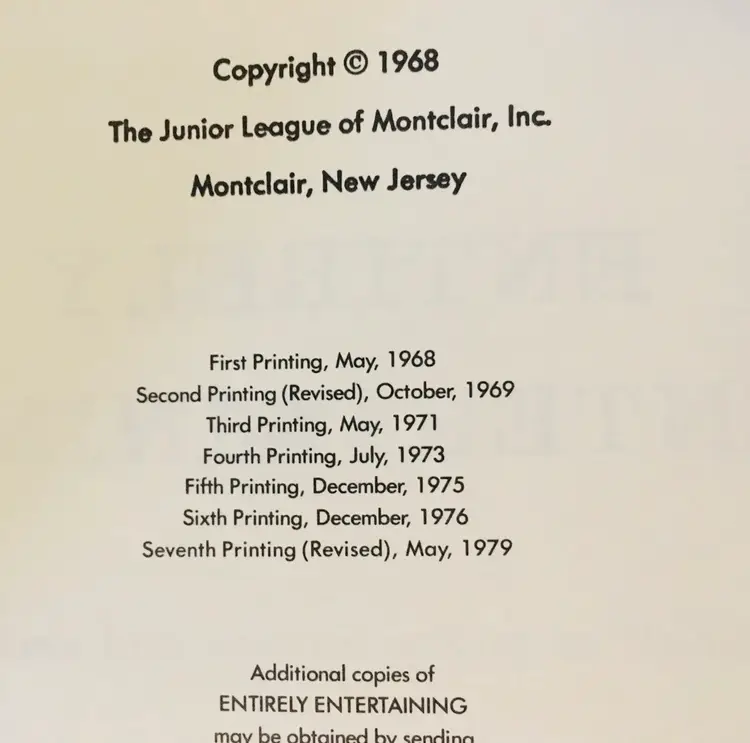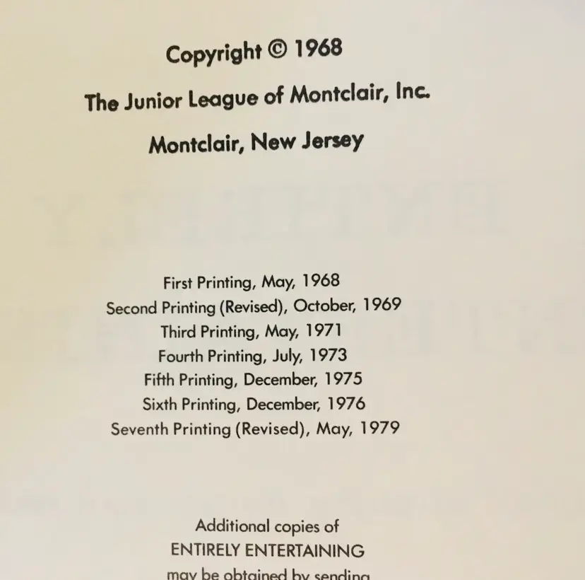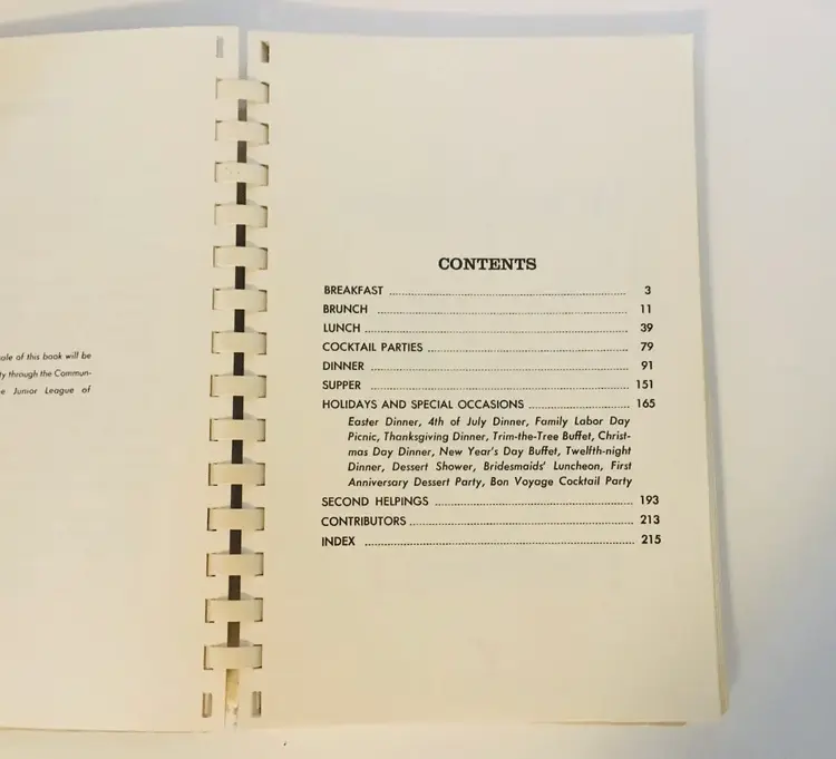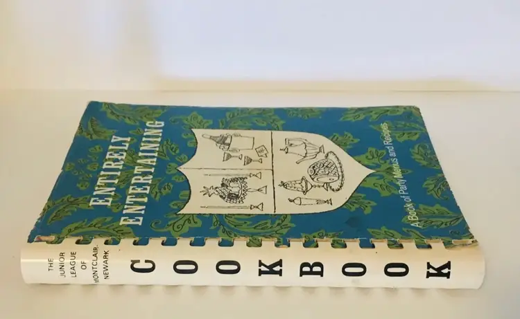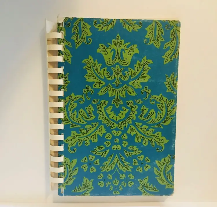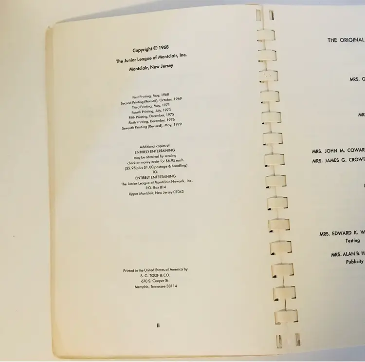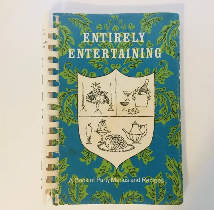 Originally printed in 1968. This is the 7th printing from 1979. Mod blue & green cover. Spiral bound. Cookbook for parties & entertaining. One page is bunny eared. Couple of small food stains here & there. Binding has come out of top slot.