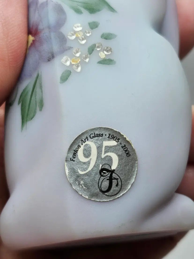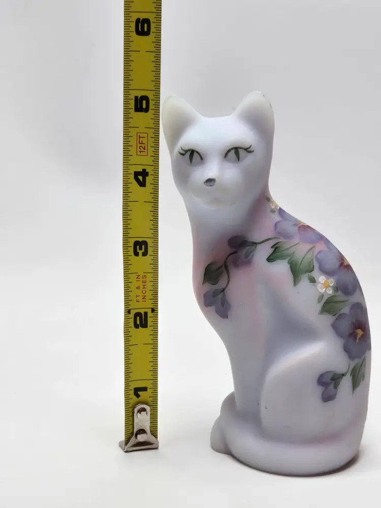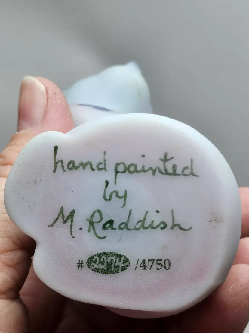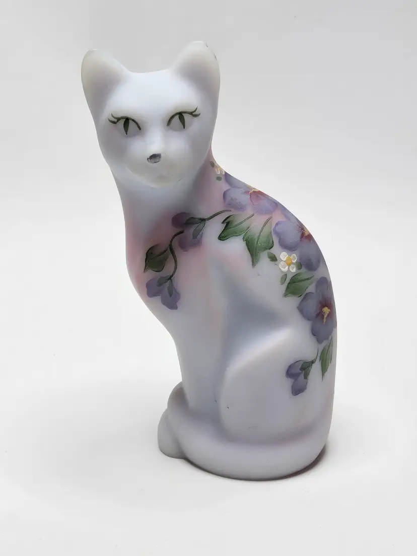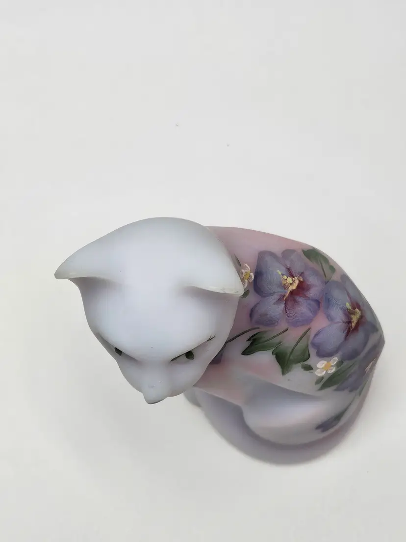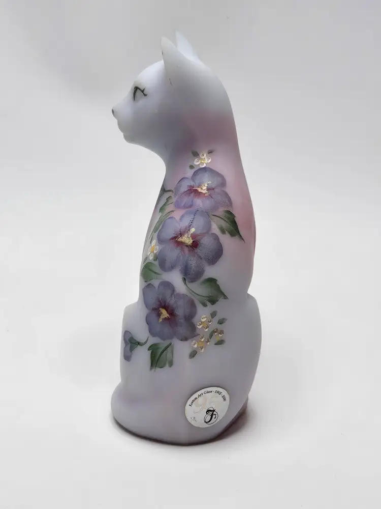 This exquisite Fenton figurine features a beautiful blue Burmese cat adorned with hand-painted hibiscus flowers. The piece is a limited edition, signed by artist M. Raddish and boasts a matte finish. The cat is a vintage item, produced in the United States during the 1990s, and is part of the art glass production style.