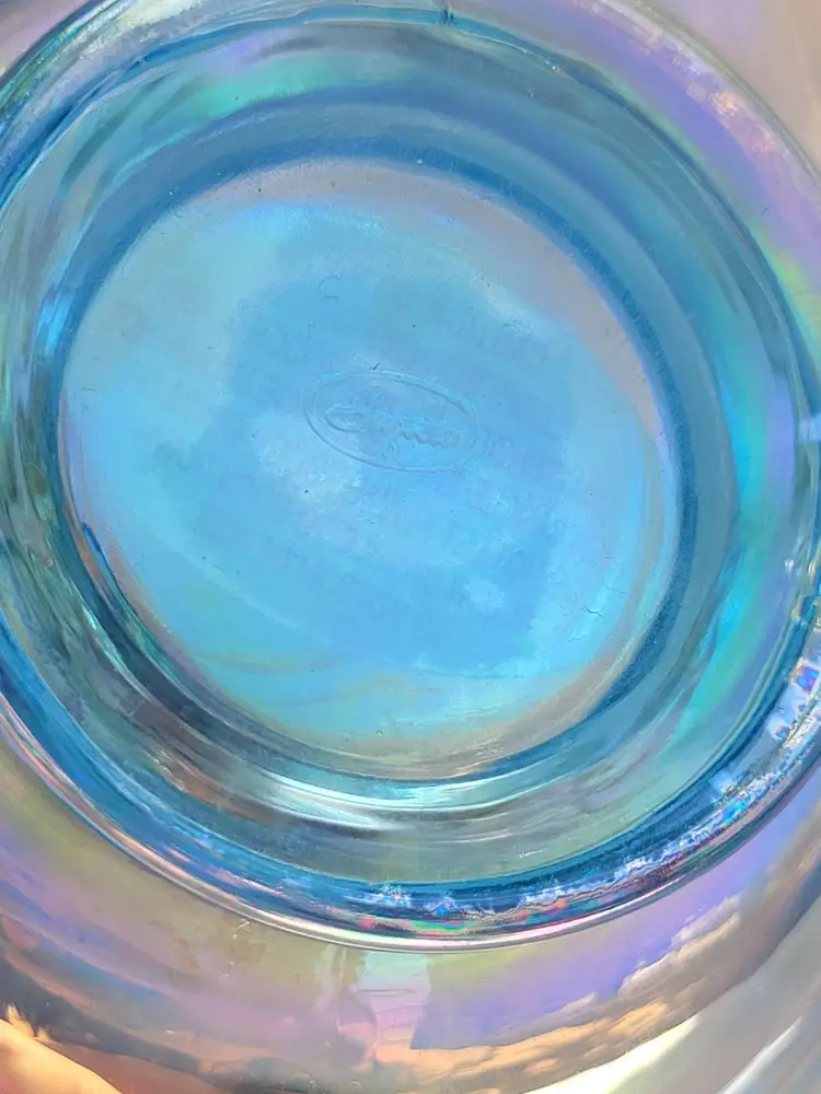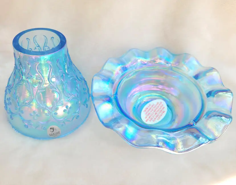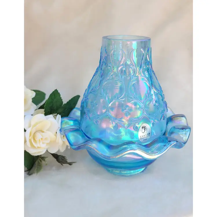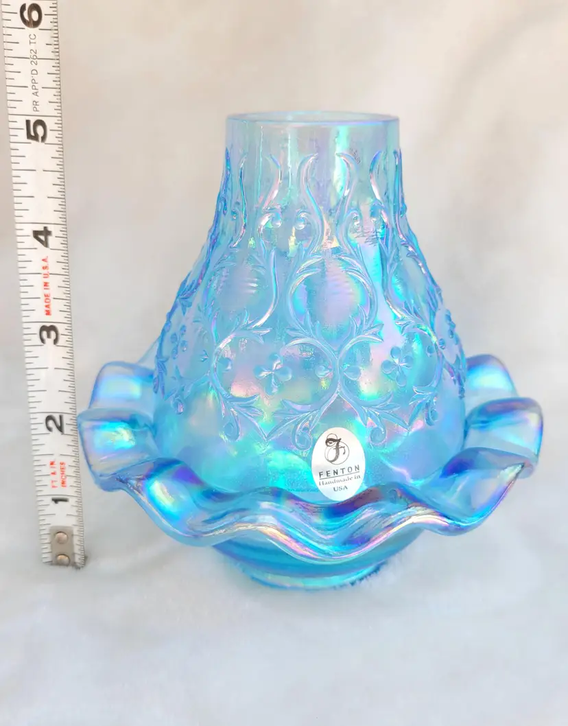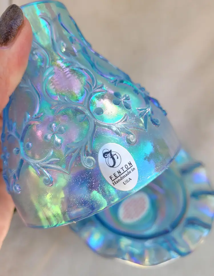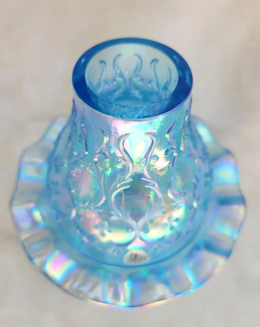 Ethereal opalescent blue carnival glass fairy lamp by famed glassmaker Fenton, with the original sticker. This is an early 1900s Fenton pattern that was brought back in the 70s which was when this was made. In good condition with no flaws that I could see, please see pictures for details and measurements.