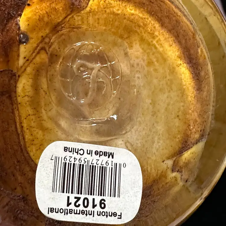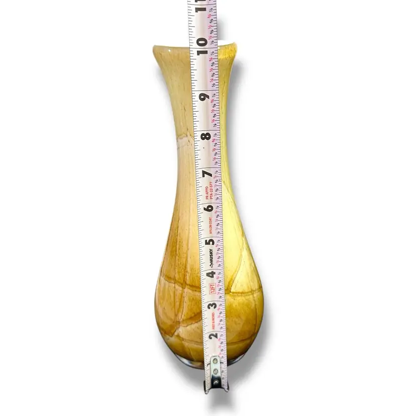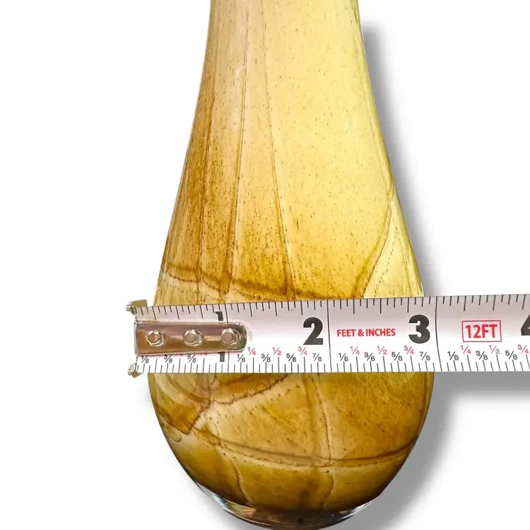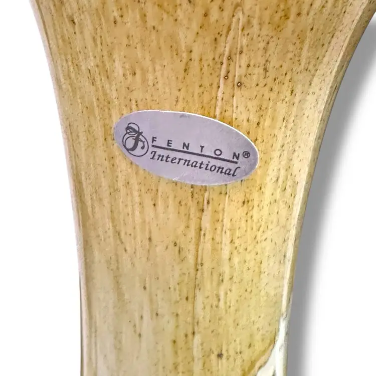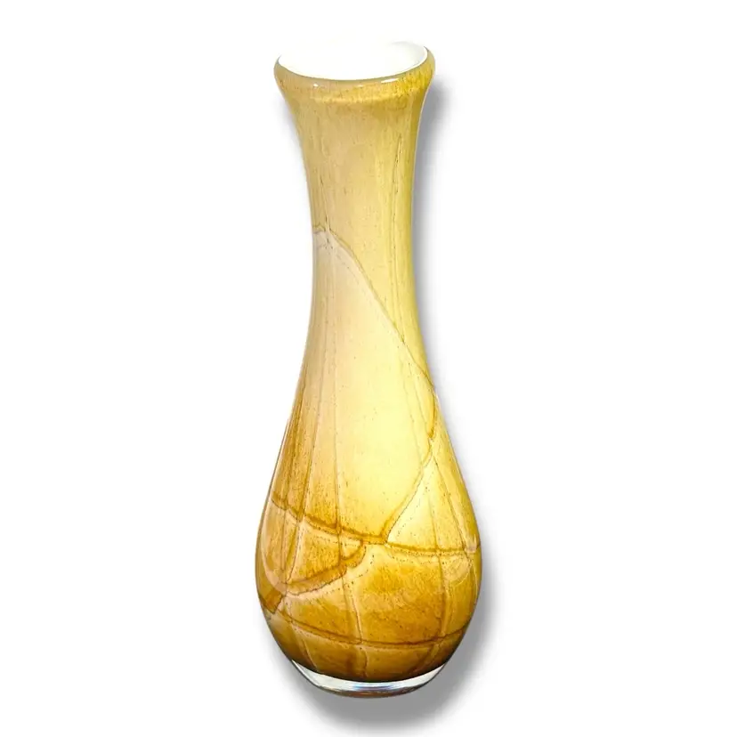 This Fenton International cased glass vase is a beautiful hand-blown piece featuring a unique abstract pattern in a striking yellow color. From the line called “golden sand“. With a height of 10 inches, this decorative vase is signed with a Fenton brand and bears the original sticker. This will be carefully packaged and shipped right away.