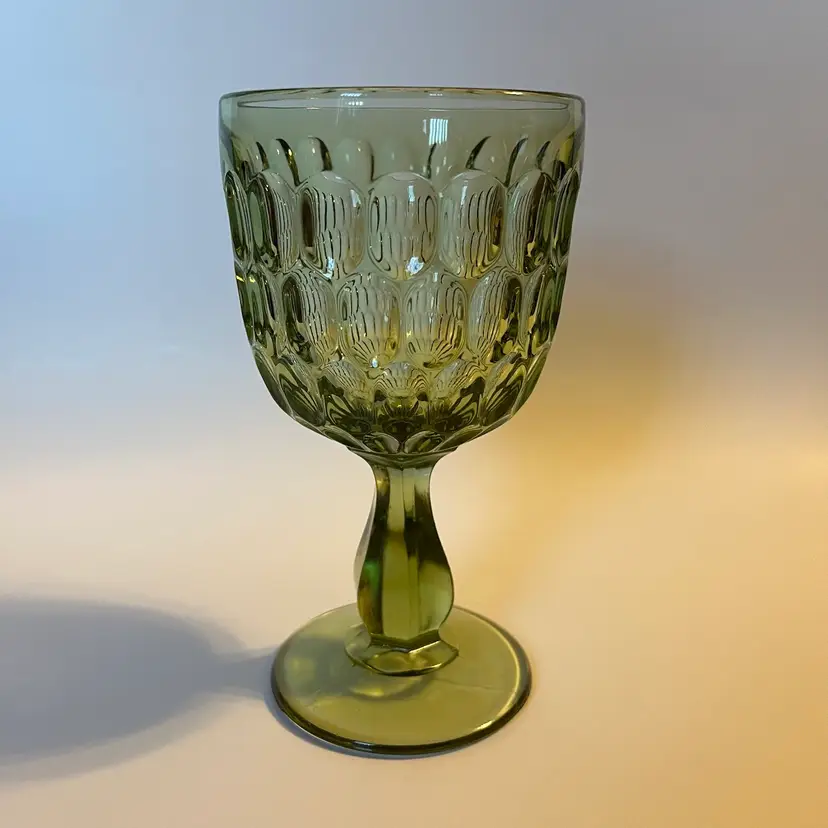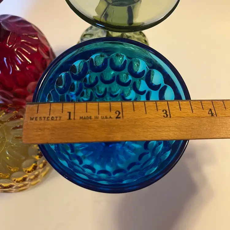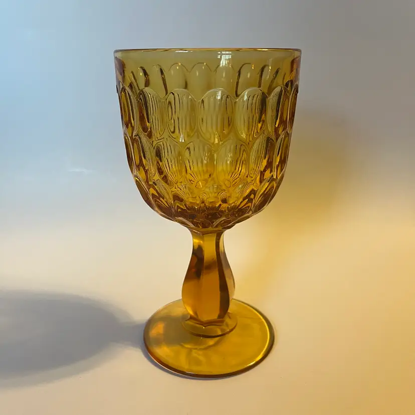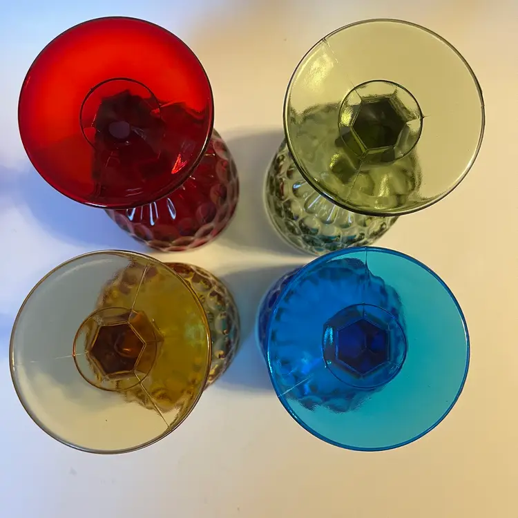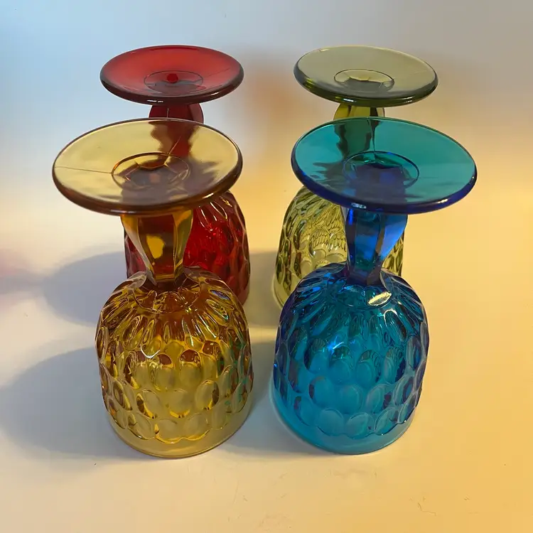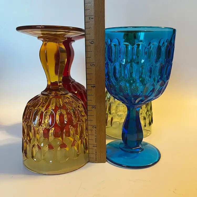 The glass is notably thick and durable, with each goblet weighing approx.1 lb—substantial in hand and beautifully balanced. The thumbprint pattern catches light, making these ideal for display or use. Excellent vintage condition with no chips or cracks. Colors remain vivid and surfaces glossy. SEE PHOTOS.