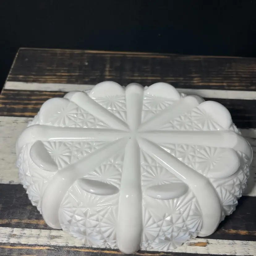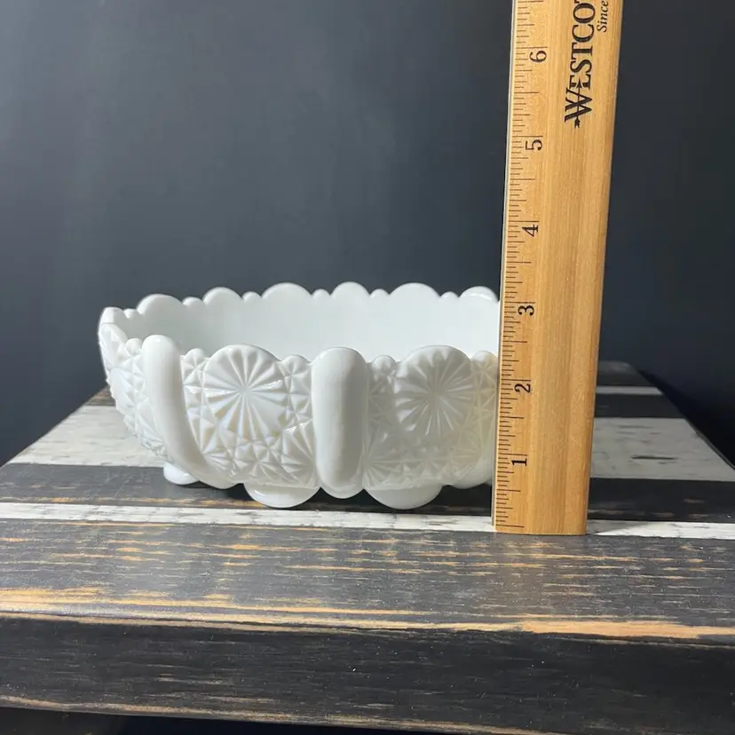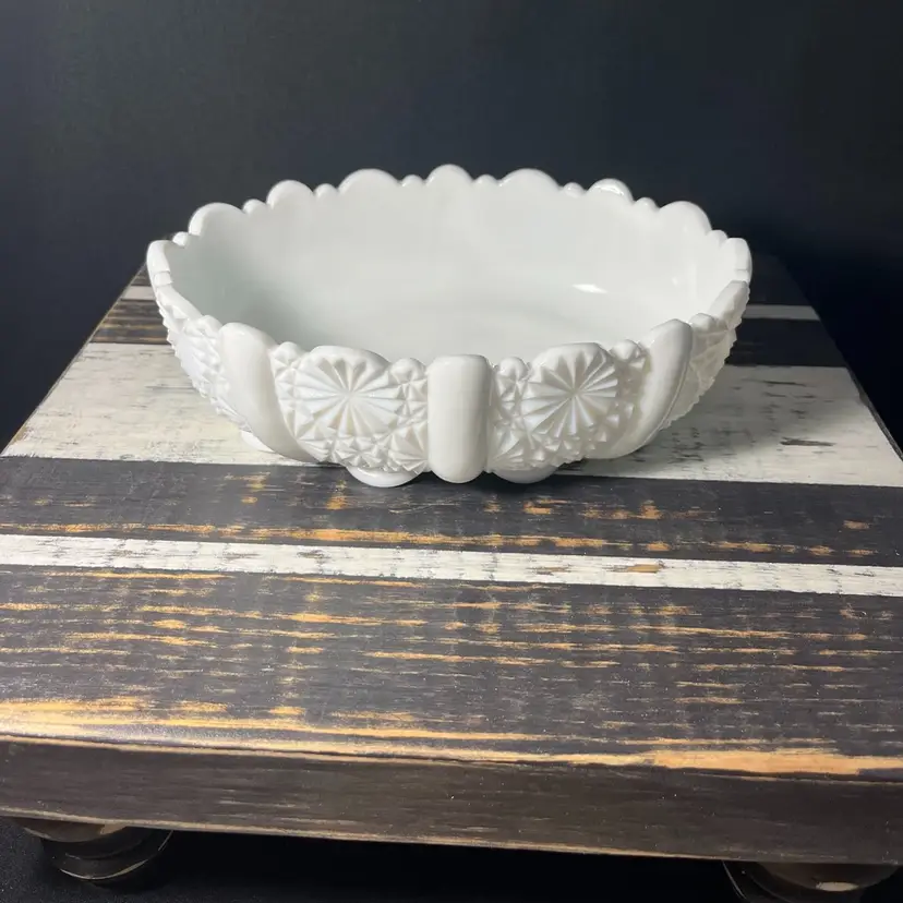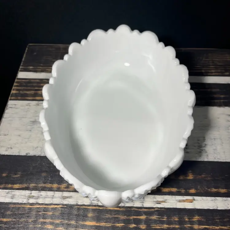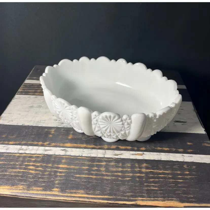 #1012 VTG Fenton Daisy & Button Scalloped Rim Footed Oval Milk Glass Candy Dish. Measures 7.5” x2.5” x 10”.