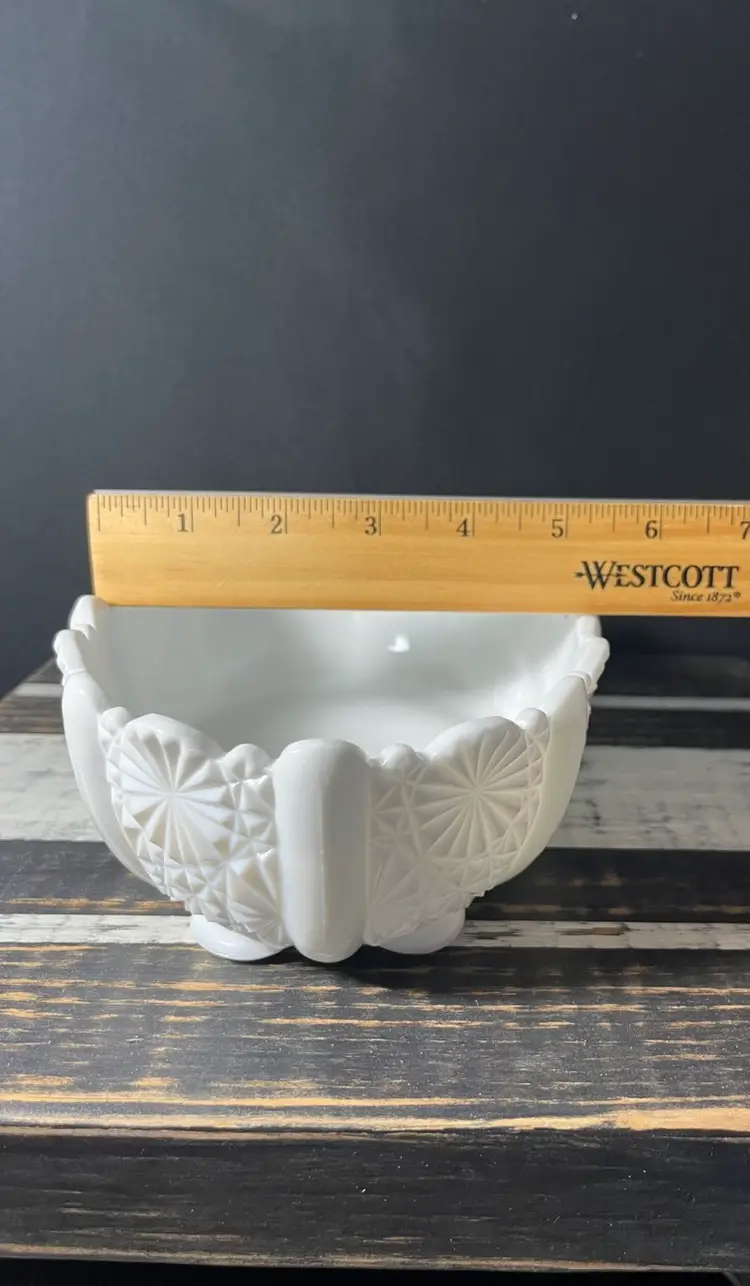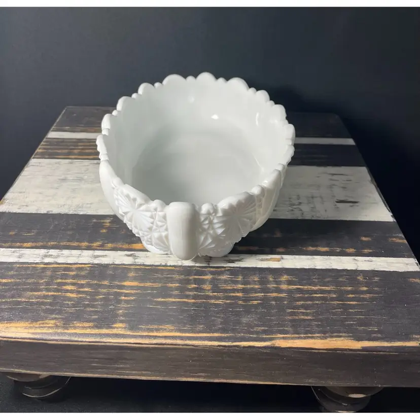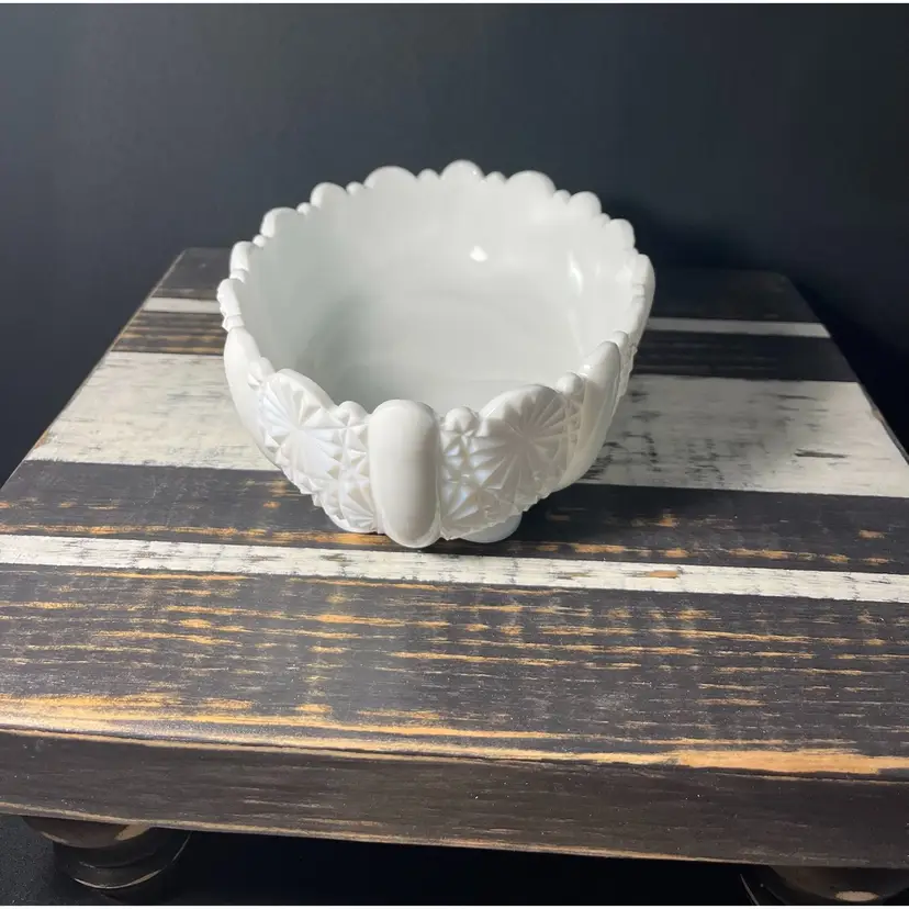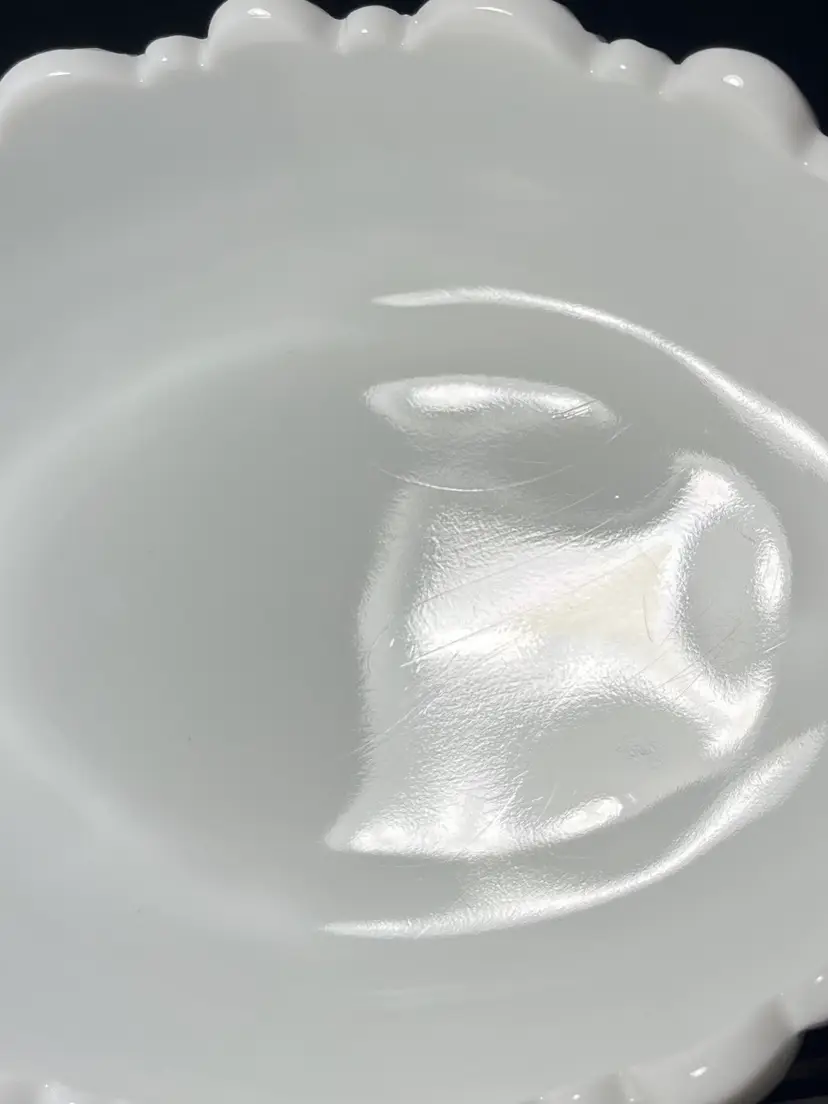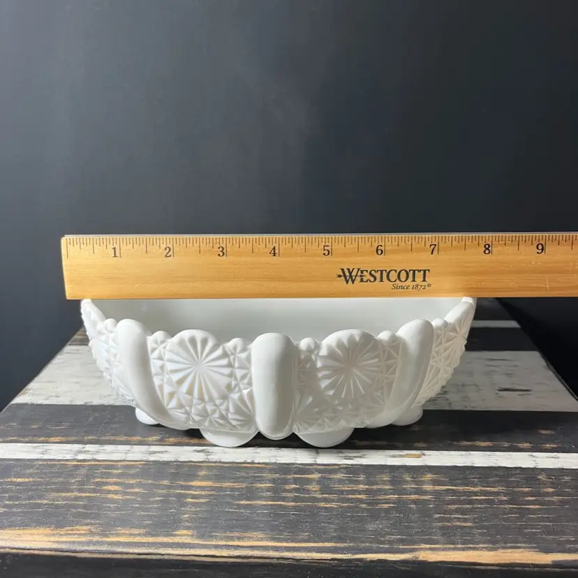 #1012 VTG Fenton Daisy & Button Scalloped Rim Footed Oval Milk Glass Candy Dish. Measures 7.5” x2.5” x 10”.
