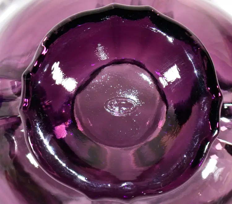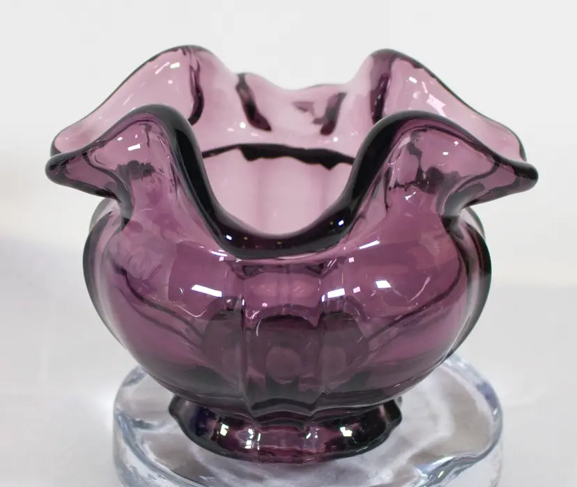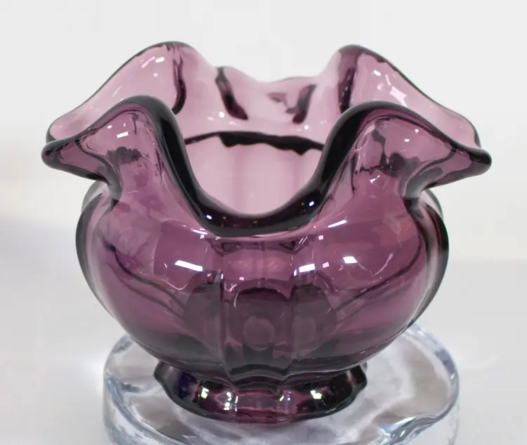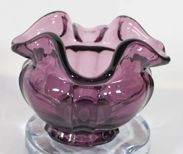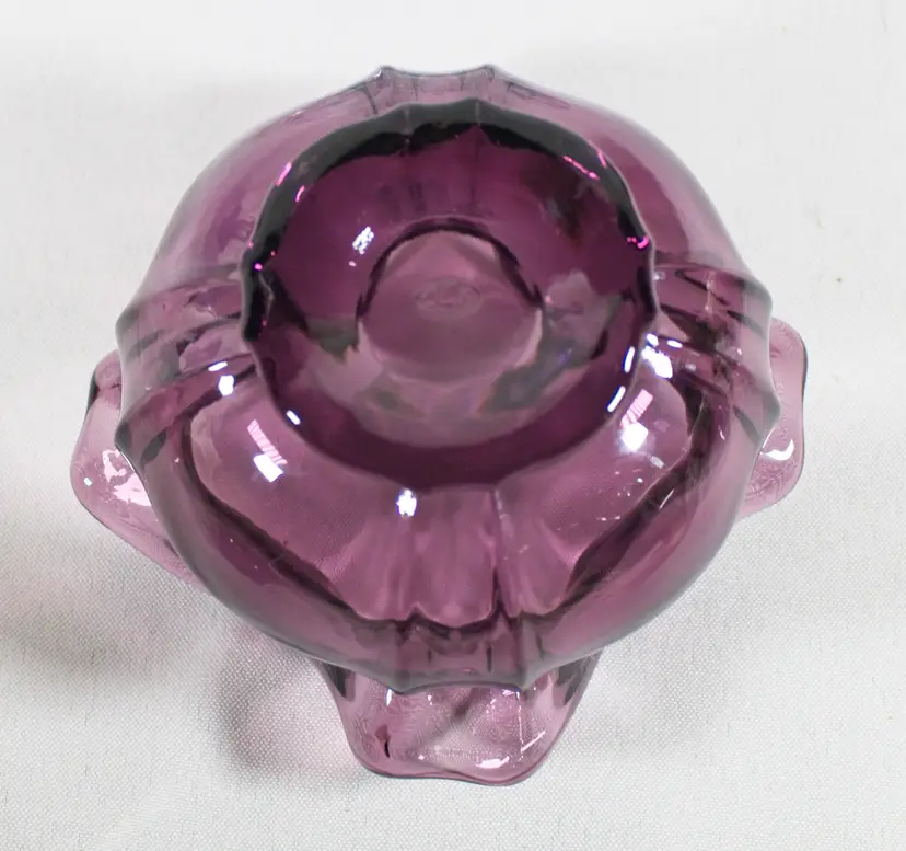VTG Fenton Dark Amethyst Purple Rose Bowl Ruffled Edge 3.5". In good condition. Embossed bottom stamp. 4.5" wide x 3.5" tall