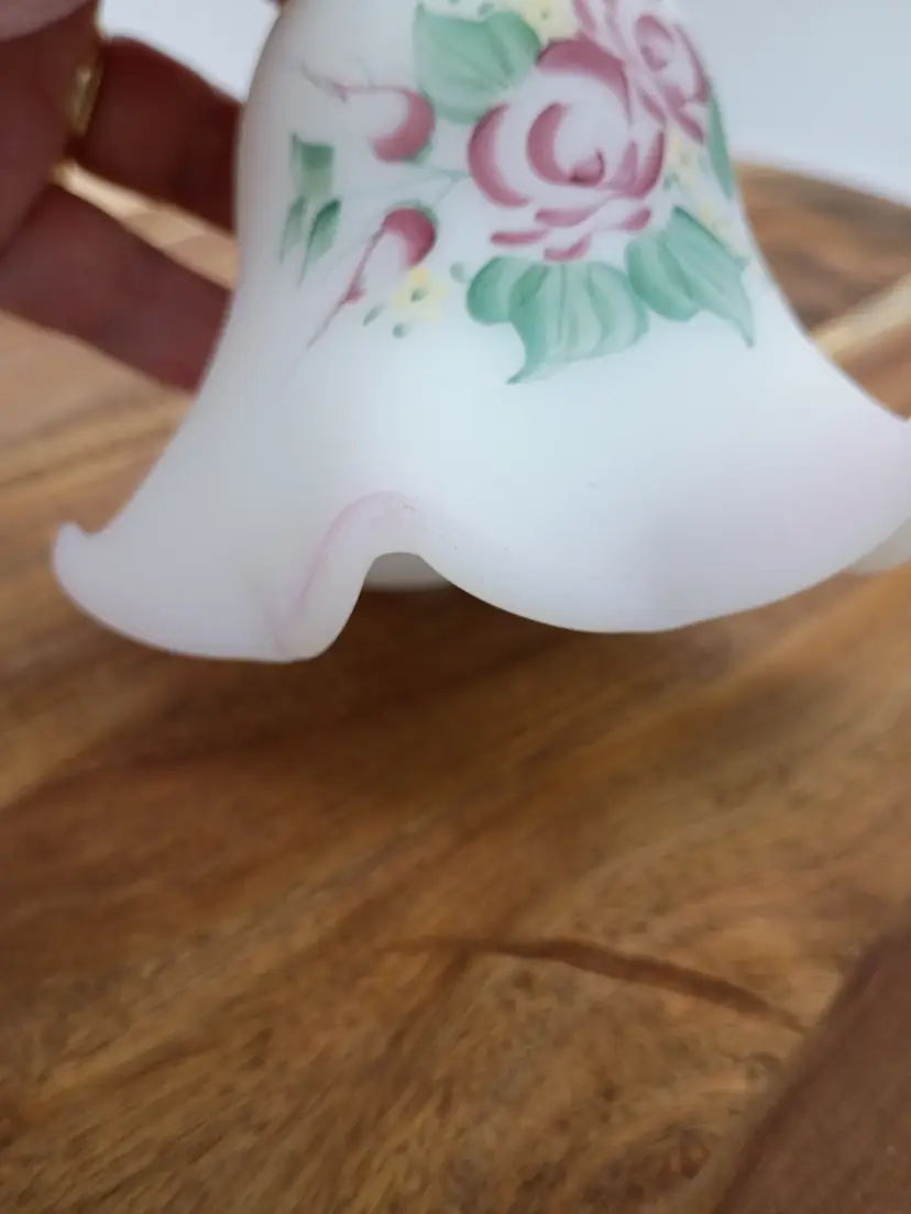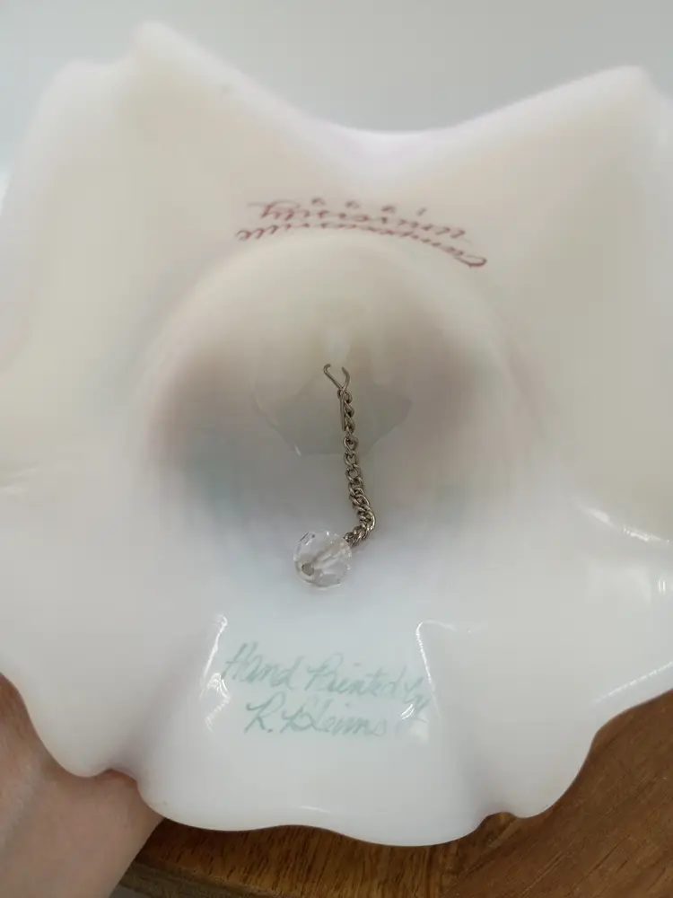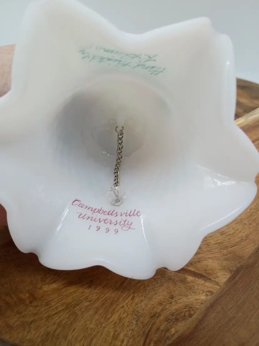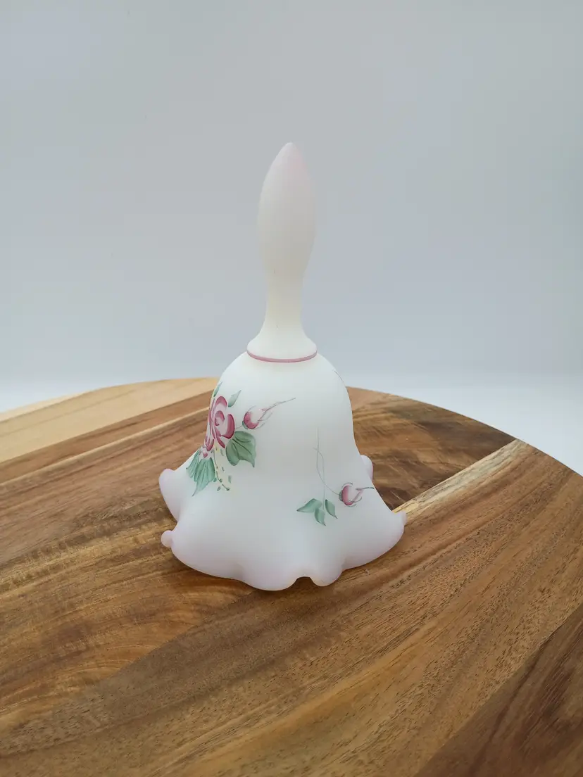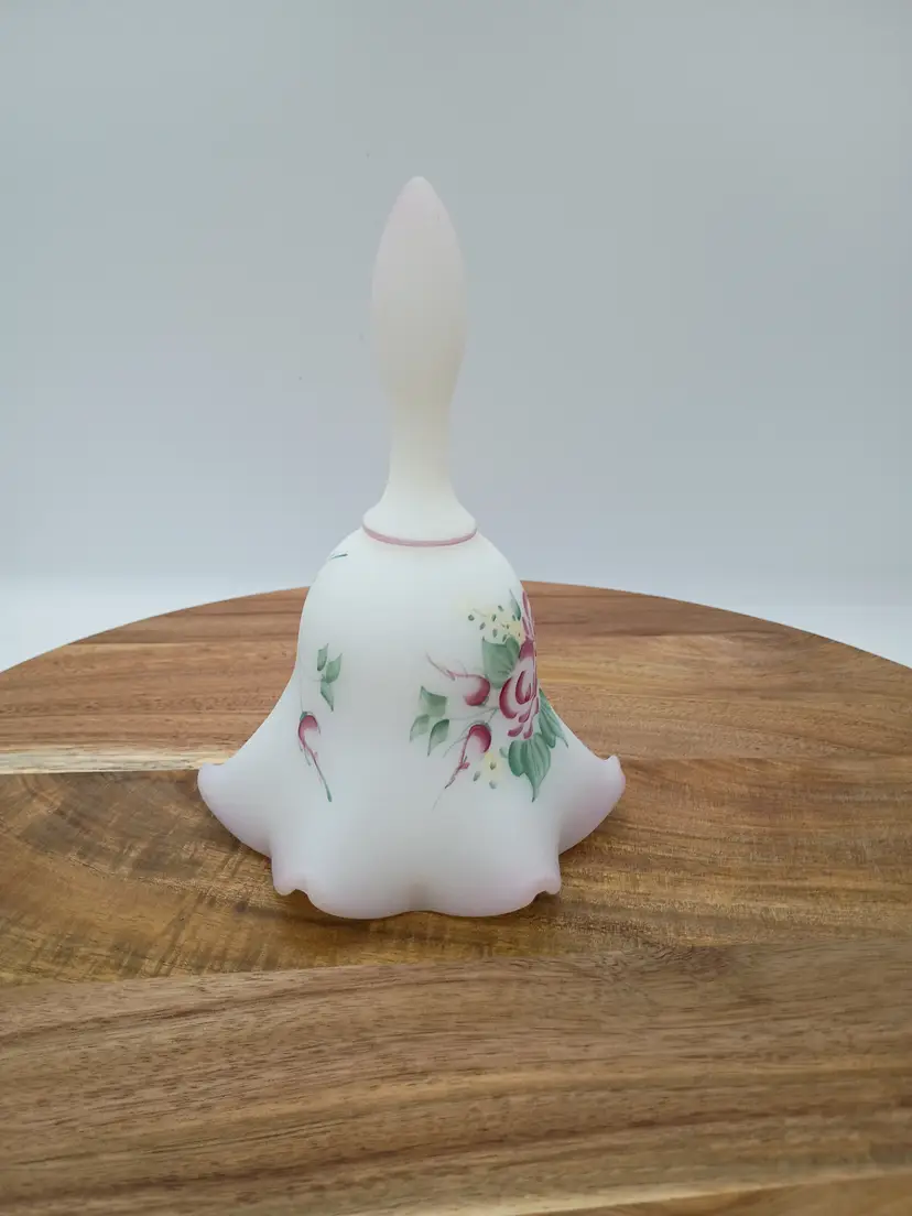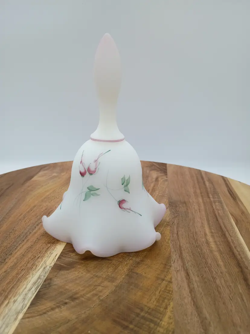 Vtg Fenton Fluted Satin Hand Painted Bell Campbellsville University 1999 Signed R Blevins signature is often mistakenly interpretyed as Bleims but according to Fenton Decorator list it is Blevins. This is 6.5 inches tall and 4.5 inches in diameter. The bottom edge of bell features a pale blush pink ombre and fluted edge. Floral design in burgundy pink yellow and green. This is preowned, No chips cracks or flea bites, design is intact. Handpainted and signed by artist. This is part of the Anual Campbellville University Commerative Line. Clacker present. Nice gentle chime sound. Near Mint condition. Ships USPS