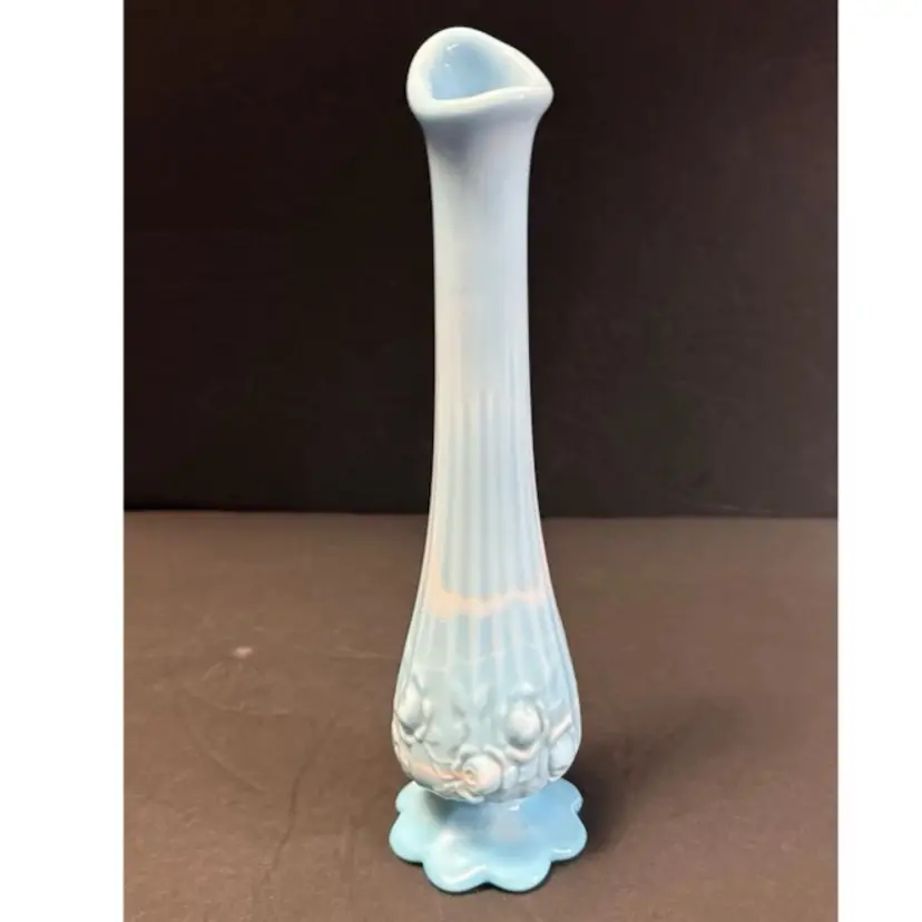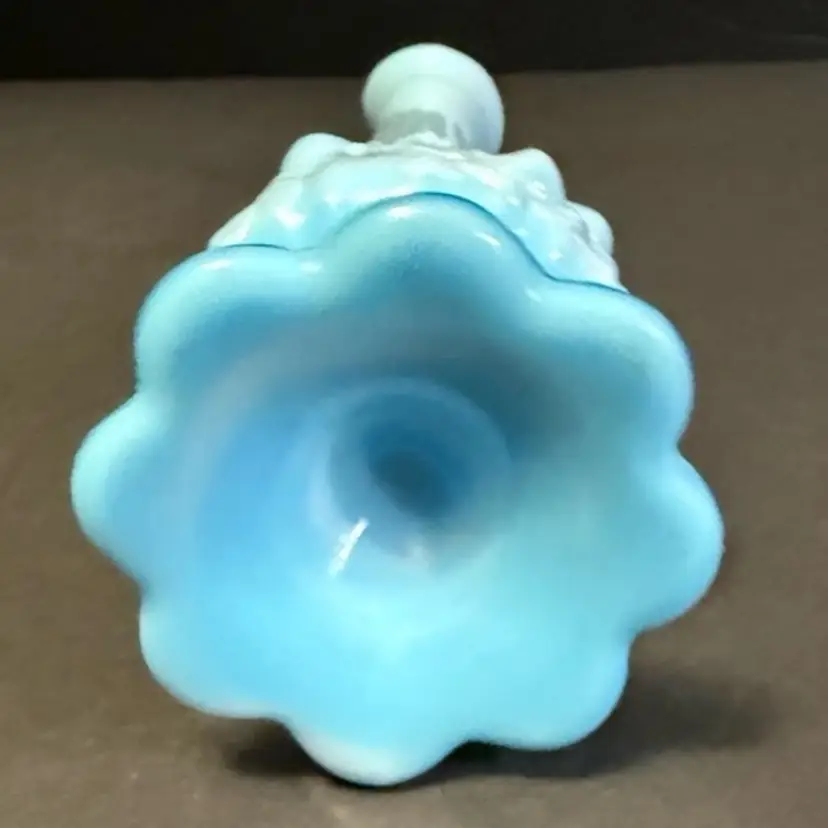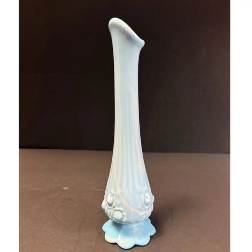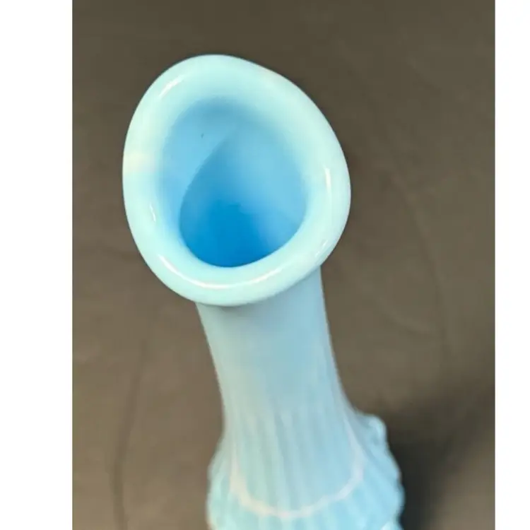 This vintage Fenton slag glass vase features a beautiful blue swirl pattern with a high gloss finish, creating a 3D effect that adds an artistic touch to any room decor. Handcrafted in the United States in the 1970s, this vase stands at 9 inches tall and showcases the unique Cabbage Rose design. Perfect for collectors or those looking to add a pop of color to their home, this decorative piece by Fenton is sure to make a statement with its retro charm and abstract beauty.