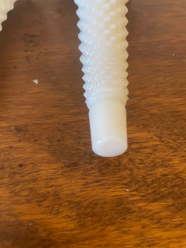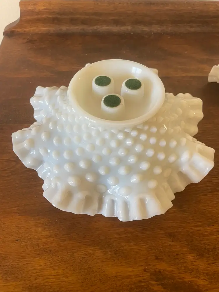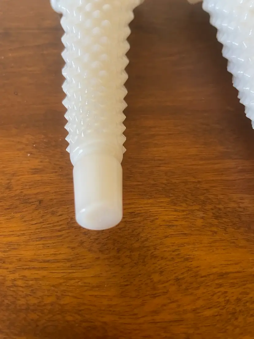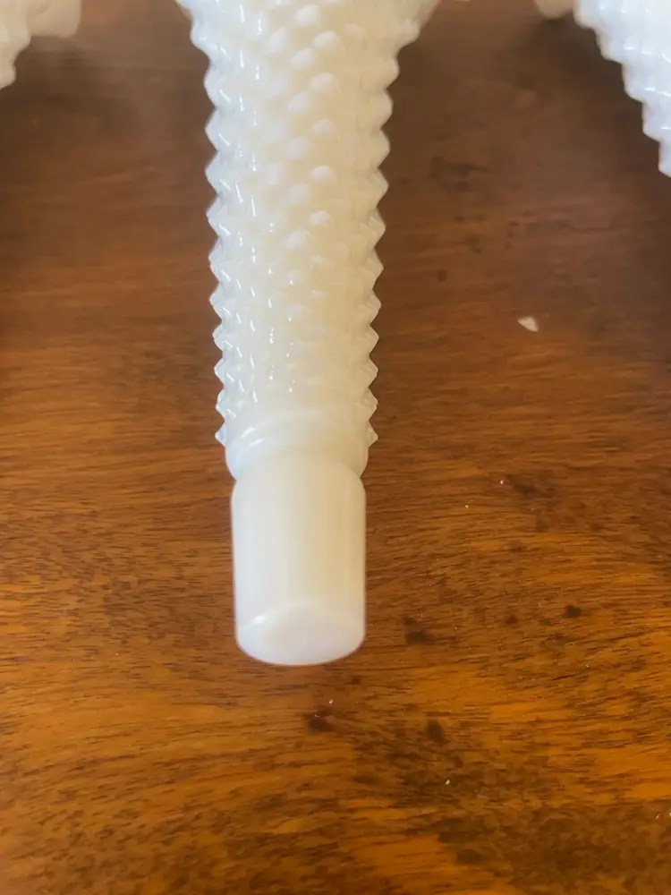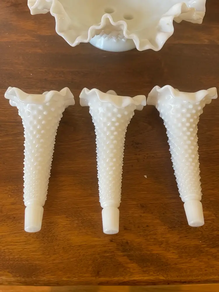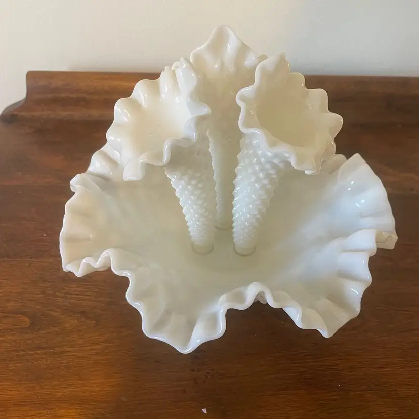 VTG Fenton White Milk Glass Hobnail Epergne Small 3 Trumpet Horn Scalloped Rim. Excellent Condition. See photos.
