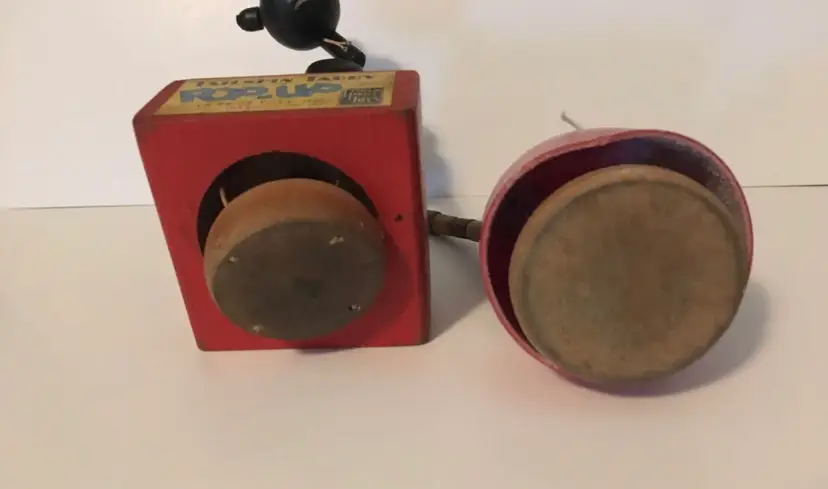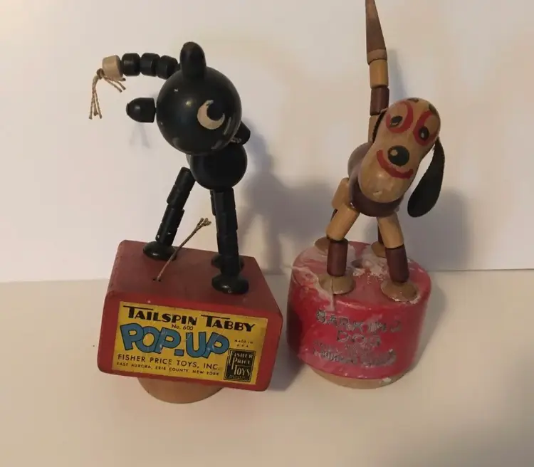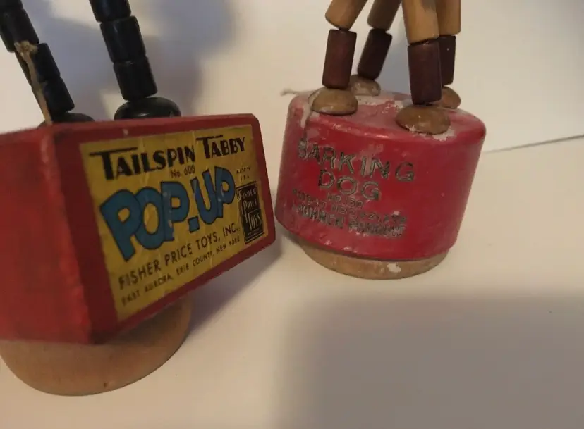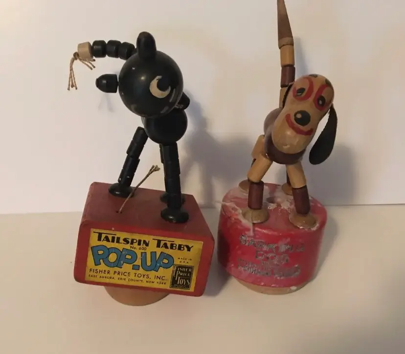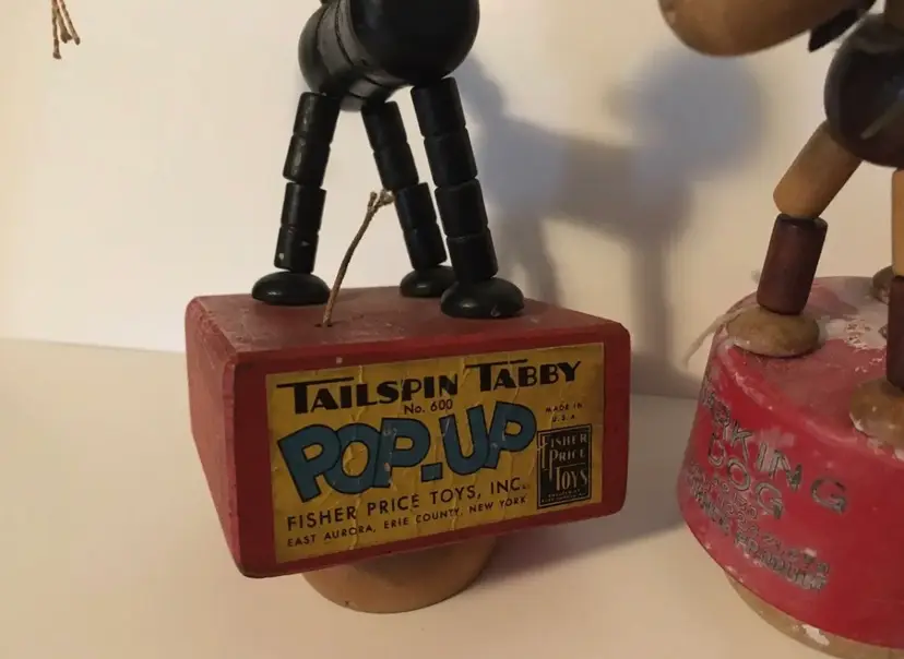 The cat is fisher price from 1947. Original label. Missing a leg. The bottom protrudes. Overall wear. Could be restrung by the right person. Would be great for Halloween!