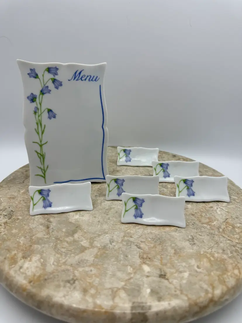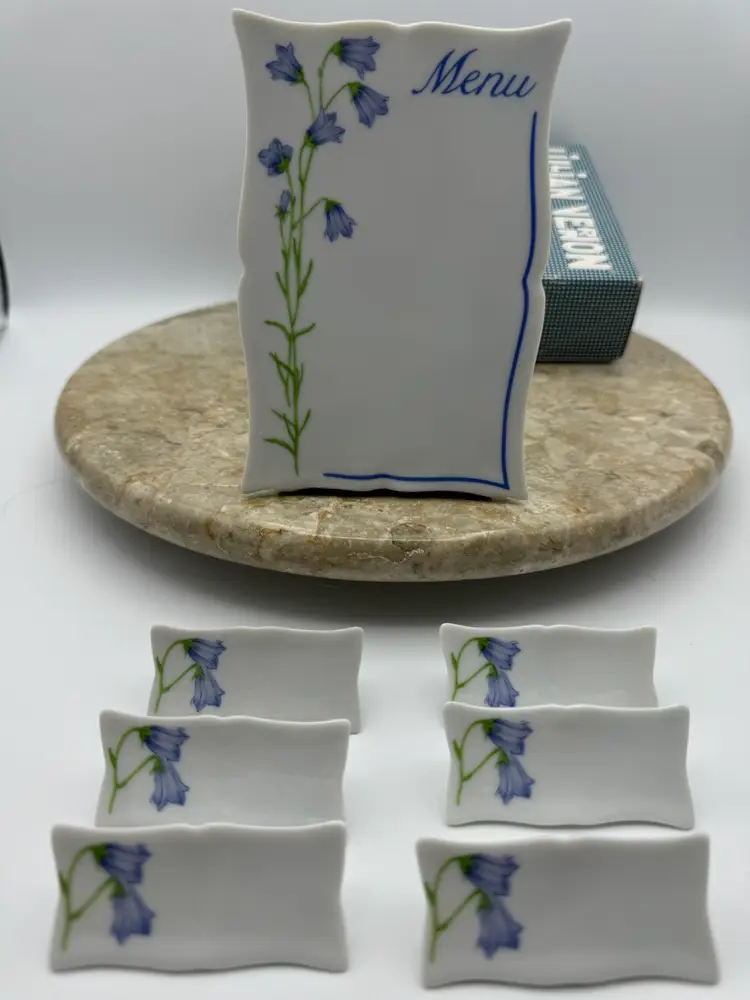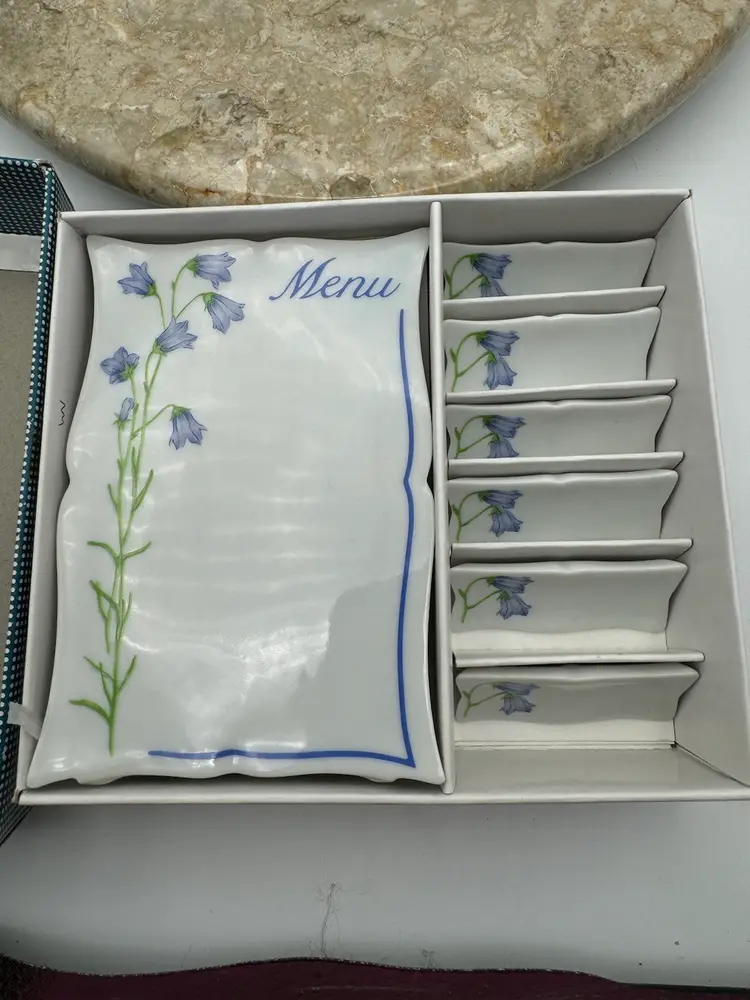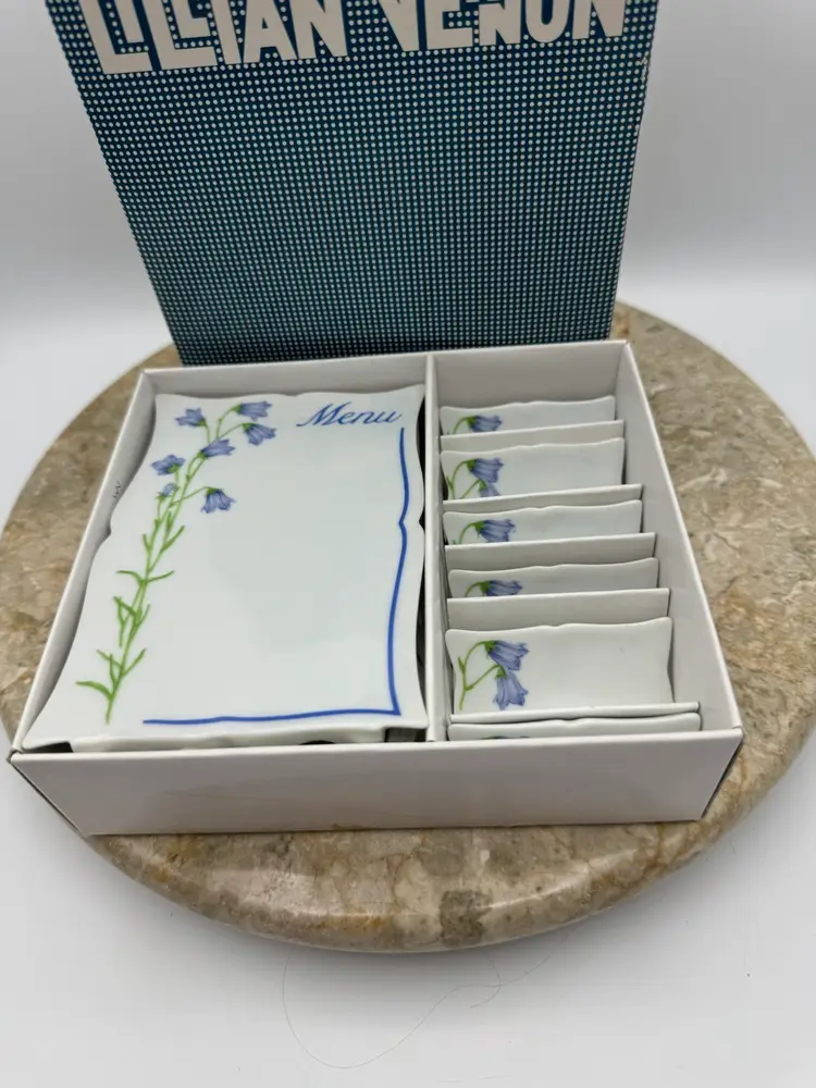 Add a touch of vintage charm to your dining table with this beautiful set of 6 placecards and 1 menu board from Lillian Vernon. The delicate floral porcelain design is perfect for any occasion and is sure to impress your guests. Made in Japan, these collectible dinnerware pieces are a must-have addition to your kitchen and home decor. The set is ideal for those who appreciate the beauty of vintage items. Comes in original box. Not sure if it was ever used. Still has made in Japan stickers on the back. Beautiful condition. No chips or cracks. Measures Box 6 1/2" X 6" X 2” Menu 5 1/2" 3 3/4" Place Card 2 1/2" X 1 1/2"