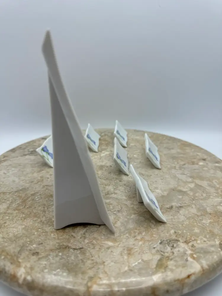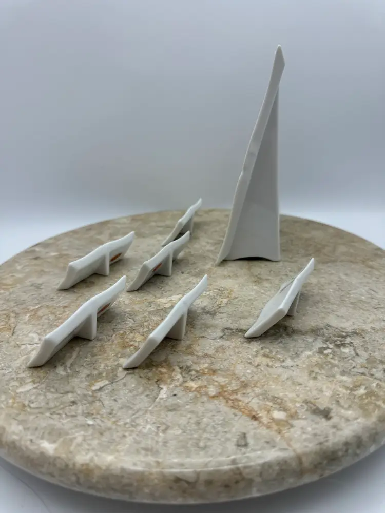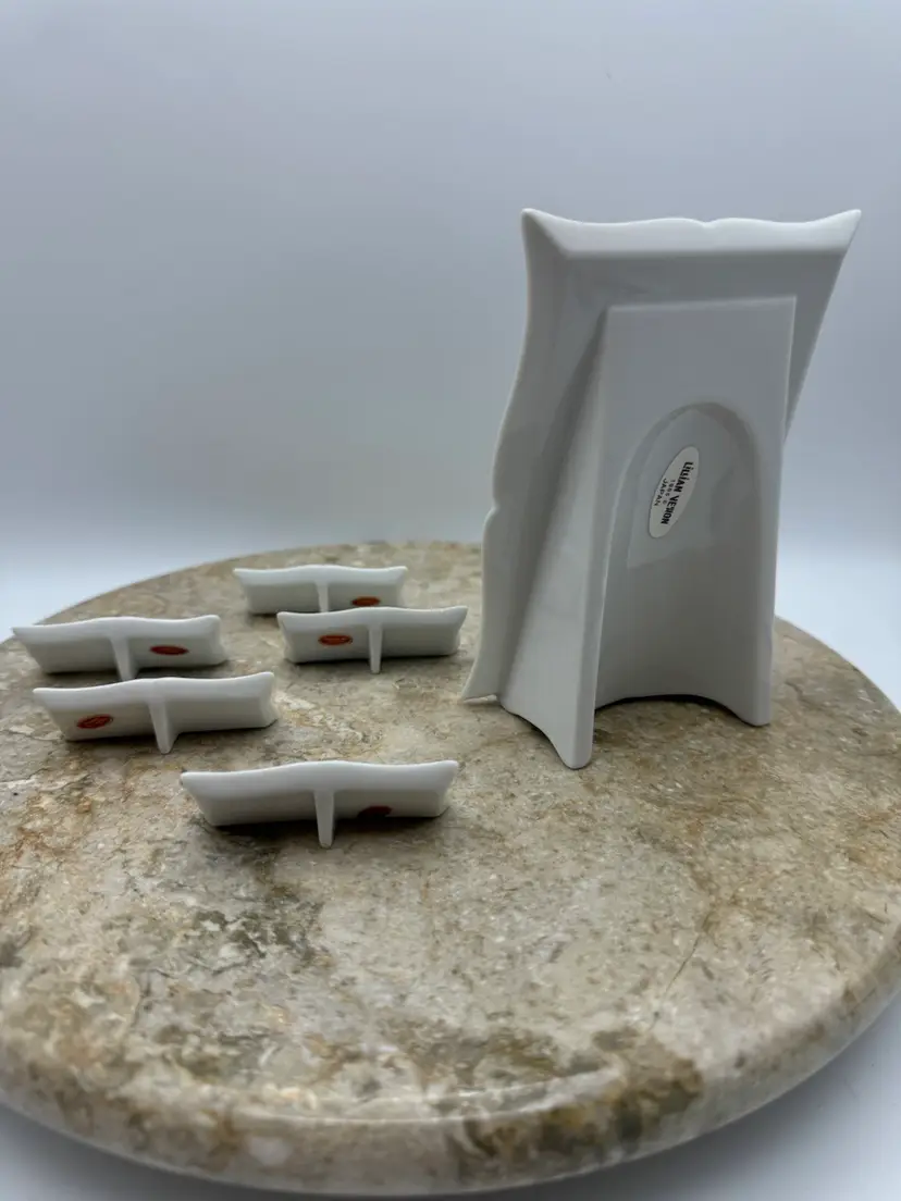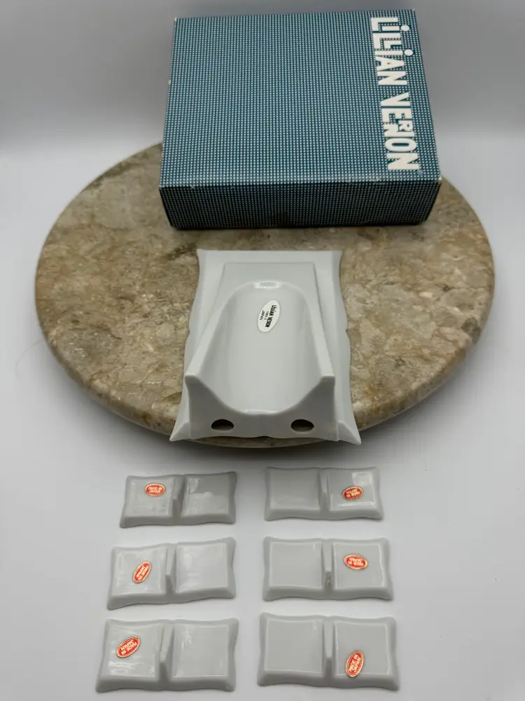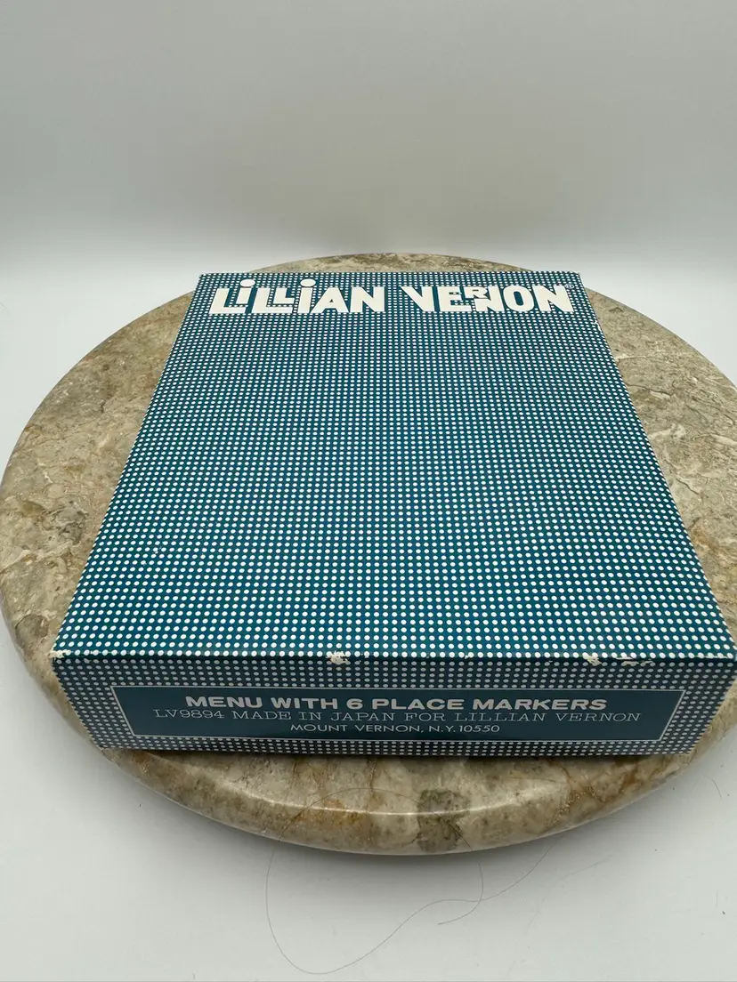 Add a touch of vintage charm to your dining table with this beautiful set of 6 placecards and 1 menu board from Lillian Vernon. The delicate floral porcelain design is perfect for any occasion and is sure to impress your guests. Made in Japan, these collectible dinnerware pieces are a must-have addition to your kitchen and home decor. The set is ideal for those who appreciate the beauty of vintage items. Comes in original box. Not sure if it was ever used. Still has made in Japan stickers on the back. Beautiful condition. No chips or cracks. Measures Box 6 1/2" X 6" X 2” Menu 5 1/2" 3 3/4" Place Card 2 1/2" X 1 1/2"