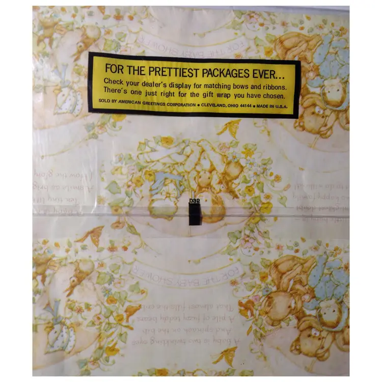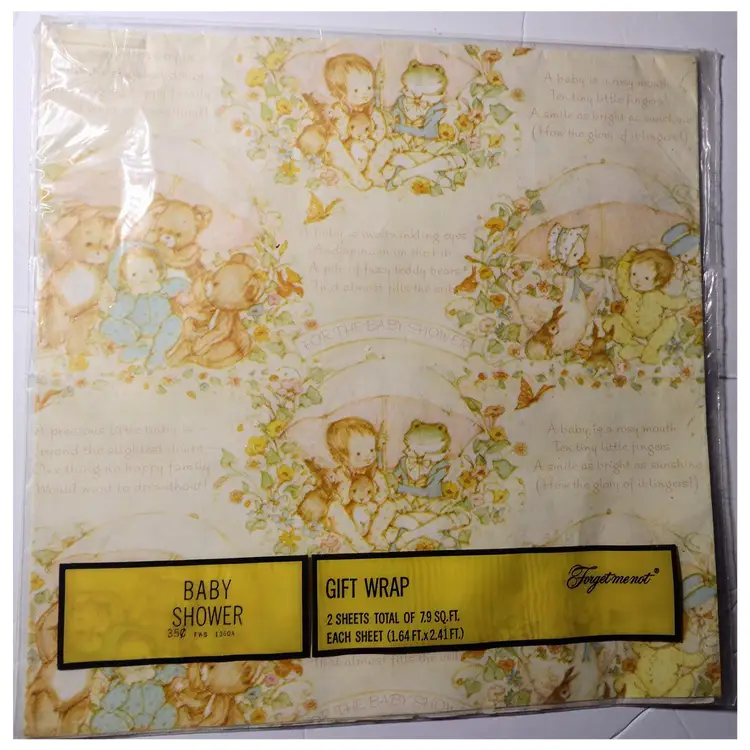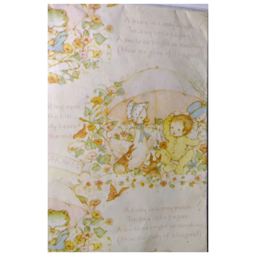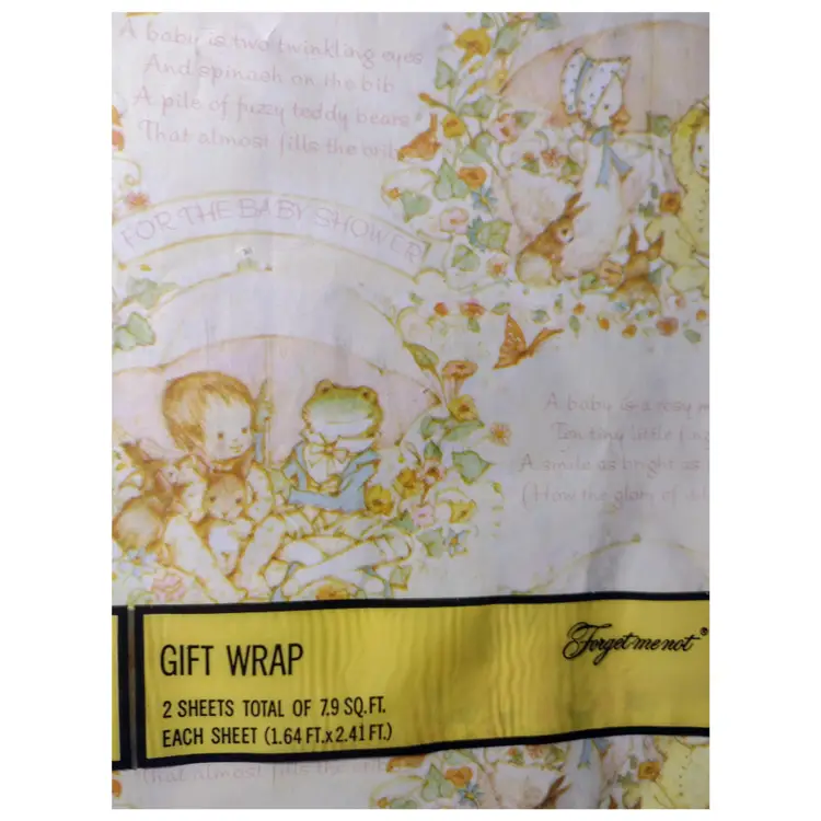 Item is new and sealed and in a smoke free environment. This is adorable vintage baby shower paper with a baby & storybook characters. This is great for crafting as well as wrapping. There are 2 sheets that equal 7.9 square feet.