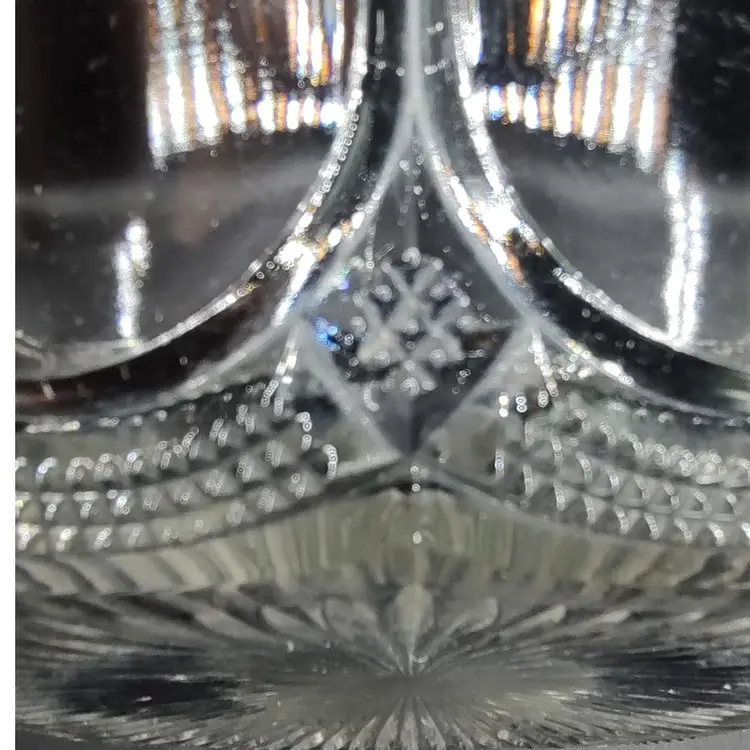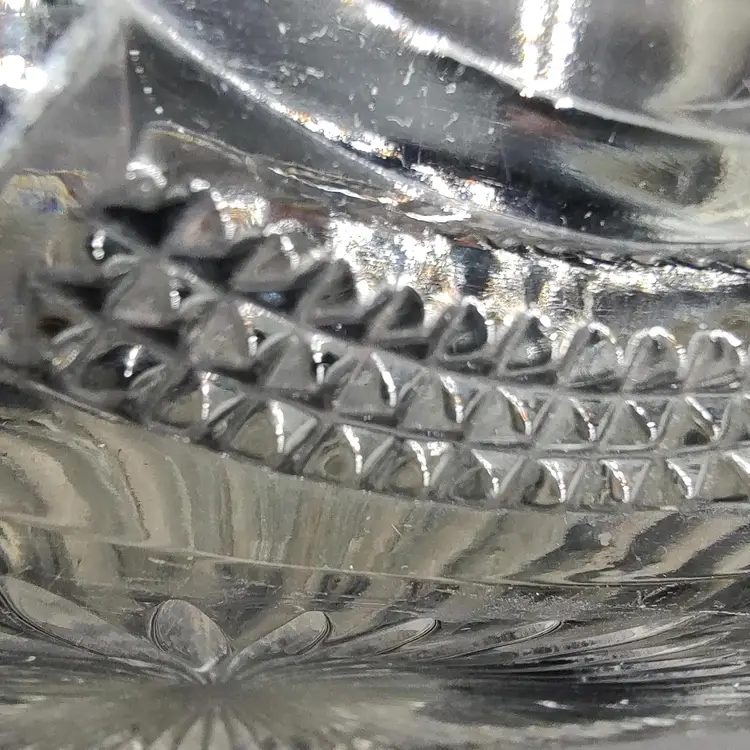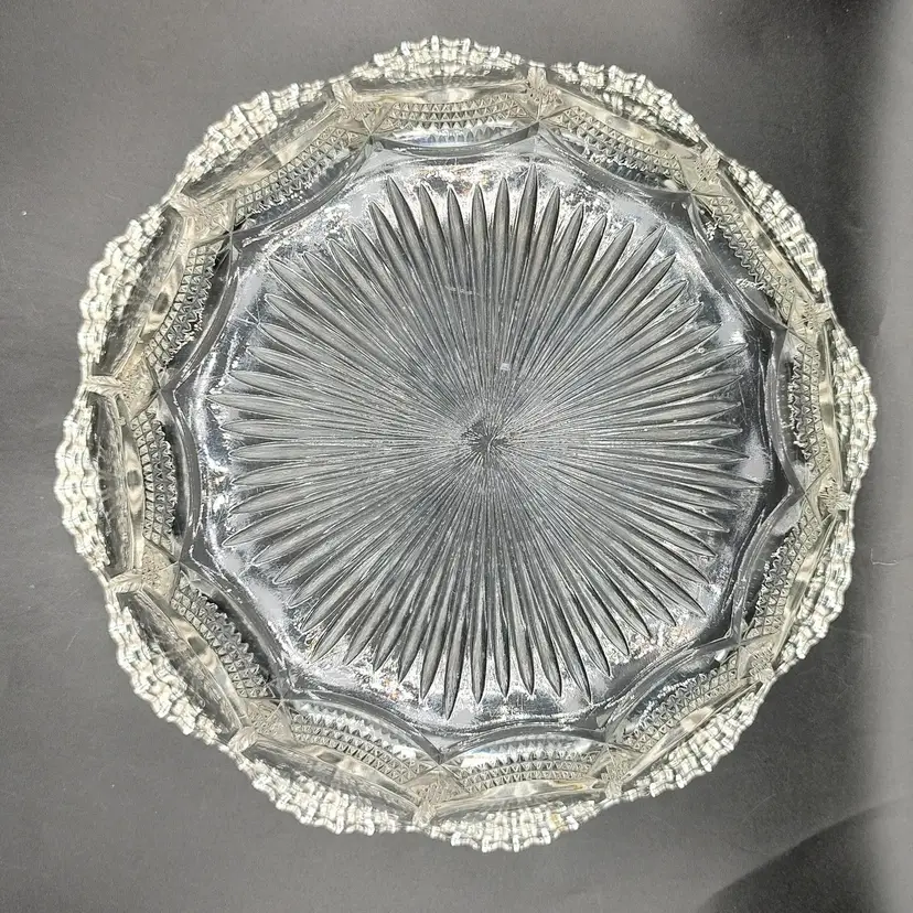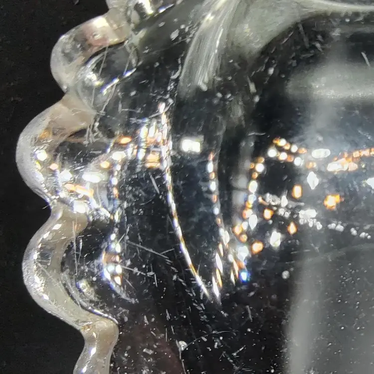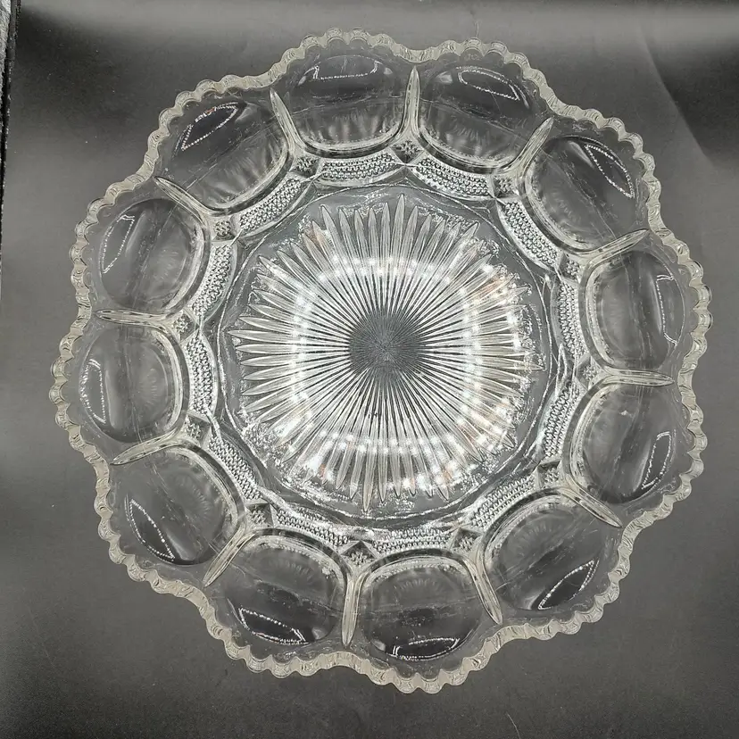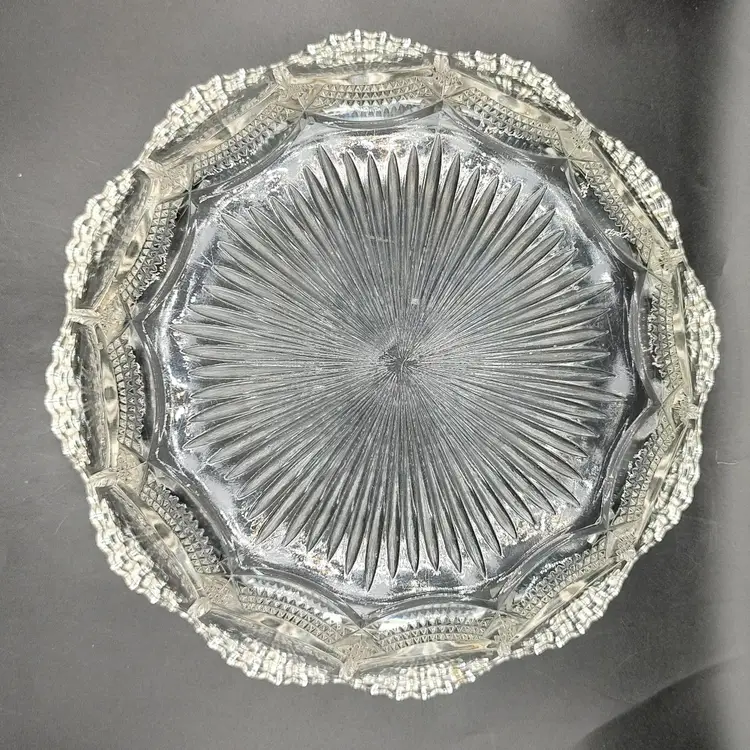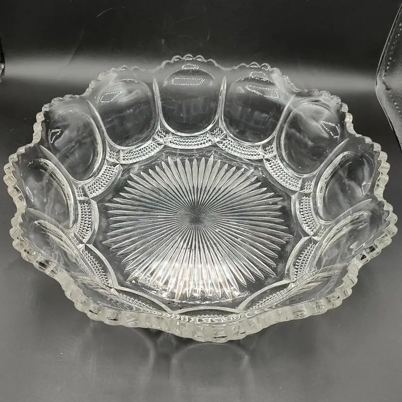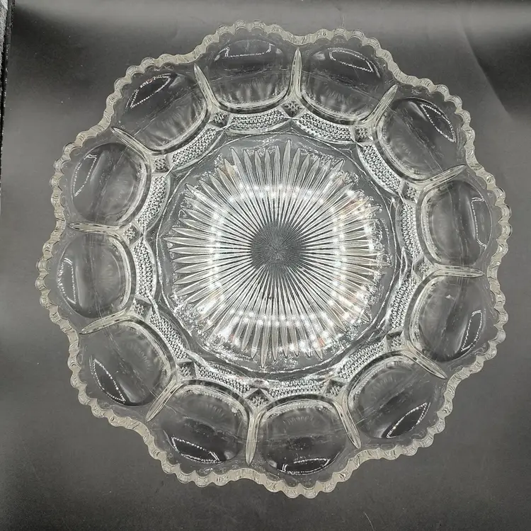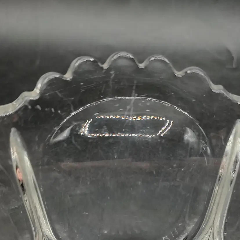 Vintage Fostoria Coin Dot Pattern Clear Glass Scalloped Edge Centerpiece Bowl. Has five chips a ding and scratches. Height 3" x diameter 10.5".