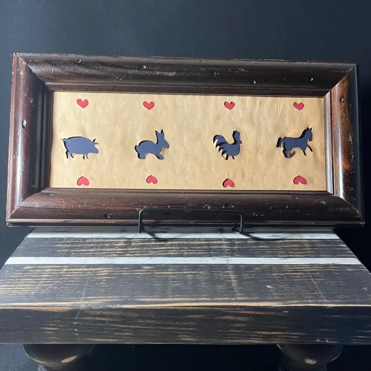 #1026 VTG Framed Folk Art Work Of Farm Animals Cut Out On Old Paper in a rectangle dark wood frame. Measures 13.25” x 6.5”. No Glass.