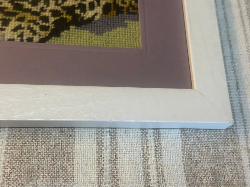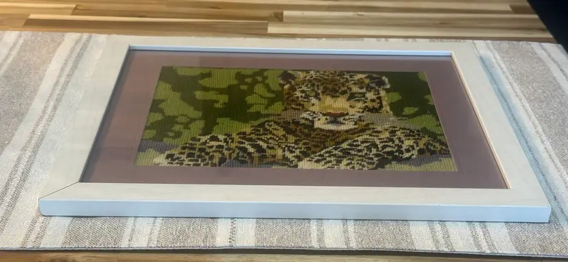 This vintage framed leopard needlepoint piece is a unique and handmade piece of art that will add a touch of elegance to any space. Crafted in the United States, this embroidery showcases intricate needlepoint details of a cheetah cat, making it a striking addition to any safari or animal-themed decor. The frame adds a polished and professional finish to the piece, making it ready to display and appreciate for years to come. Framed and Matted measures 11x16 frame has imperfections.