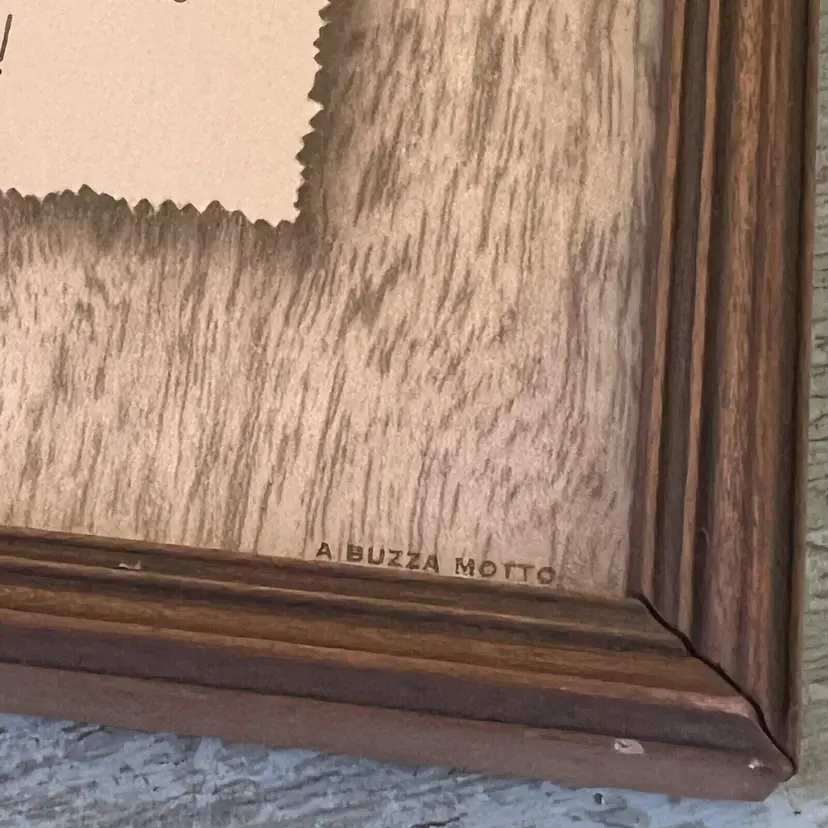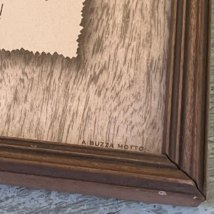 Measures 5.5 x 6.5". Back dust cover is pulling loose. No water marks or other damage to print. Frame is wood. Has hanger and glass. Made in the USA.
