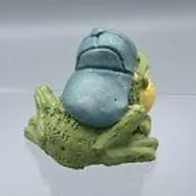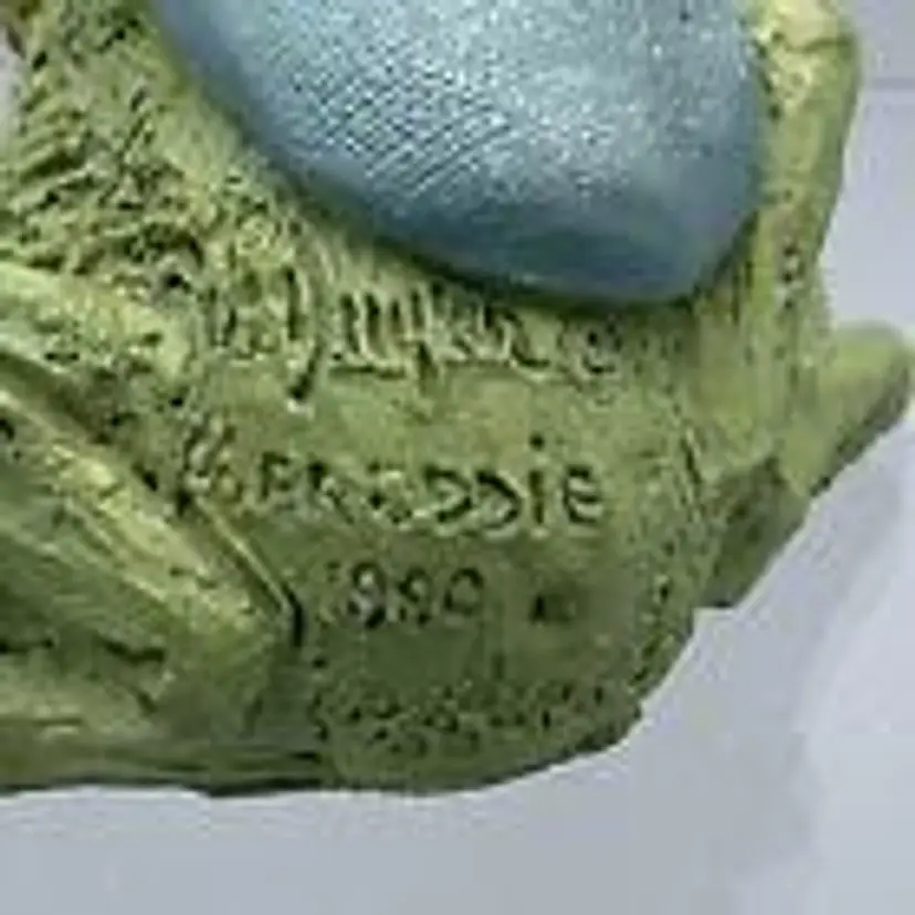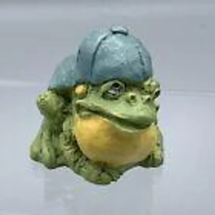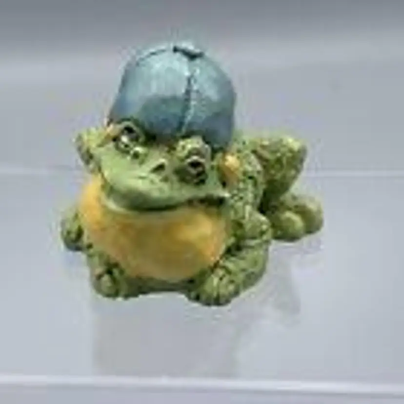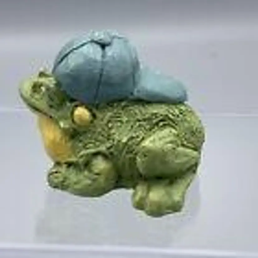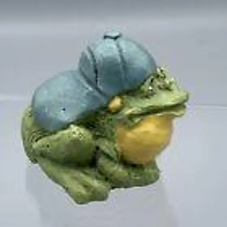 This figurine is a Frumps piece 1990 Freddie the Baseball Cap Wearing frog. It is a rare piece and is in very good condition. It was made by D & D studios, Inc. of Mansfield Texas. The frog looks great with blue eyes and light green skin. A pleasant collectible piece and for display.